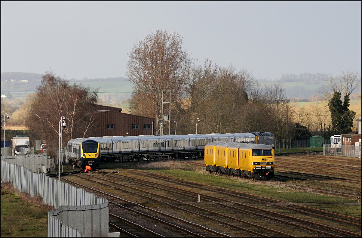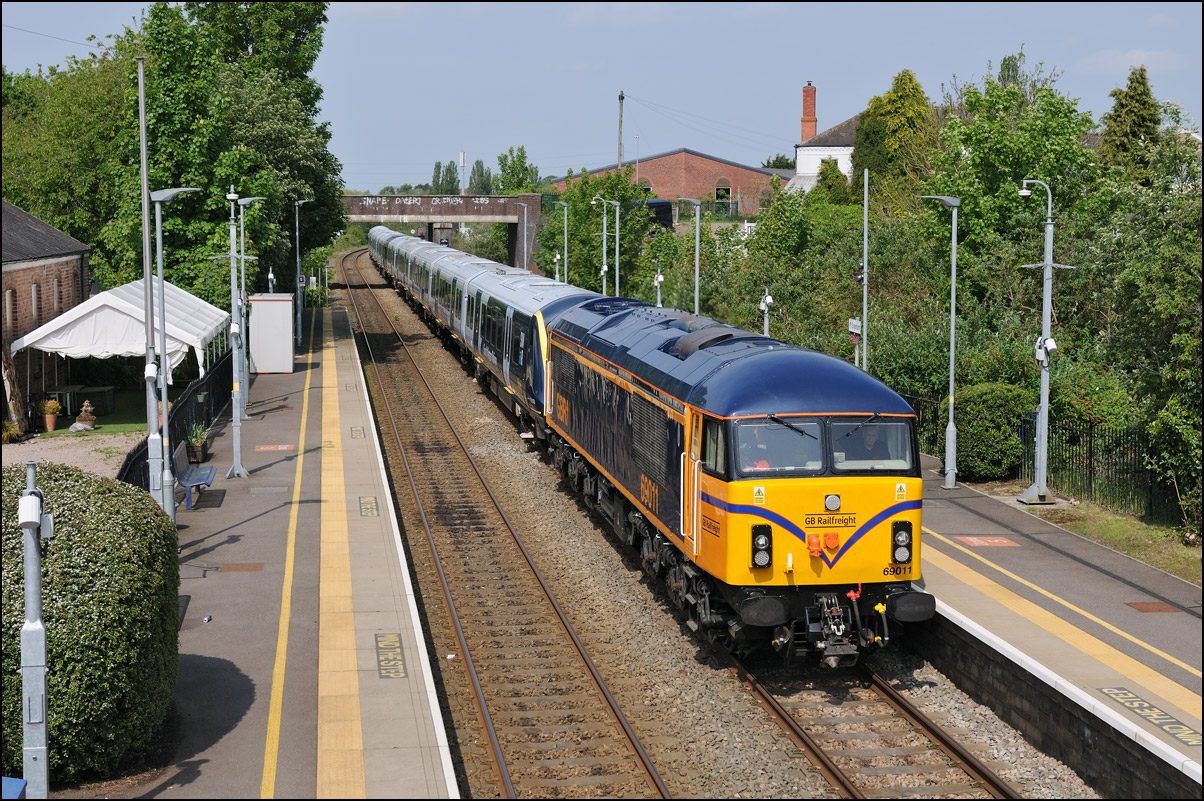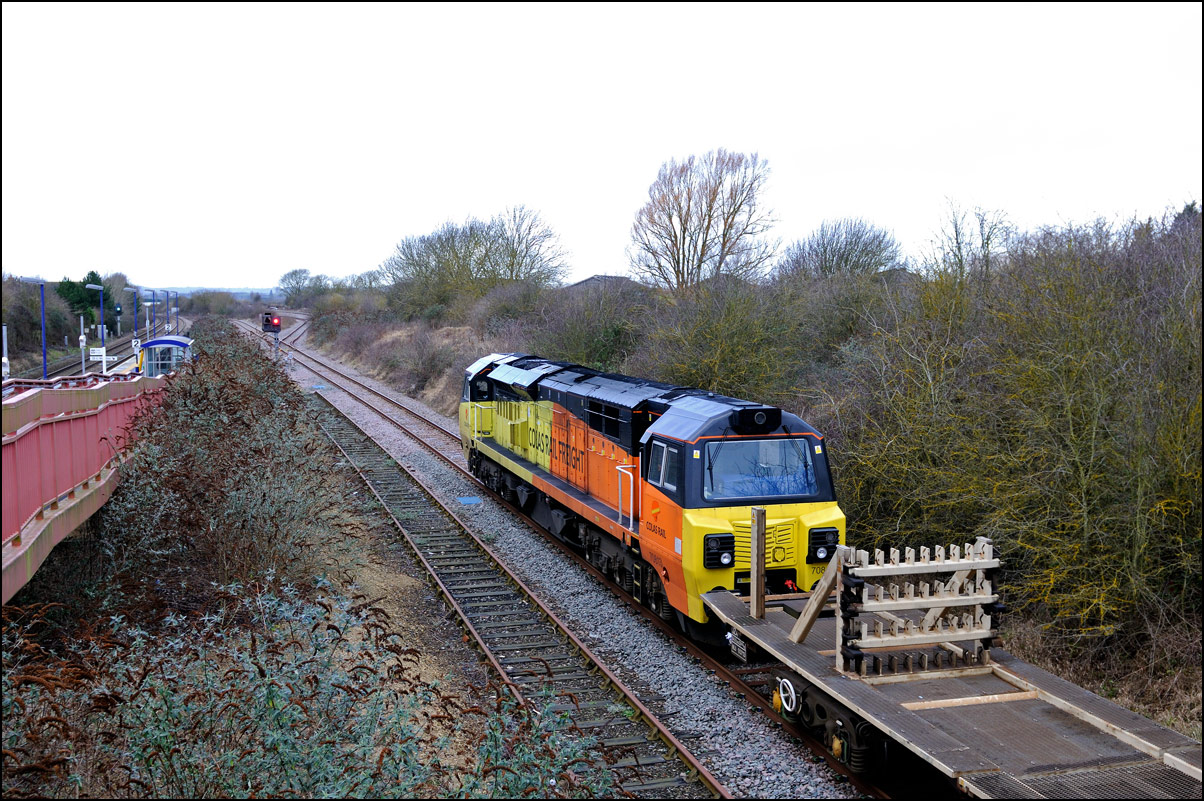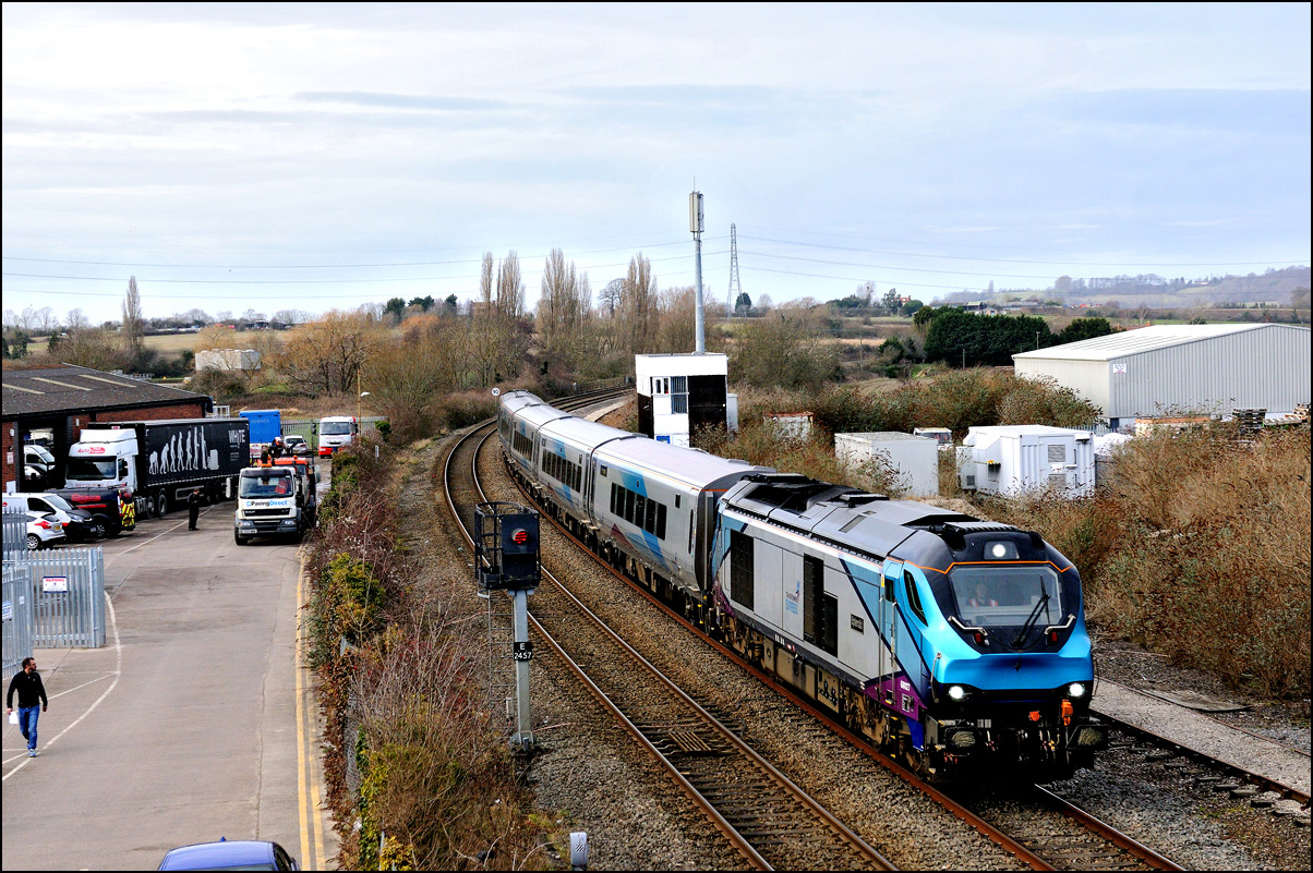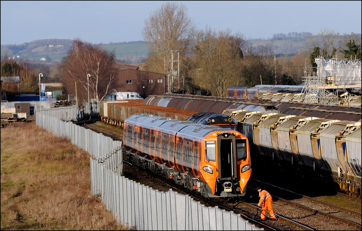 This was the photograph that was my primary target on 4 March 2025 with GBRf's 69012 looking terrific in a colour scheme reminiscent of the livery carried by Falcon, the prototype diesel locomotive. The train is 5Q91 from Long Marston to Wimbledon Park Sidings taking 701002 out of storage and hopefully into service befoe too long. As is sometimes the case with these stock moves the run-round procedure at Worcester didn't go smoothly and my assumption is that there was an issue with brakes on the unit that led to the 45 minute delay in its departure. Fortunately it did run unlike on at least one previous occasion when it was cancelled until the following day. |