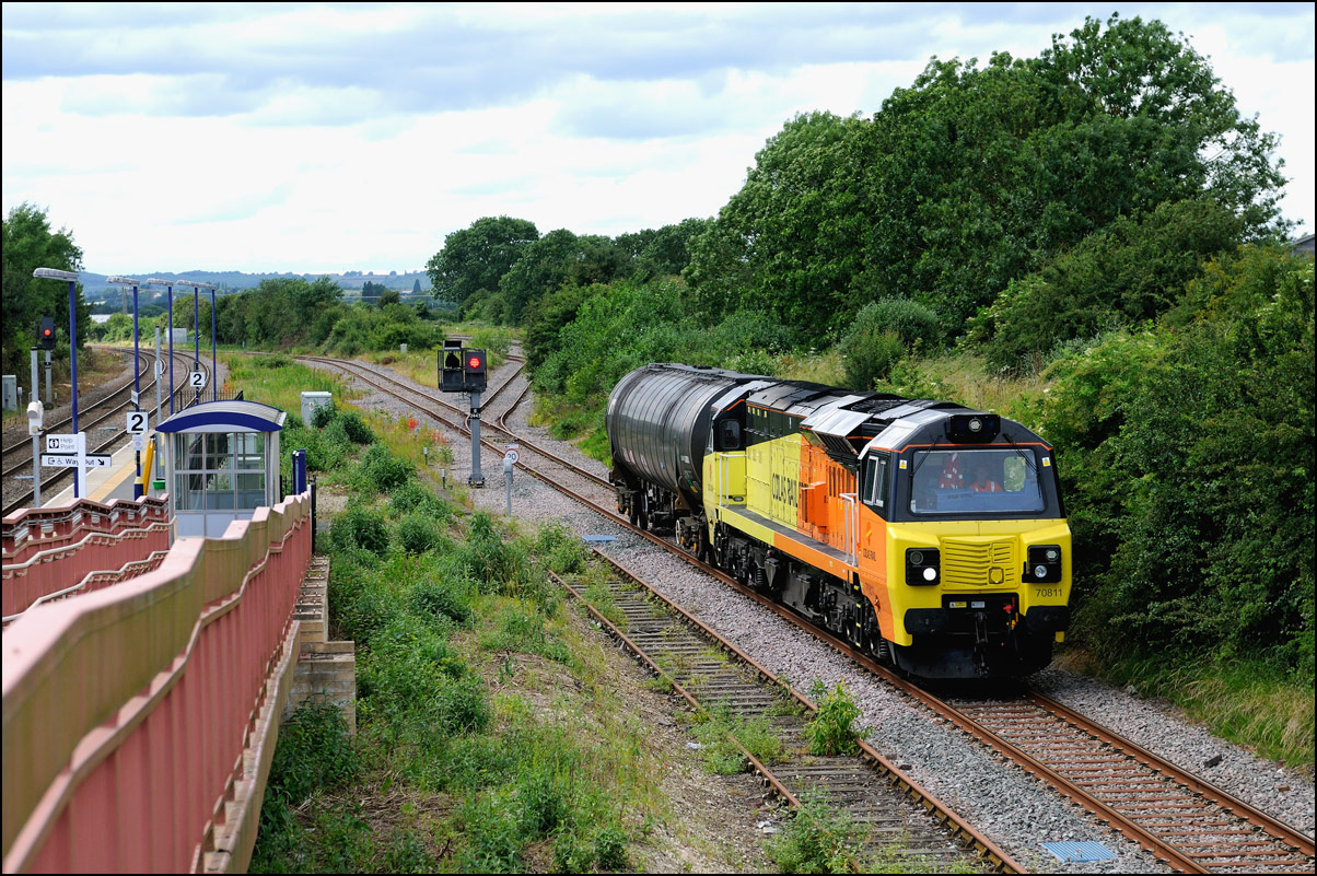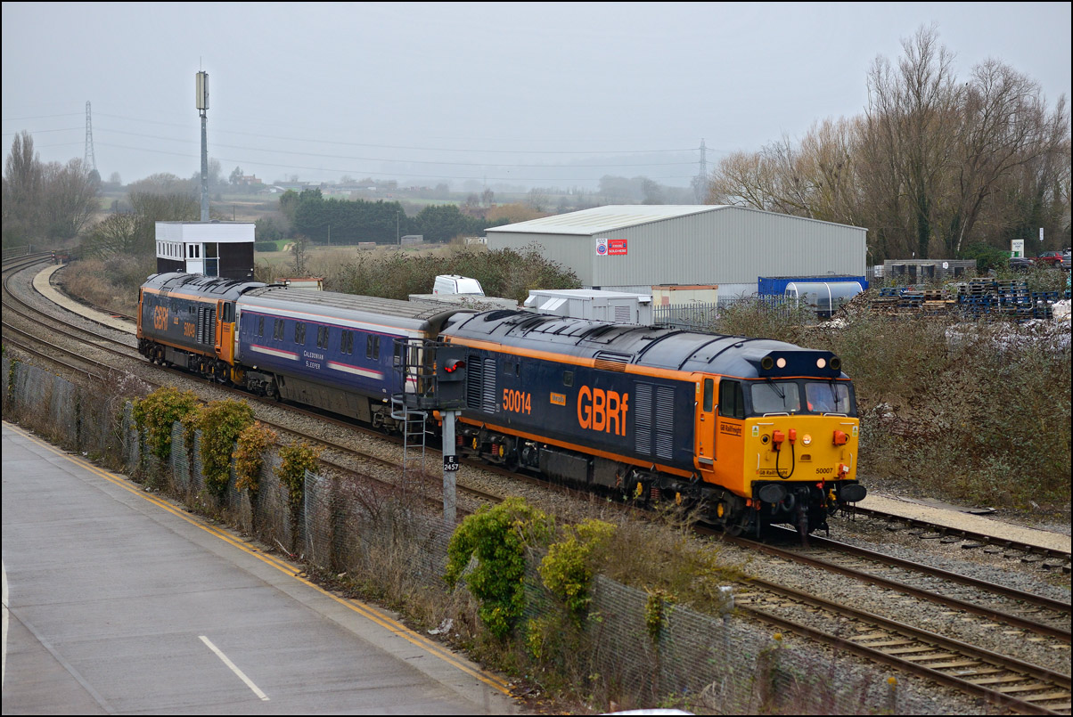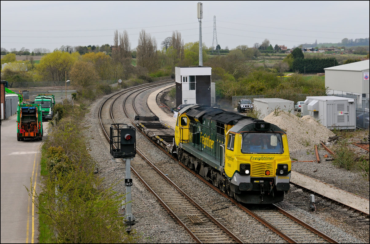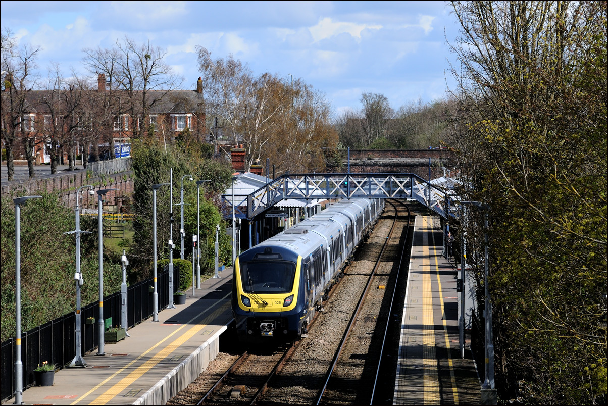 This was the photograph that was my primary target on 4 March 2025 with GBRf's 69012 looking terrific in a colour scheme reminiscent of the livery carried by Falcon, the prototype diesel locomotive. The train is 5Q91 from Long Marston to Wimbledon Park Sidings taking 701002 out of storage and hopefully into service befoe too long. As is sometimes the case with these stock moves the run-round procedure at Worcester didn't go smoothly and my assumption is that there was an issue with brakes on the unit that led to the 45 minute delay in its departure. Fortunately it did run unlike on at least one previous occasion when it was cancelled until the following day. |
