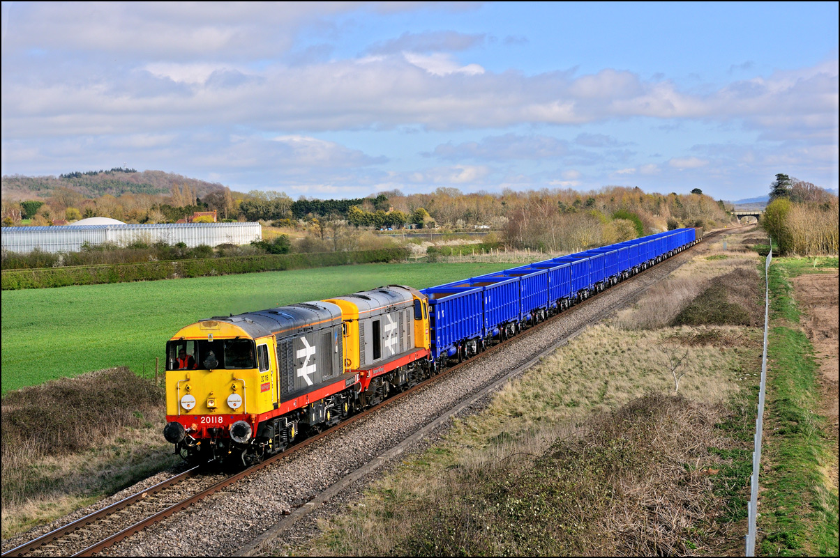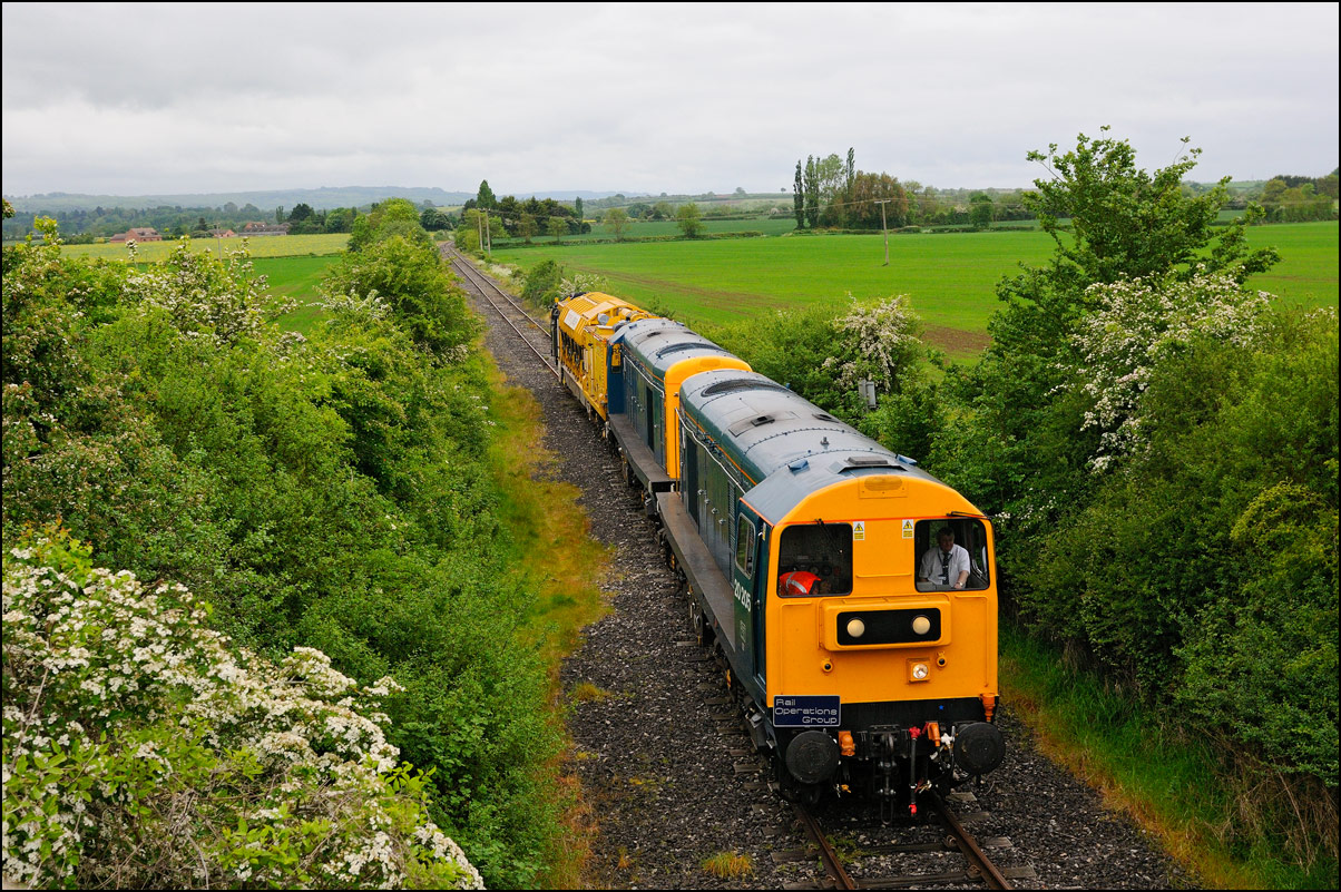 After runnning-round at Worcester, 5Z22 headed up the Cotswold line to Honeybourne, where the branch to Long Marston was taken. The pair of newly repainted class 20s is seen here approaching the yard in dappled sunshine. |