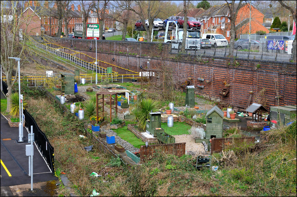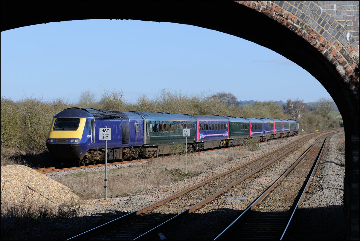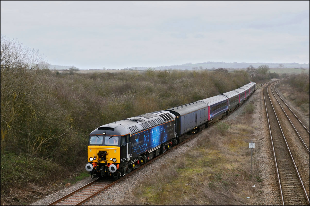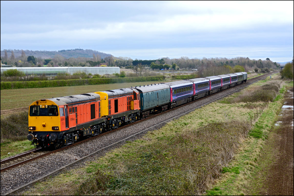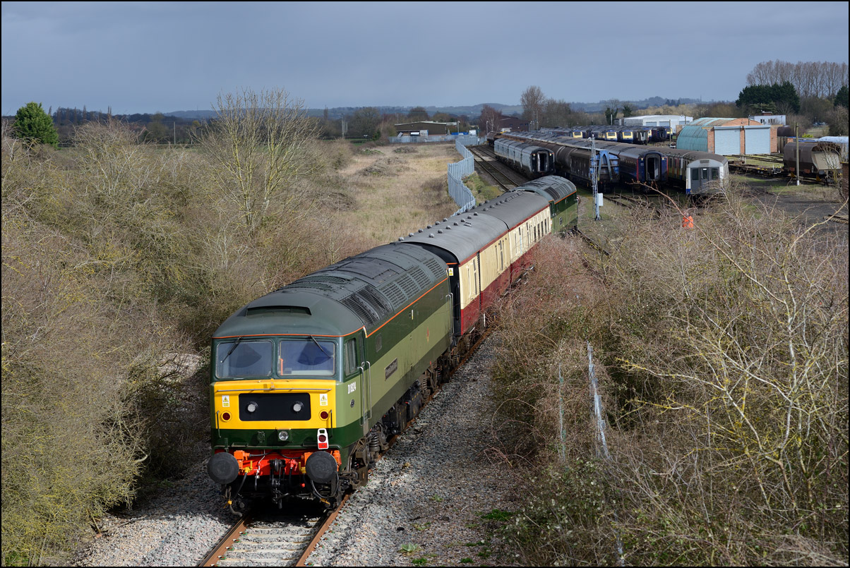 It's not every day you can get to see a triple-header with 2 HST power cars and a class 20 but on 16 February 2024 that's exactly what what was on the front of 6Z79 from Long Marston to Wembley. The power cars were taking a load of barrier/brake force wagons away after delivering 3 class 777 units for storage. The severe backlighting and unchecked undergrowth didn't help matters but there was no way that I was going to ignore such an unusual working. As soon as the bushes and shrubs come into leaf within a few weeks this shot will disappear unless Network Rail decide to do some clearance work but the chances of that happening are around zero. Or less. |