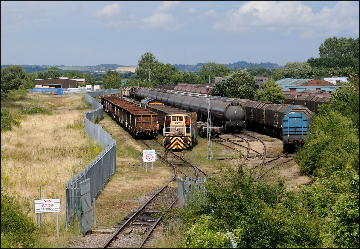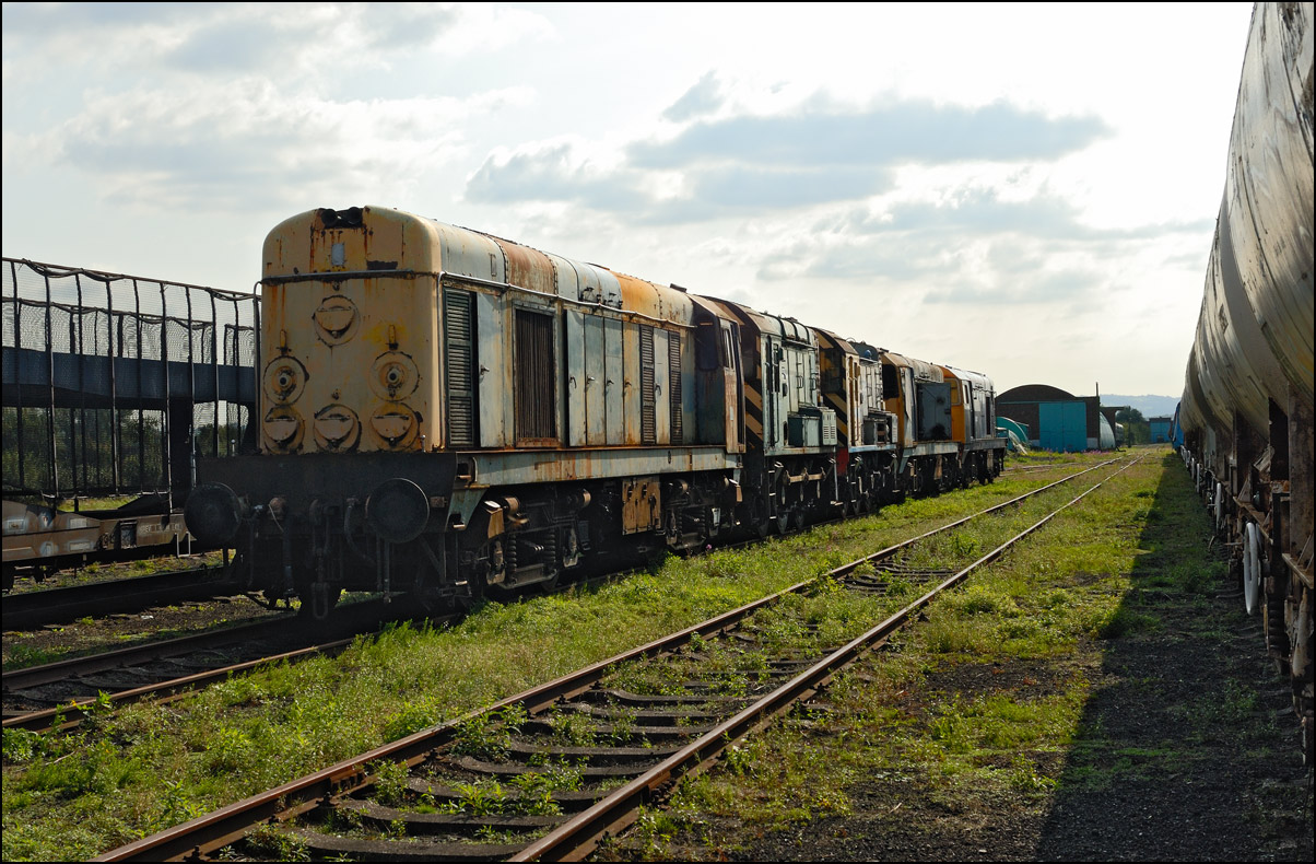 I quite liked the view from the other end of the line of class 20s and 08s as they stood alongside some cartics and ICI chemical tanks on 16 September 2006. I think that all this stock arrived by road being considered unfit to travel by rail; a great shame from the railway photographers's viewpoint. |