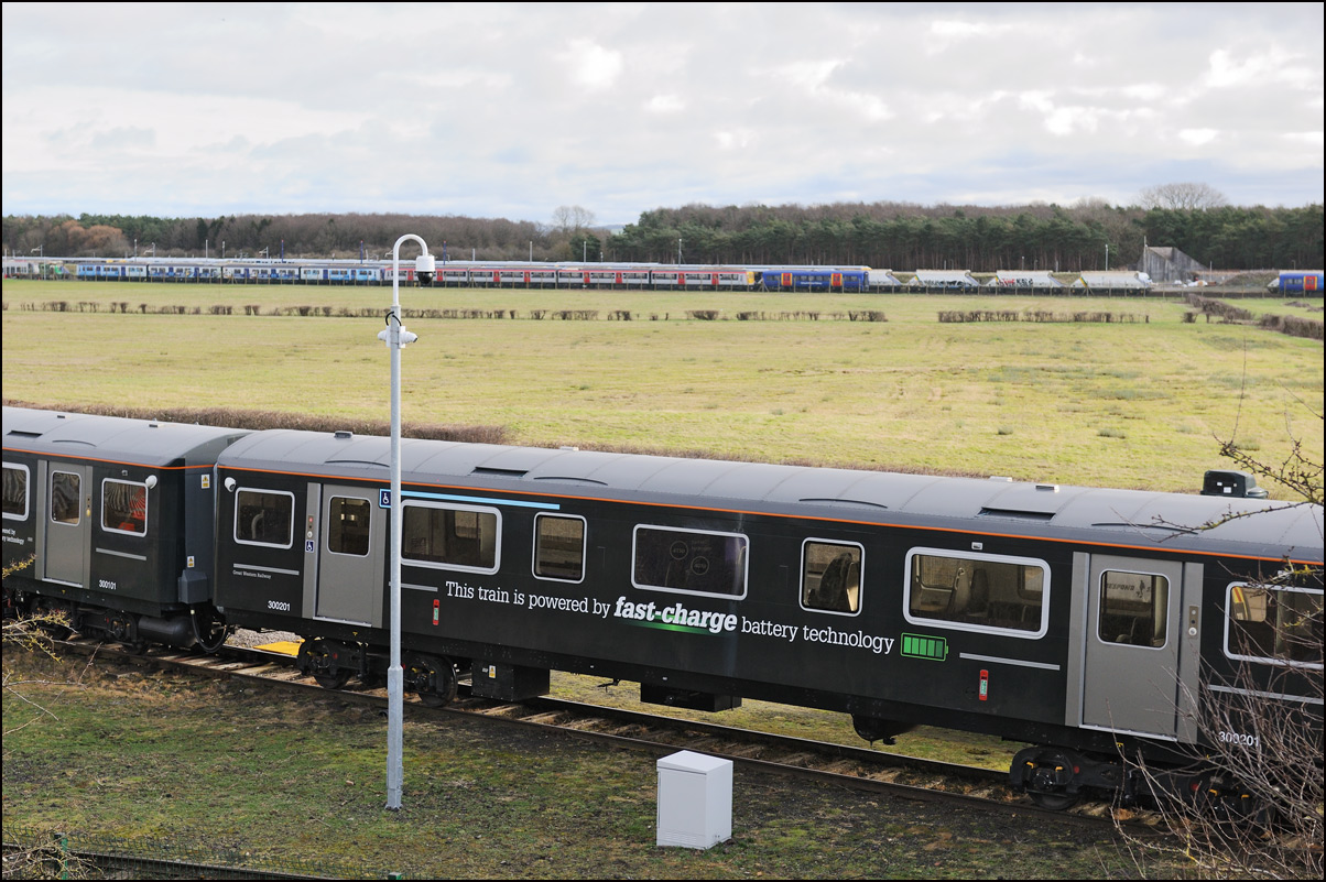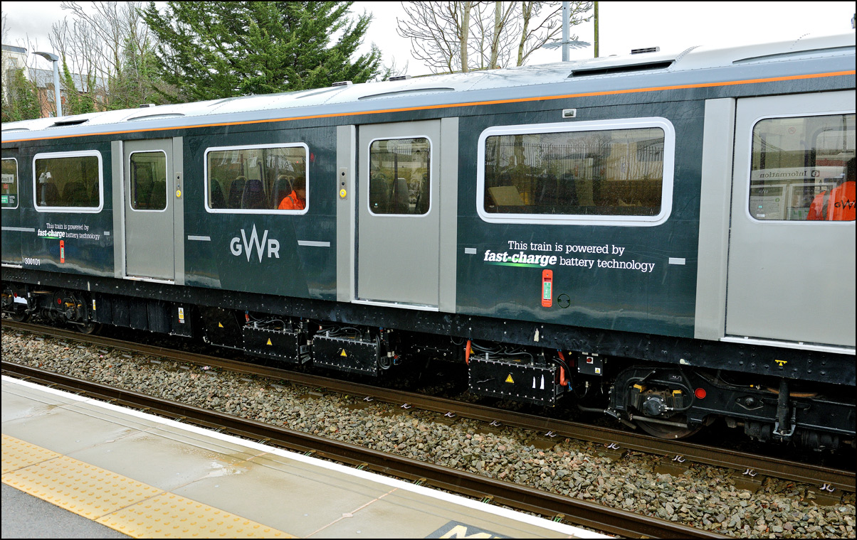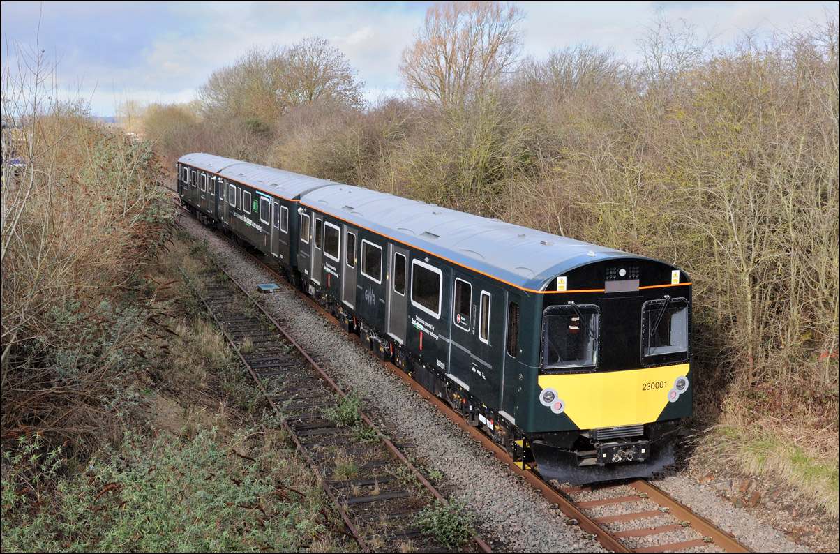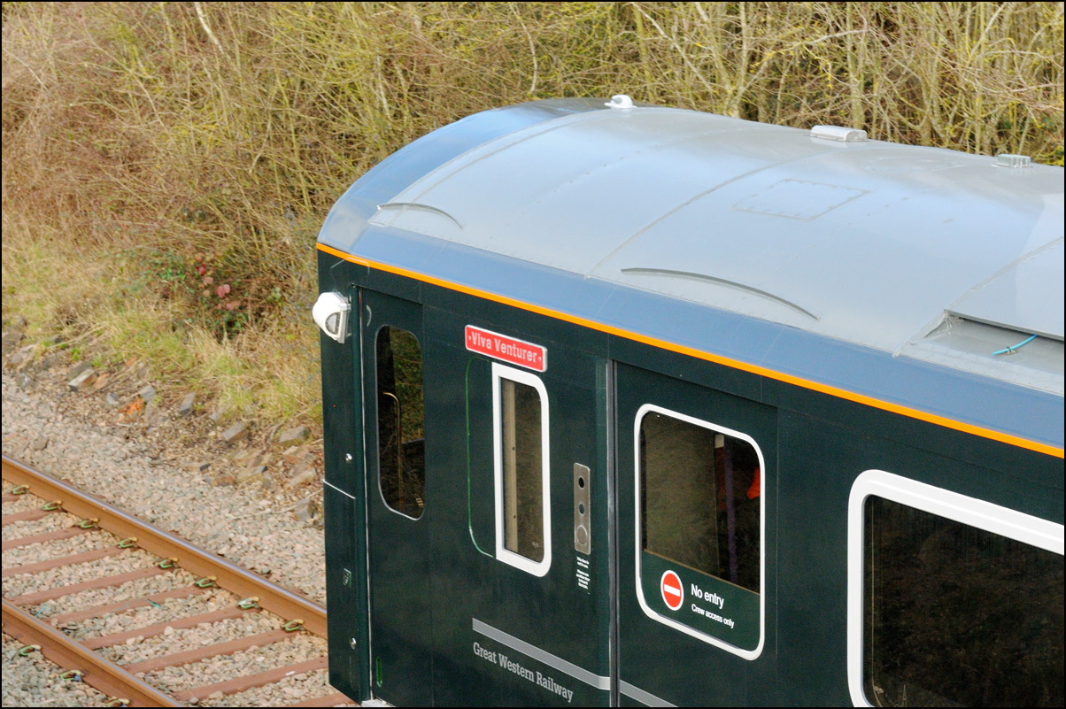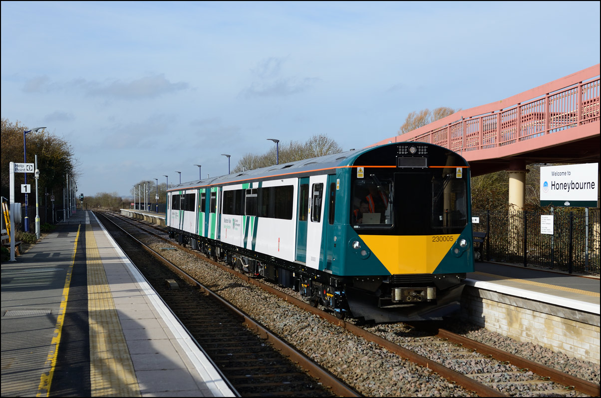 What was probably GWR battery powered 230001's final run in the Midlands took place on Friday 16 February 2024 when it ran as 5Q23 from Long Marston to Reading Traincare Depot. Several GWR men were waiting at Honeybourne to board the train and they told me that tests over previous days had been succesful with the range achieved being gradually increased from 40 to 86 miles, more than enough for the 70 mile run to Reading. The train managed to catch a spell of sunshine as it drew to a halt on the branch with just enough of a gap in the shadows for a reasonable picture. The "Viva Venturer" nameplate has been retained to mark the unit's origin within the former Vivarail business. |