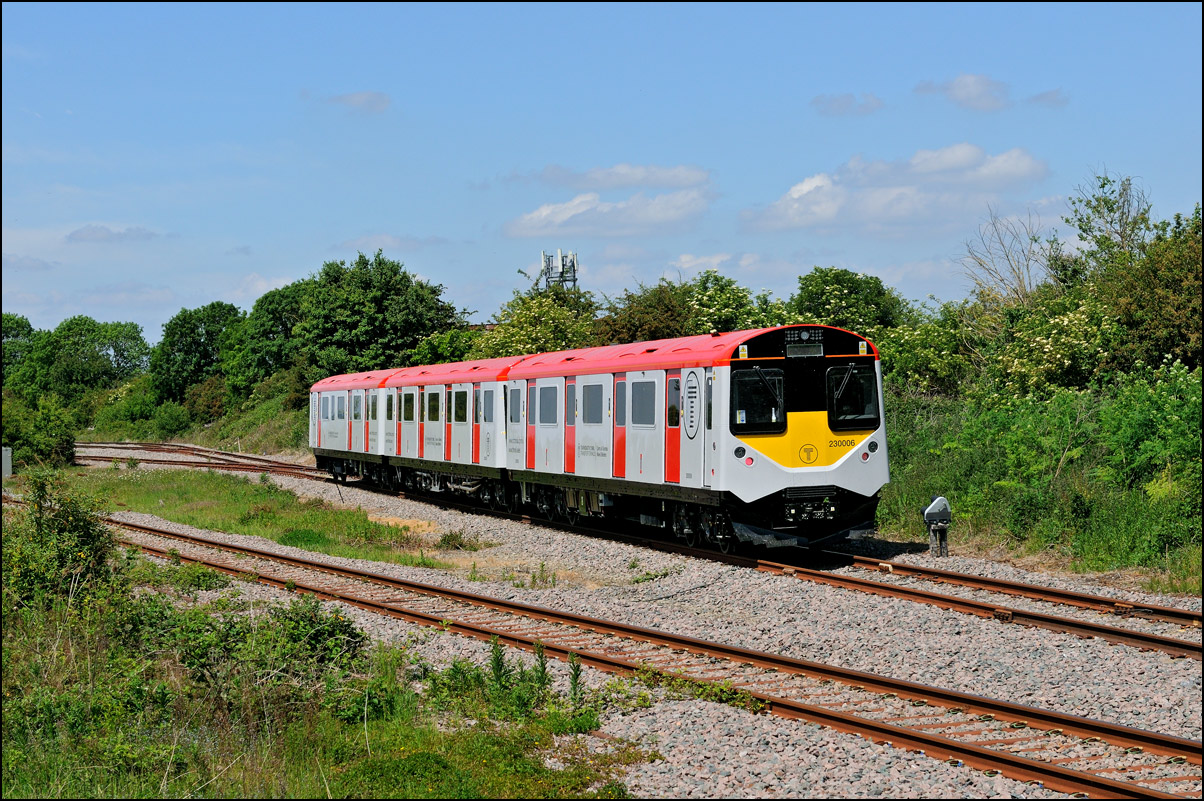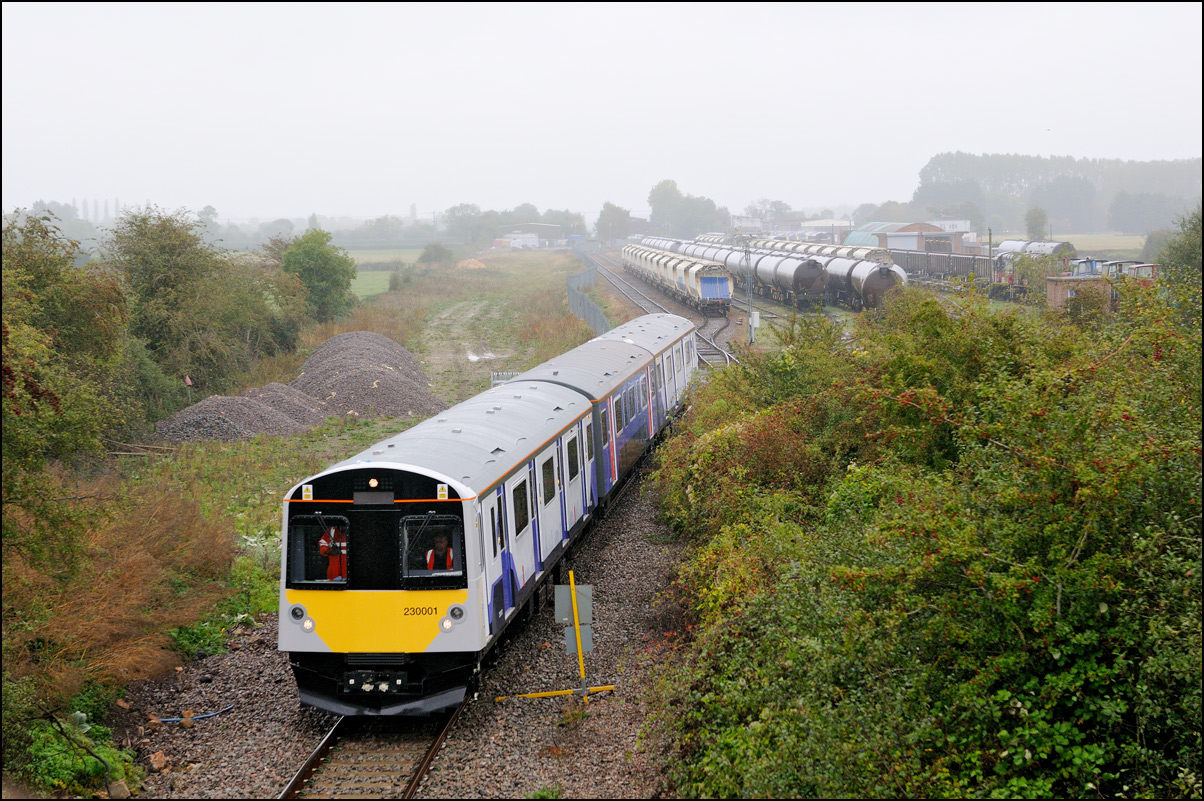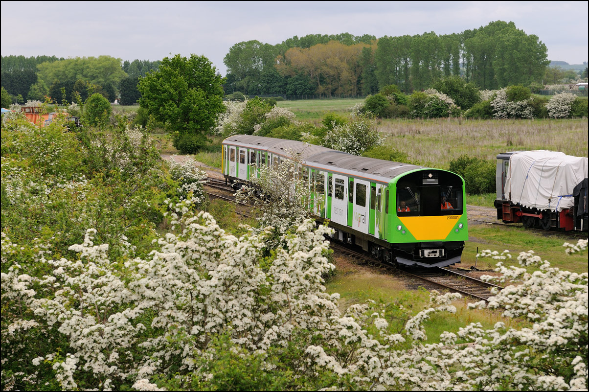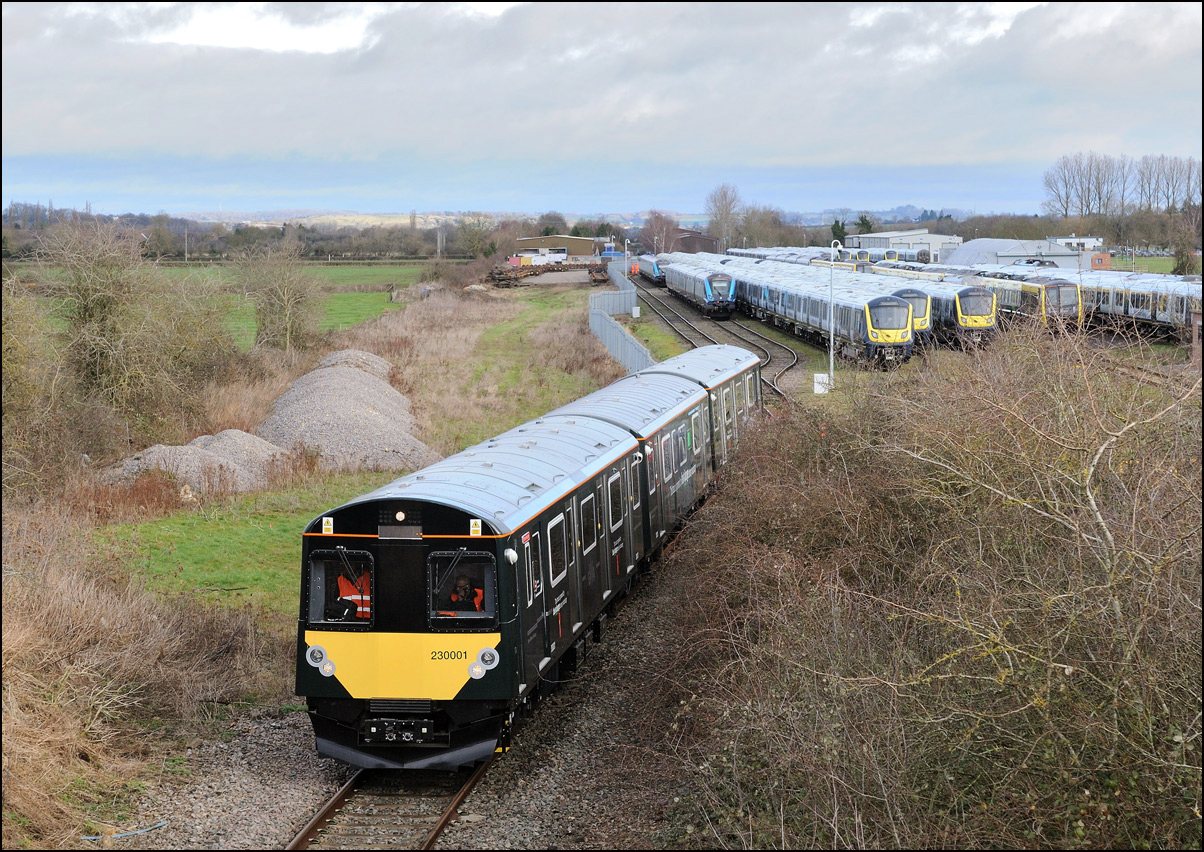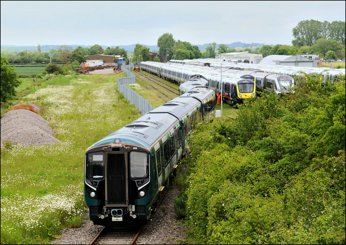 I took this picture on 24 May 2024 to show some of the huge number of stored new and currently unwanted trains in the yard at Long Marston. Apart from 730224 there are stacks of class 701 EMUs along with some TPEx sets. I think that the four coaches in the fourth siding are the remaining CrossCounty Mk3s but I can't identify the 3 car EMU parked few yards in front of them. It appears that this siding may be slightly raised above the level of the others which may explain why the coaches appear taller than those surrounding them. |
