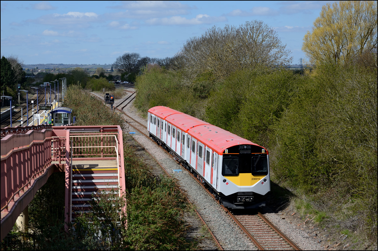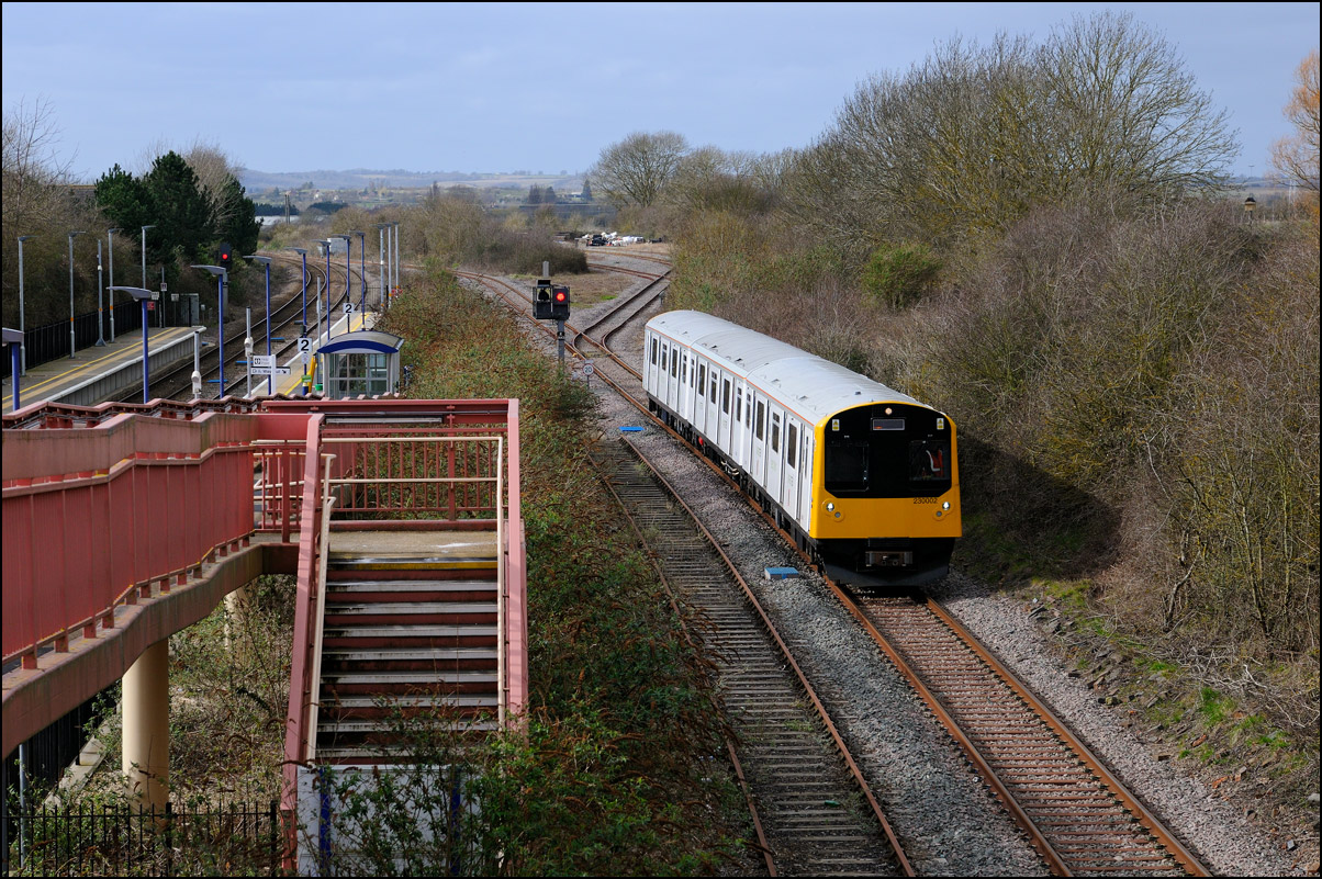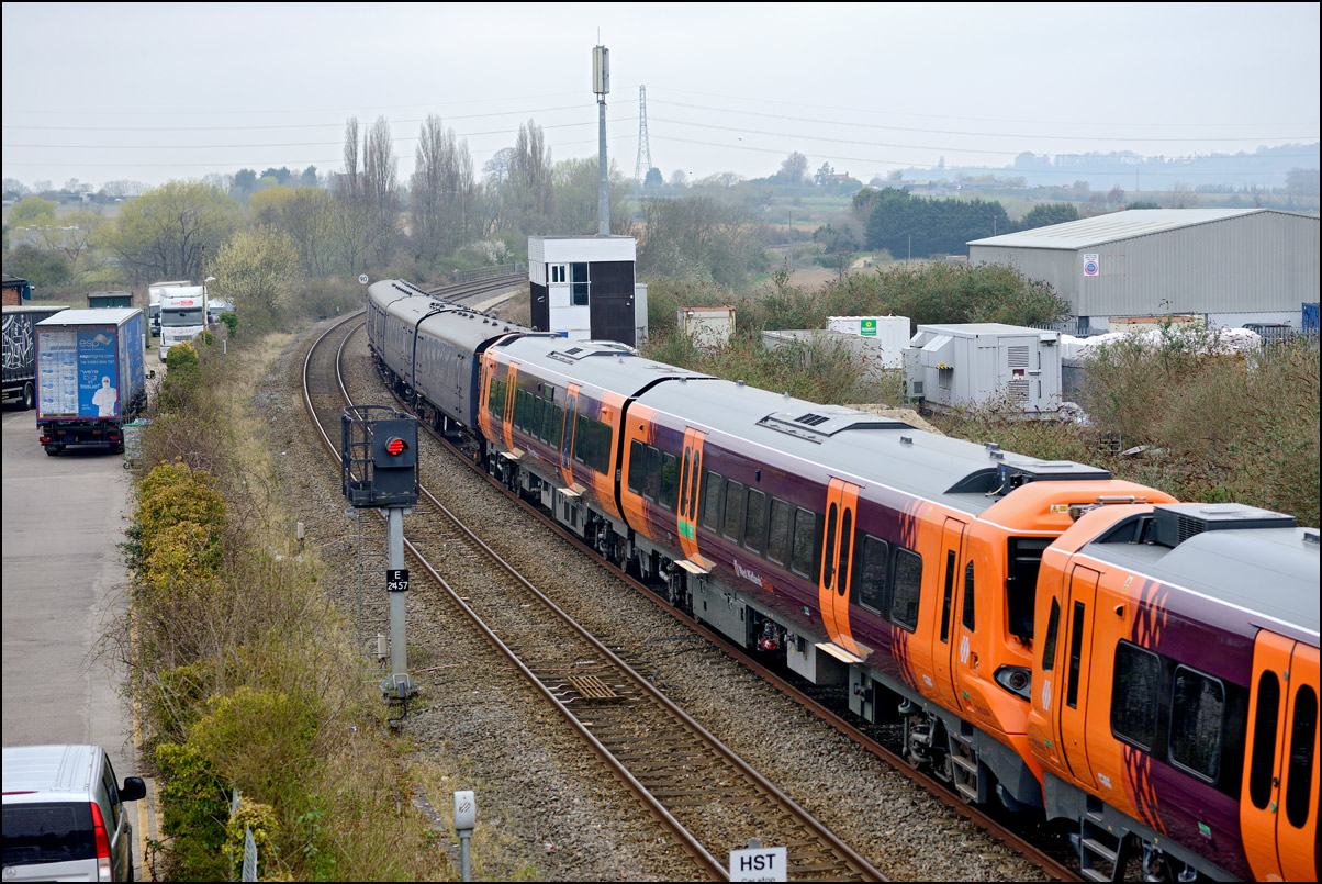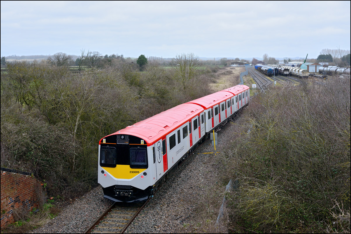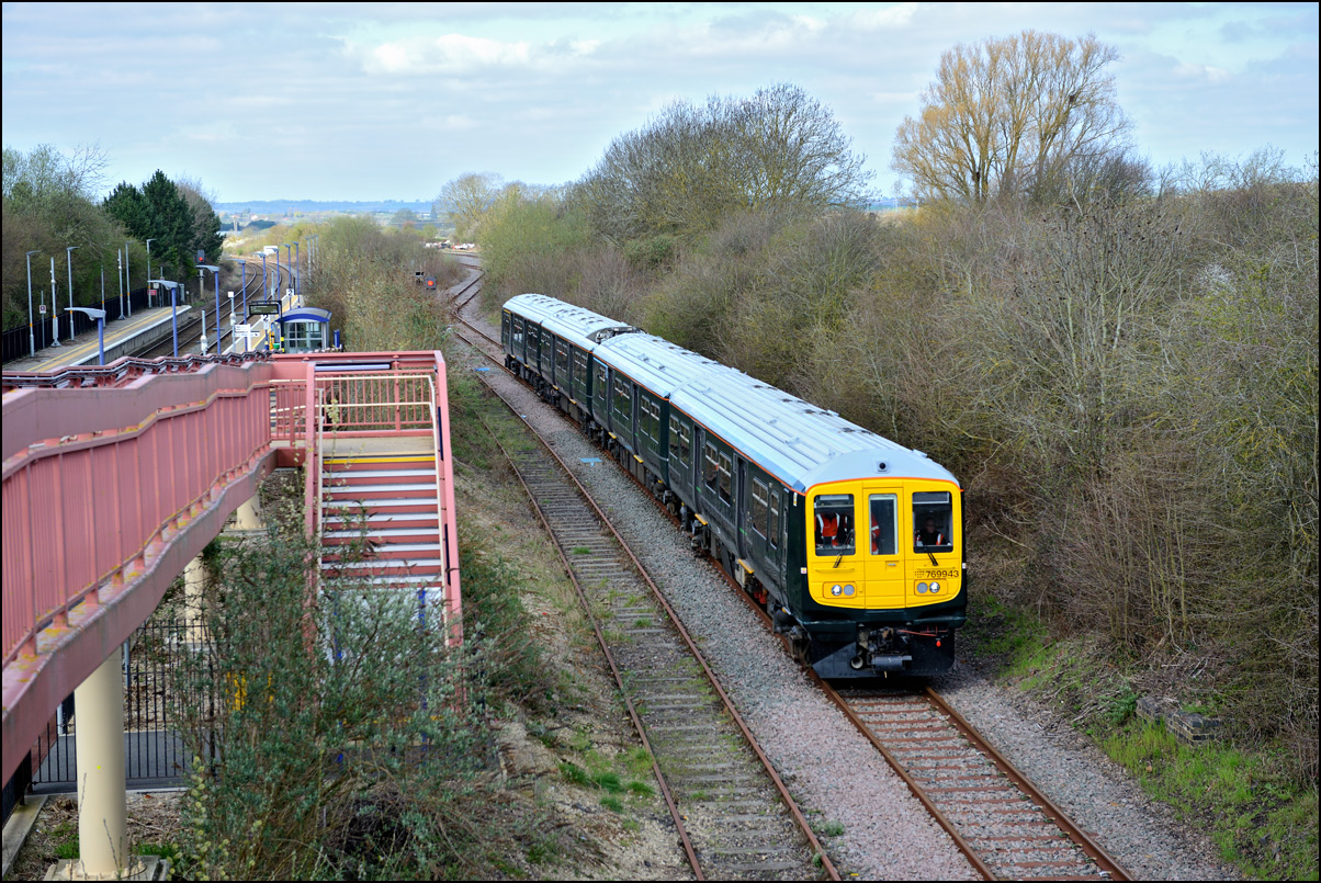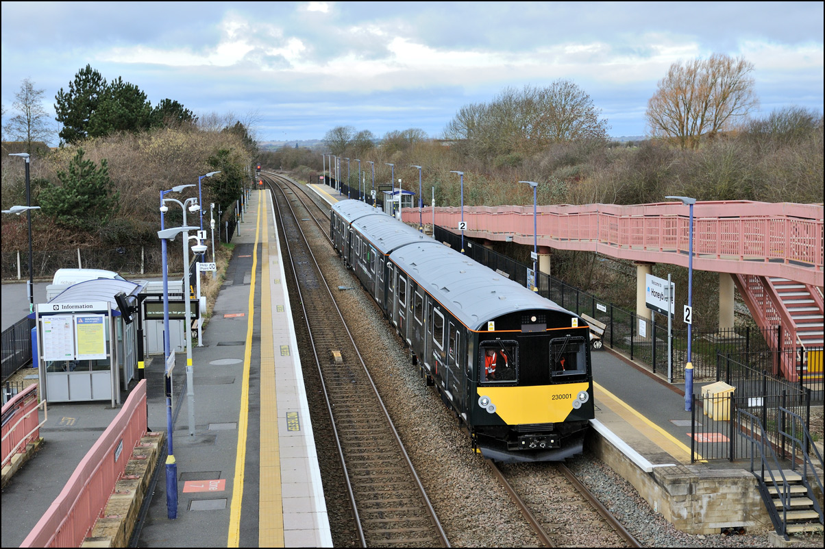 Yet another class of brand-new rolling stock is ending up in Long Marston. This time it is LNWR class 730 EMUs, the first of which ran on Friday 24 March 2024 and arrived with ROG 37884 topping up its Long Matston loyalty card once again. The weather was dull but a first is a first and all that so I made the journey across to take a few shots, the first being this as 5Q94 from Oxley CS approached the site. It was running 64 minutes late after being diverted from the Stour Valley from Wolverhampton to go via Pleck Junction and Sutton Park reportedly due to a cable theft somewhere between Birmingham and Wolverhampton. |
