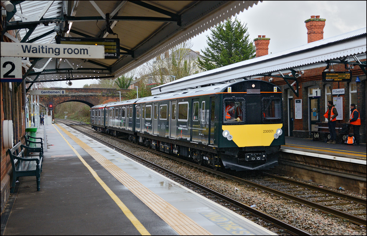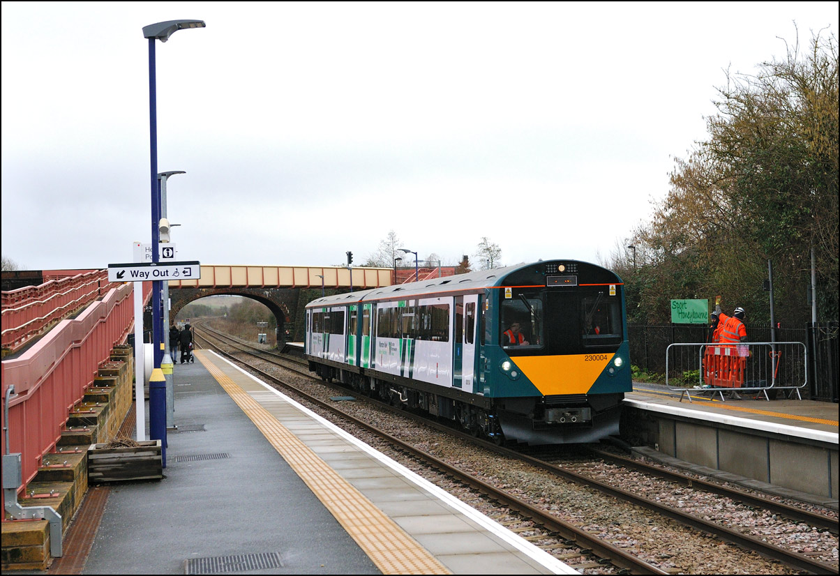 The GWR battery unit 230001, now under the headcode 5Q12, standing at Moreton-in-Marsh of 14 February 2024 had to wait until the preceding service train had reached Evesham before it was allowed to leave. I waited at the end of the platform to take this not very good quality video clip on my 'phone as it pulled away. |