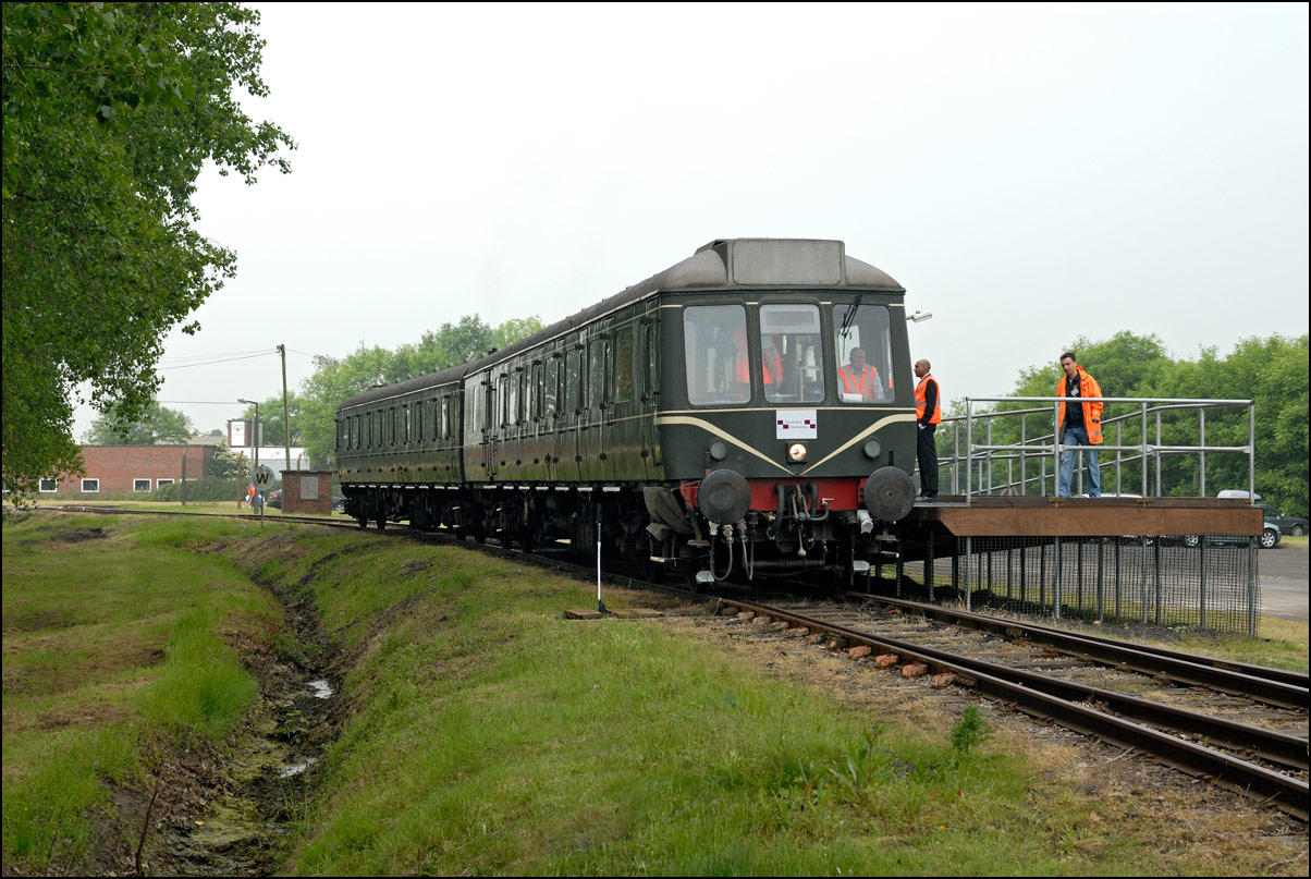 I do find it more satisfying to photograph moving subjects rather than static exhibits and can think of few things more tedious than viewing endless images of dead locomotives snapped from ground level. Here then is another shot of the class 117 DMU, this time approaching the end of her journey and passing 73138 and Emma. The light had turned a little hazy by this time, just what one would expect on such a warm and humid day. I think that the green livery with a "speed whisker" was one of the finest carried by DMUs and it good to see that this example, which came from Minehead earlier in the year, carries this colour scheme. It was great to ride on the train and to have to open the window to get at the external door handle in order to alight from it. No such small pleasures on the overly safety conscious modern railway... |