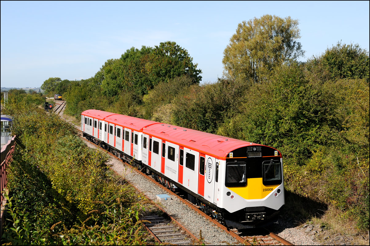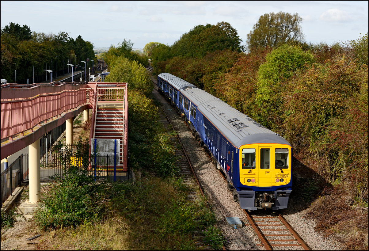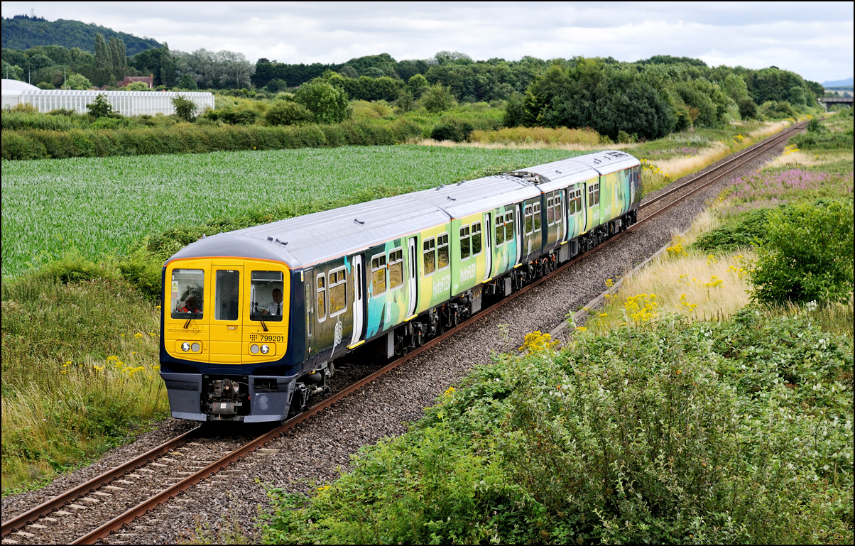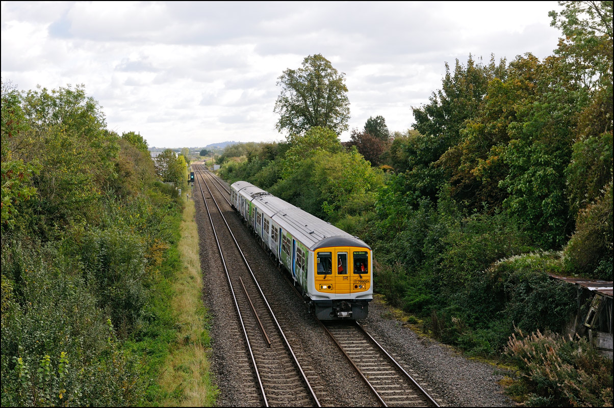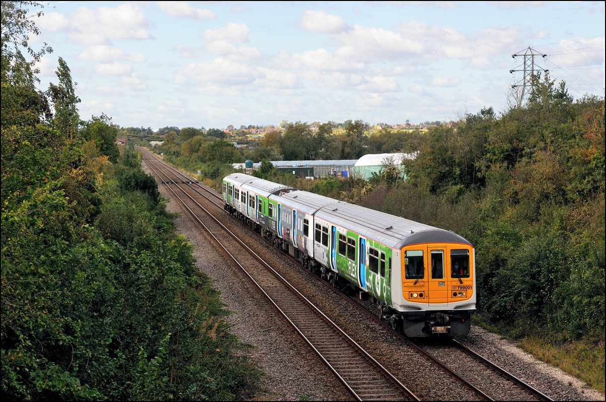 Once 799201 in its latest oolour scheme had passed under the roadbridge at Honeybourne on 1 October 2025 there was just time to cross the road for this image in the small of sunshine before the shadows from the undergrowth started to intrude. |