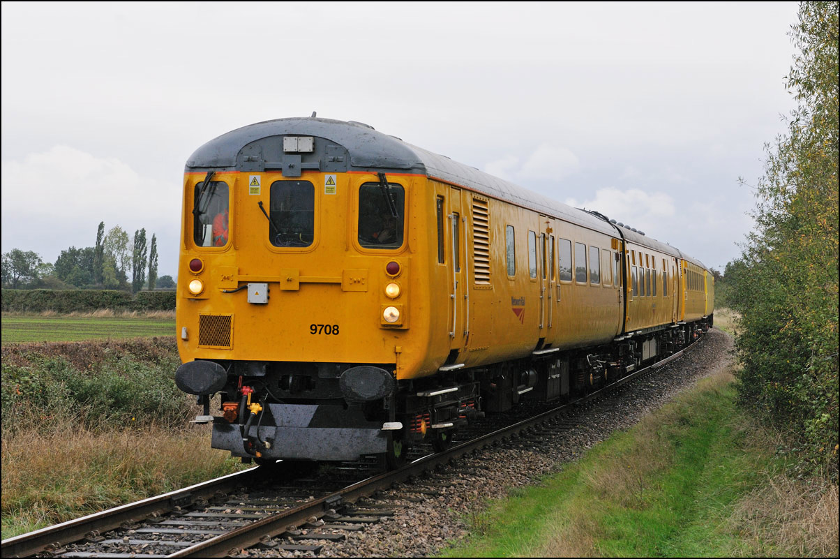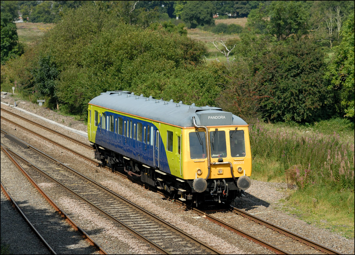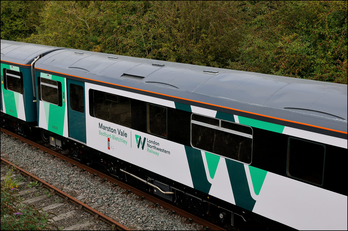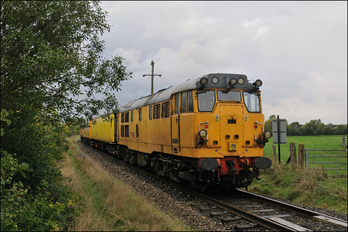 Once 799201 in its latest oolour scheme had passed under the roadbridge at Honeybourne on 1 October 2025 there was just time to cross the road for this image in the small of sunshine before the shadows from the undergrowth started to intrude. |