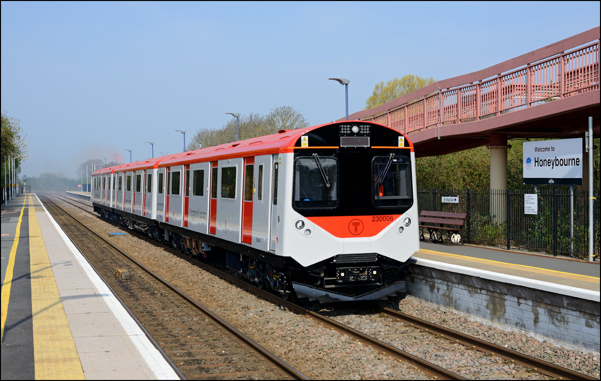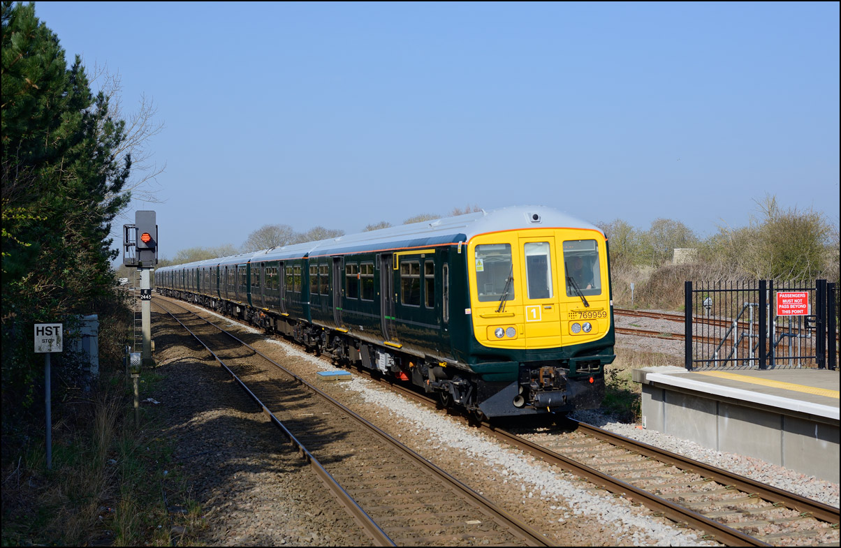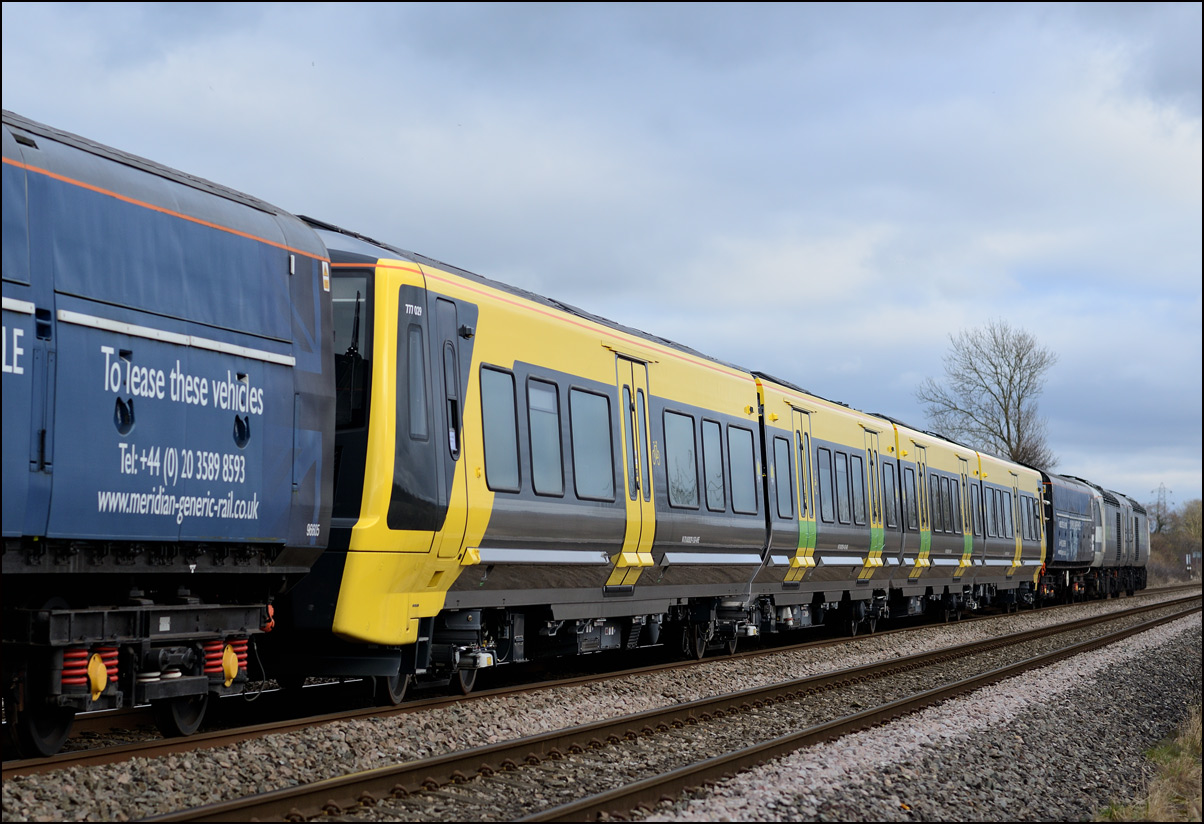 Three more class 777 tri-mode units were moved for storage from Walton Old Junction at Warrington to Long Marston on Thursday 16 February 2024. I was unable to get out for this but there was an arguably more interesting train the following day when 43468 + 43480 took the barrier/brake force wagons from the Warwickshire site to Wembley along with green liveried 20007 which had been there as a standby in case the GWR battery unit 230001 had any issues on its test runs. The lighting at Honeybourne at around 09.30 on a sunny morning is a bit challenging and it was a few moments before I noticed 20007 behind 43468 + 43480 along with the wagons so I put on my longest lens and took a few bracketed exposure shots as 6Z79 came to a stop at the hut in which the branch token is kept. A GWR man was already there to take the token back to Long Marston ready to release 230001 from the exchange sidings for its run later in the morning. |