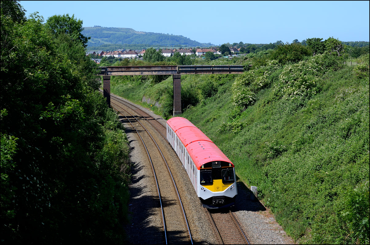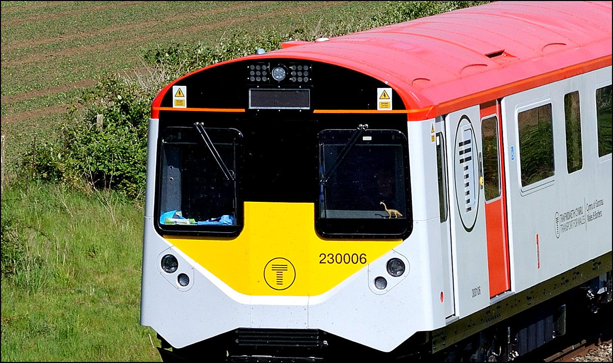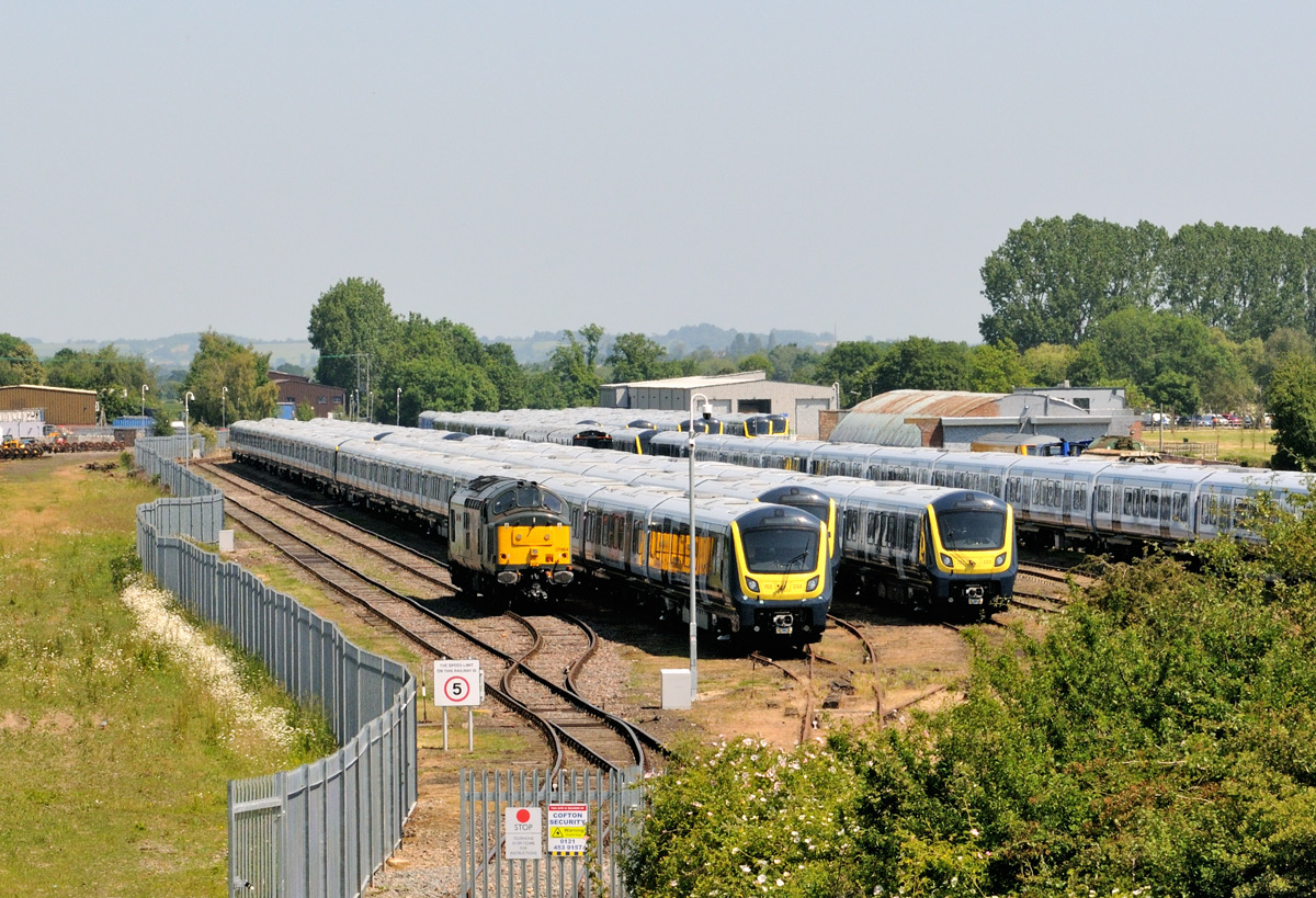 Two Transport for Wales class 197s were taken from Donnington Sidings near Wellington in Shropshire to Long Marston on Wednesday 5 June 2024. Yes, more new stock going for storage in Warwickshire to make room at other sites. The locomotives, 37407 and 37218, newly acquired by ROG, took a couple of barriers from Derby to Donnington where the train including 197027 + 197029 was made up ready for a 13.33 departure. Running under the headcode 5Q94 the train ran close to time as far as Worcester where a delay unsurprisingly caused by a late-running GWR service made it some 25 minutes late at Evesham. The better-looking of the locomotives was leading and I didn't bother with a going away shot of the fairly scruffy plain blue 37218. As class 197 was new to the North Cotswold Line I took this view of them. Thanks to Rob Pritchard for information on the reason for the units movement. |