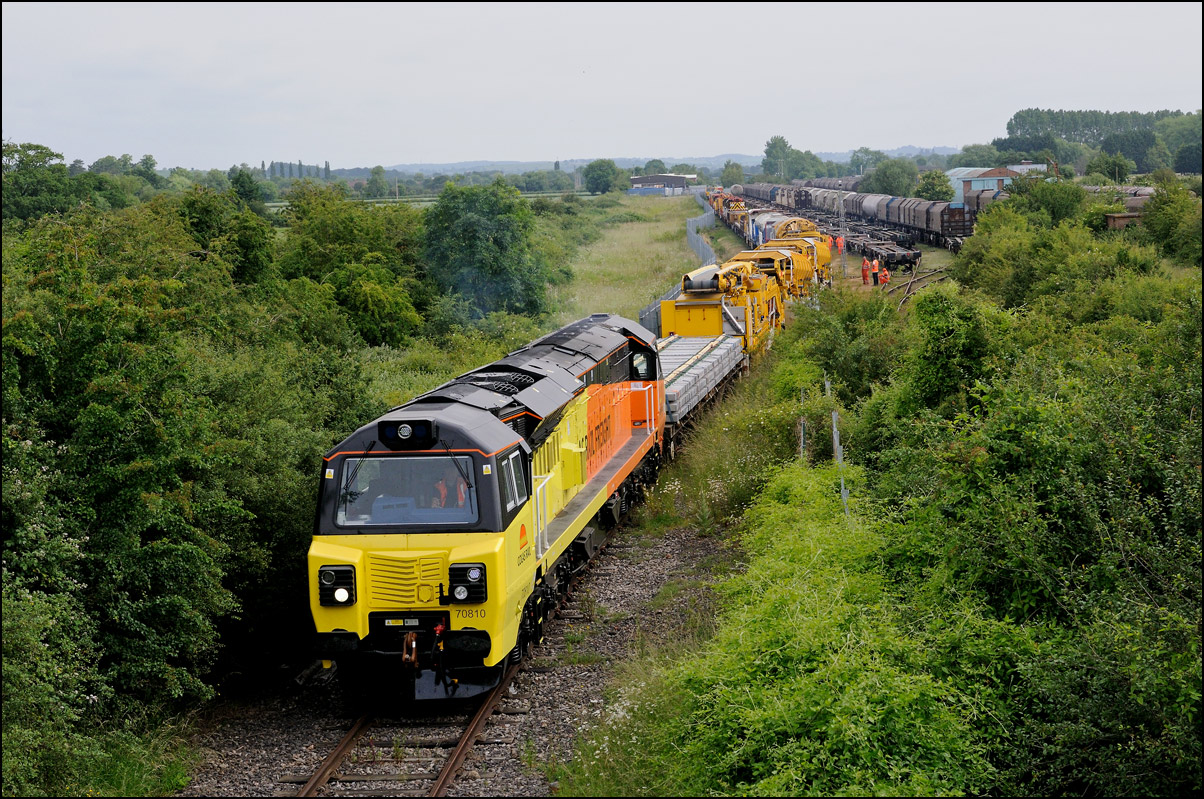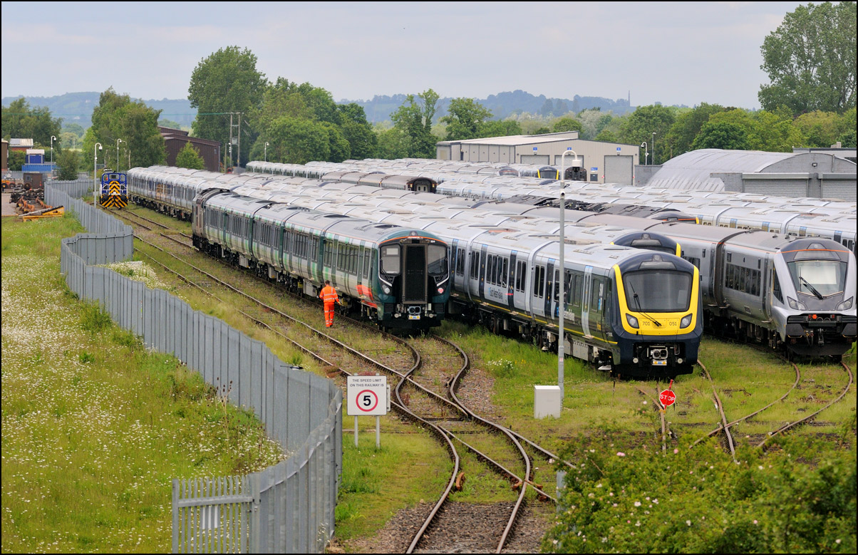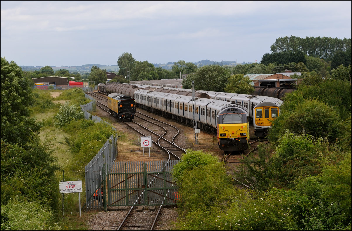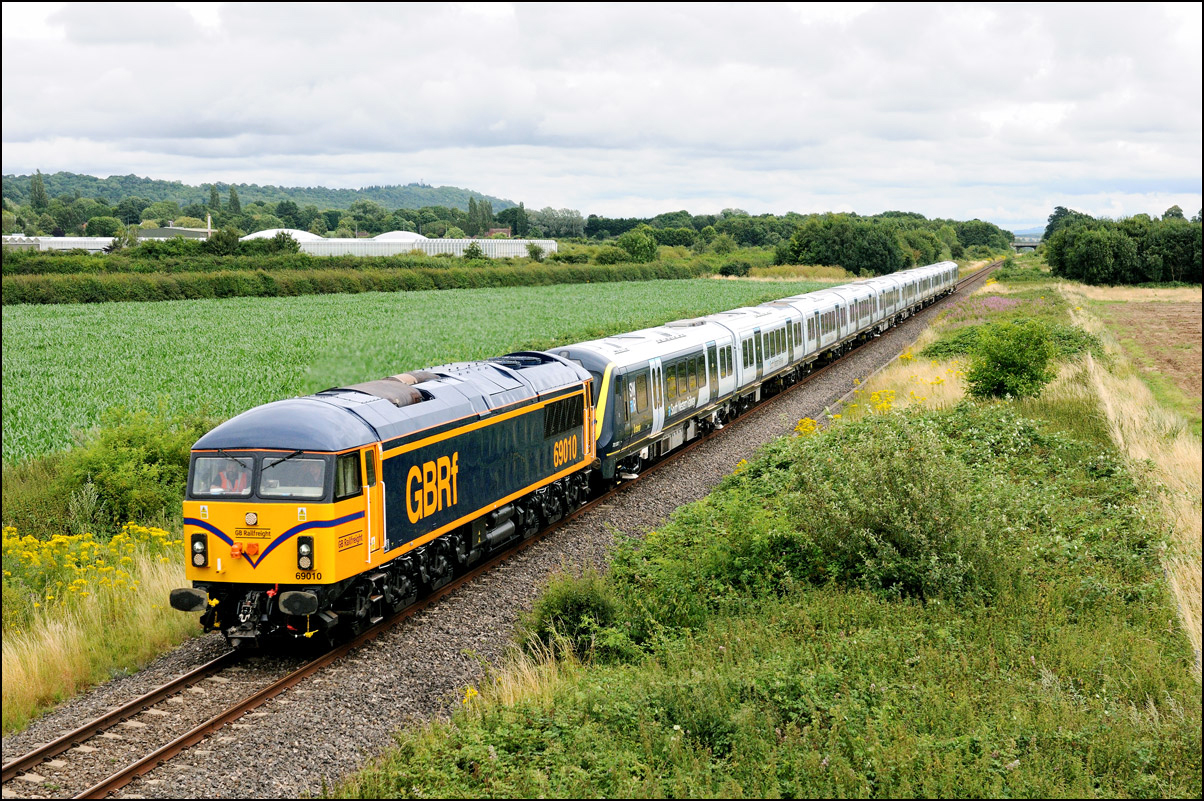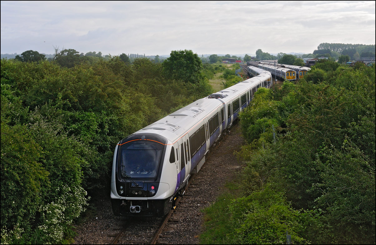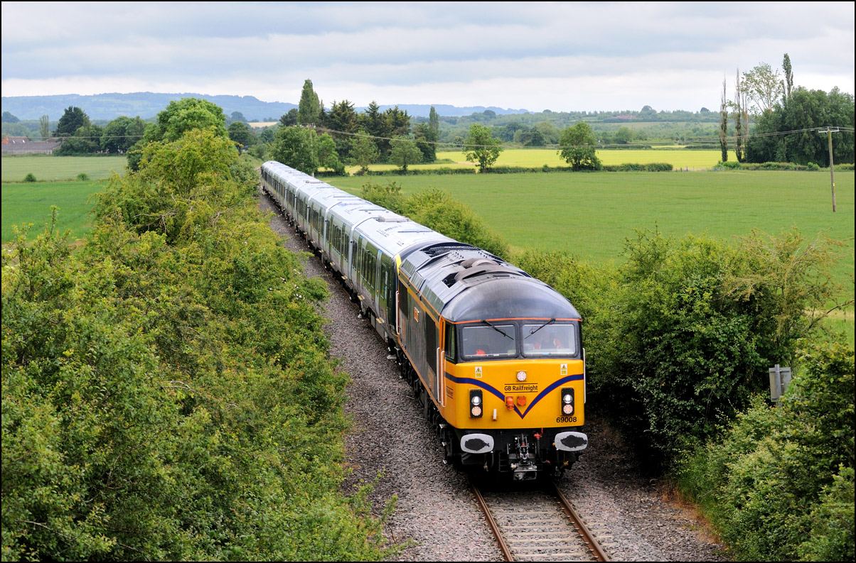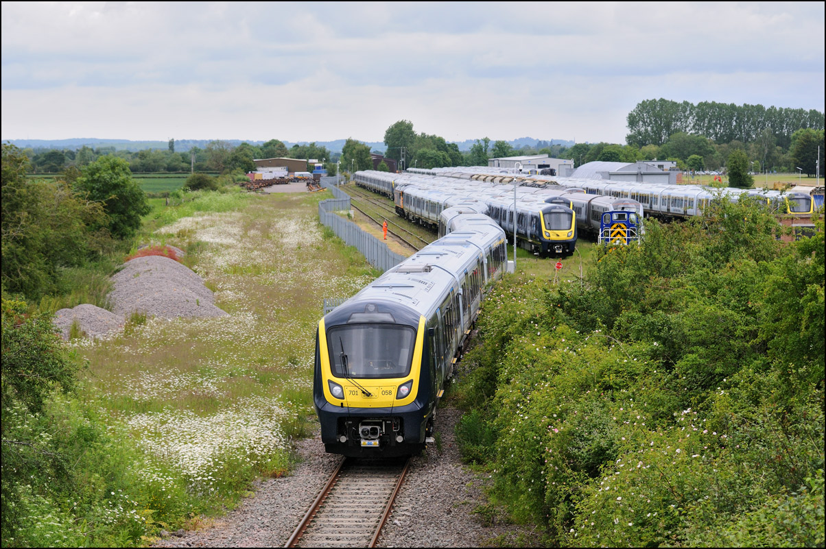 A class 701 EMU was due to be taken out of storage at Long Marston to Eastleigh on Tuesday 25 July 2024. It appeared that some problems were encountered when coupling 69010 to the unit and the train was eventually cancelled: this was apparent when the gates from the yard were closed. Schedules appeared on 24 July with a light engine going to Long Marston from Eastleigh and the train itself in the same path as before. On the day the light engine was cancelled but 5Q86 to Eastleigh appeared to be running presumably after a fitter had attended and sorted things out. It wasn't really a surprise when the arrival time came and went but an hour later it did report on passing Evesham. This is the view at Lower Moor with 69010 and 701030 (I think) at speed on the single track to Norton Junction. There is a short piece of video here. |