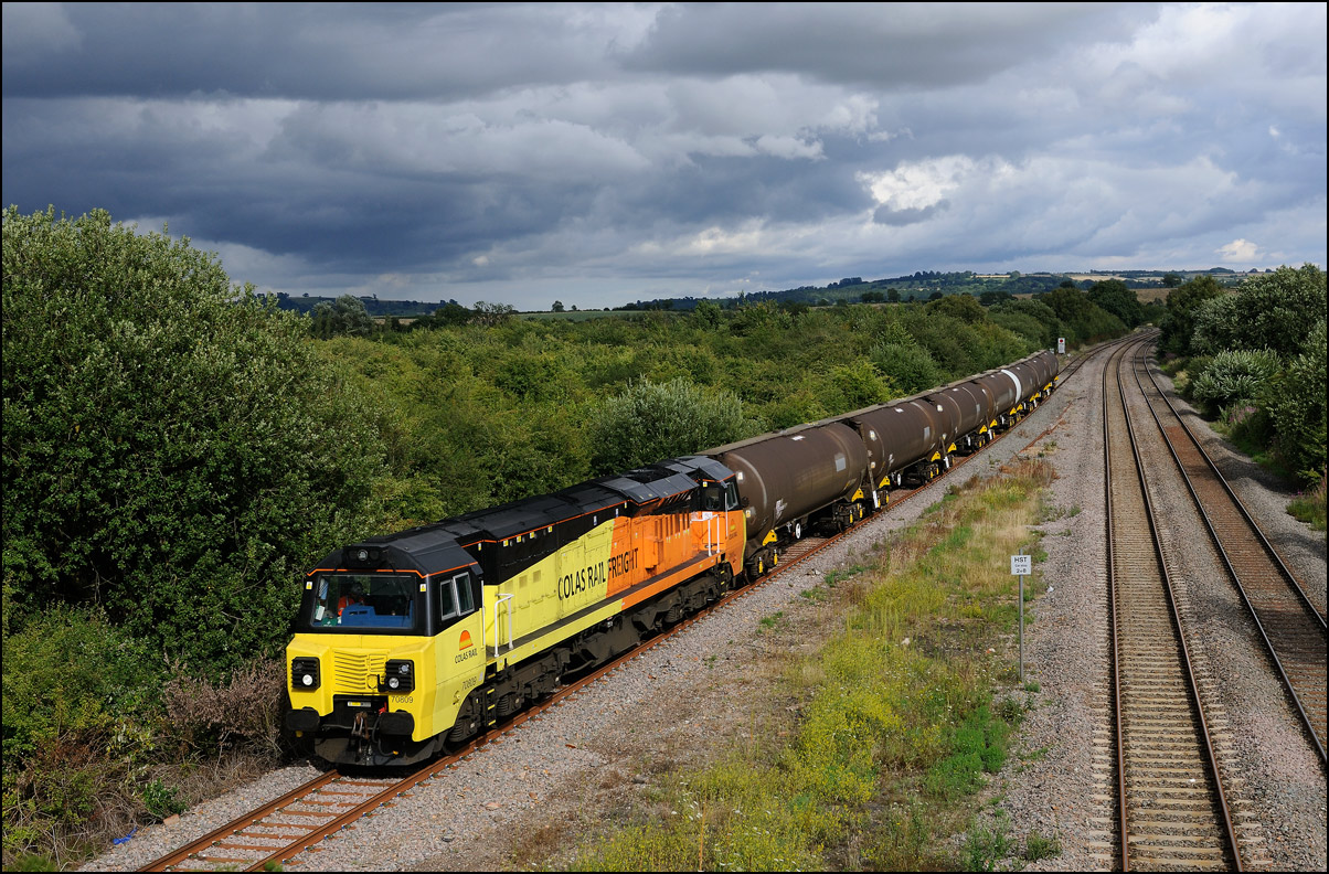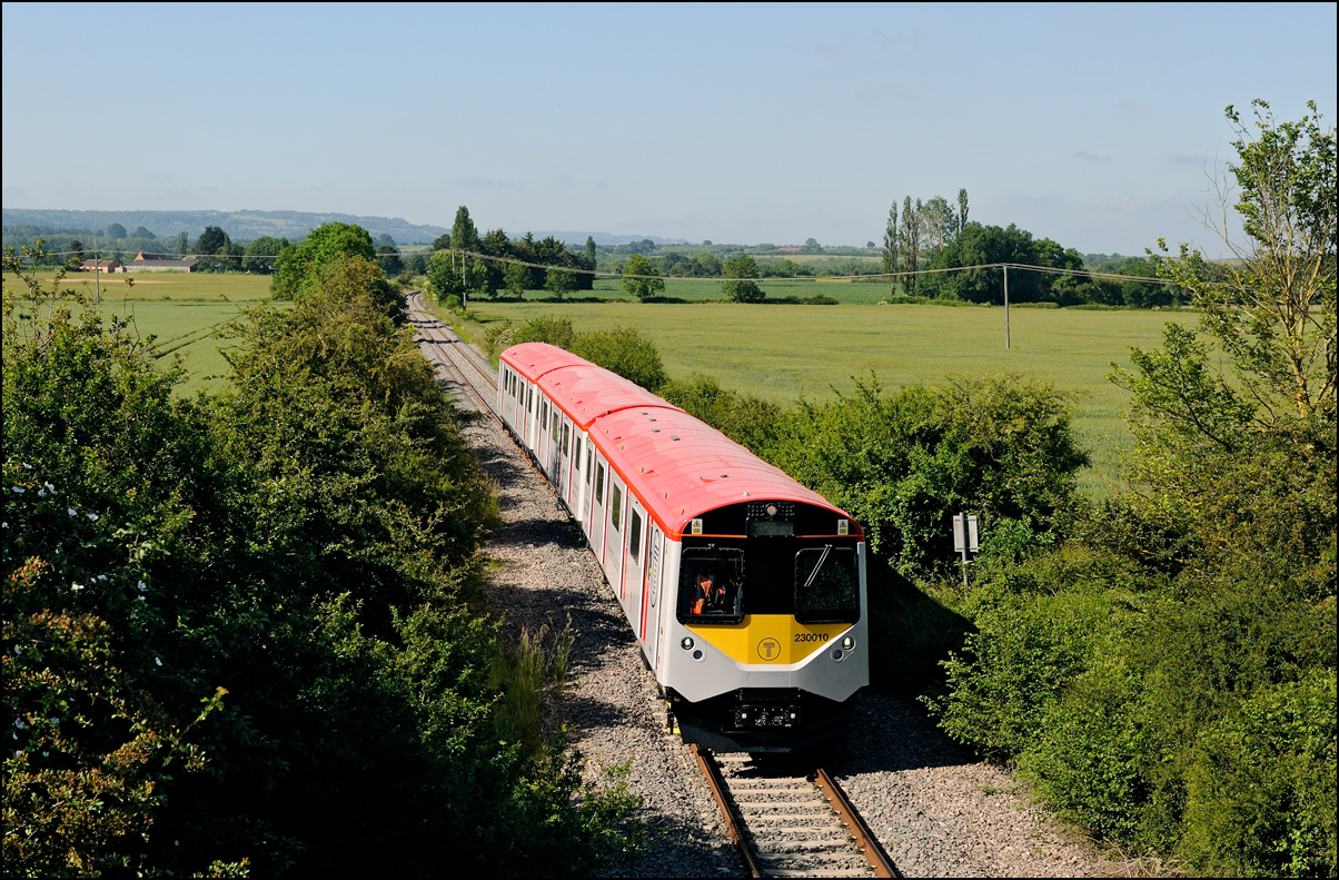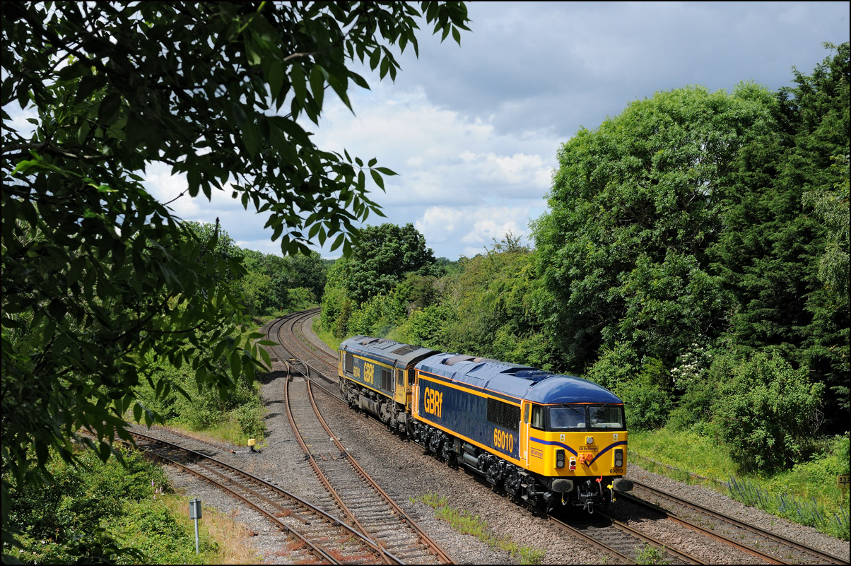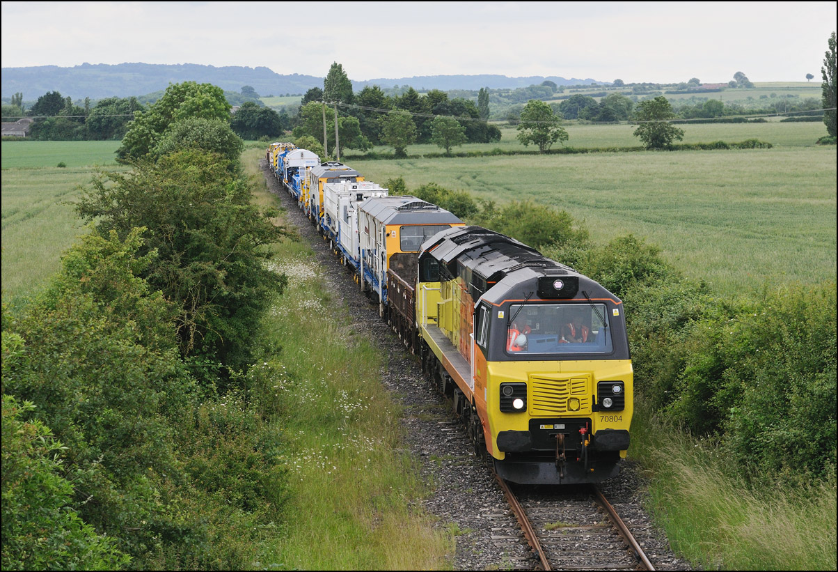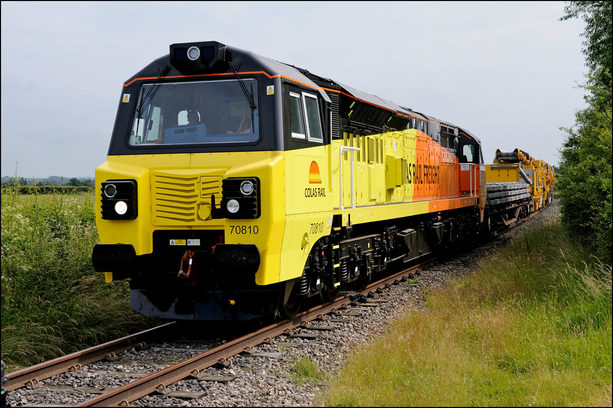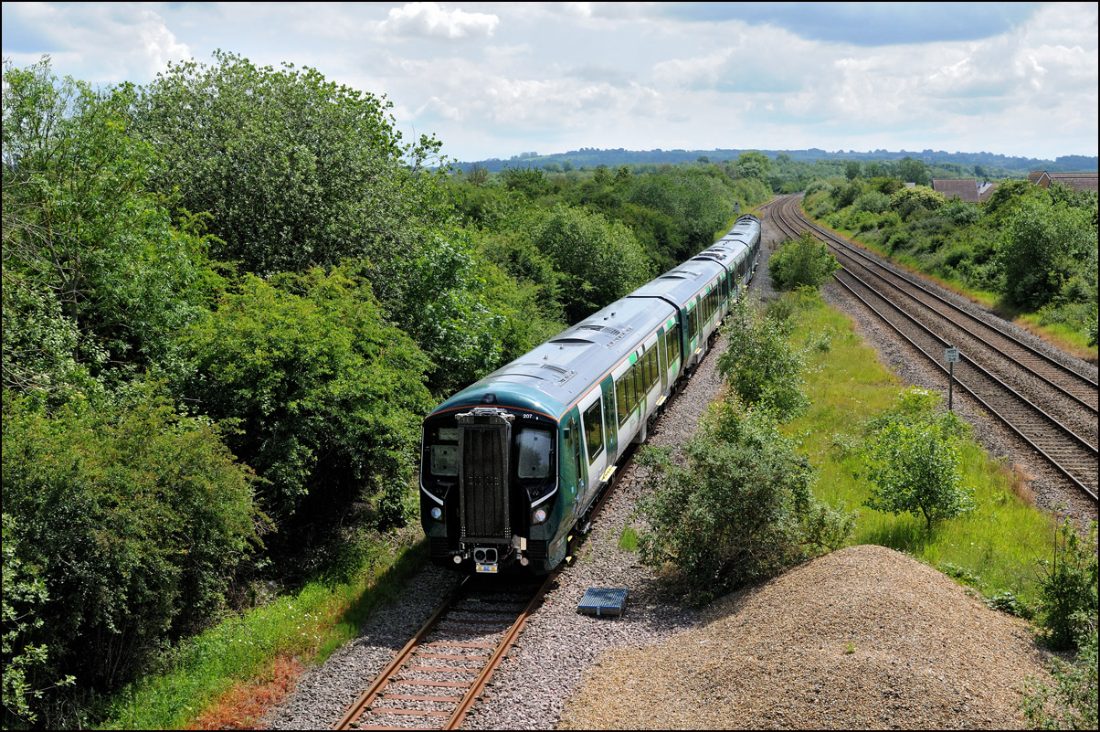 A class 701 EMU was due to be taken out of storage at Long Marston to Eastleigh on Tuesday 25 July 2024. It appeared that some problems were encountered when coupling 69010 to the unit and the train was eventually cancelled: this was apparent when the gates from the yard were closed. Schedules appeared on 24 July with a light engine going to Long Marston from Eastleigh and the train itself in the same path as before. On the day the light engine was cancelled but 5Q86 to Eastleigh appeared to be running presumably after a fitter had attended and sorted things out. It wasn't really a surprise when the arrival time came and went but an hour later it did report on passing Evesham. This is the view at Lower Moor with 69010 and 701030 (I think) at speed on the single track to Norton Junction. There is a short piece of video here. |