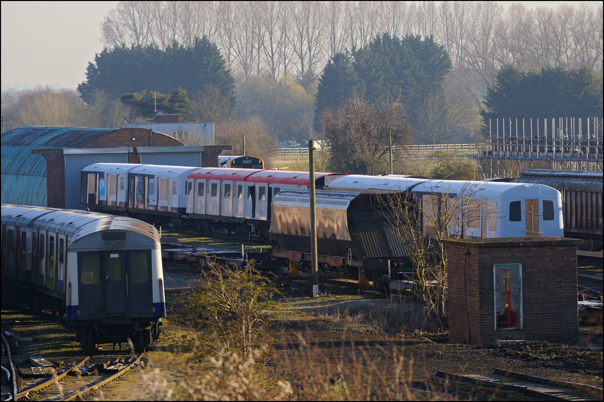 There were still a lot of shadows across the line between the roadbridge and gate at Long Marston on 18 February 2025 and I had to wait for a shot until 7Q99 tailed by 37901 was inside the site. The other class 458s can be seen in the sidings and today's delivery would have been propelled onto one of those following some messy shunting moves. The locomotives and barriers later took a class 769 to Crewe but I couldn't be bothered to turn out out short notice with no guarantees that the scheduled timings would stick. |