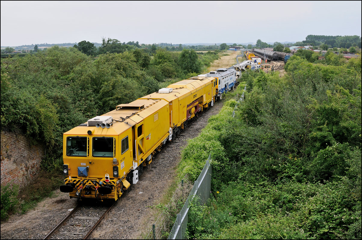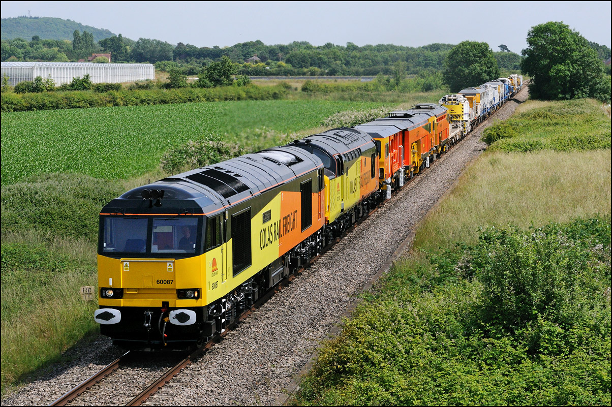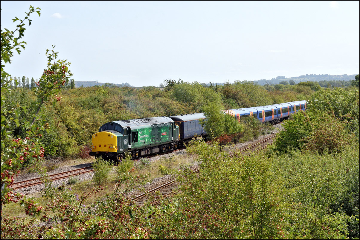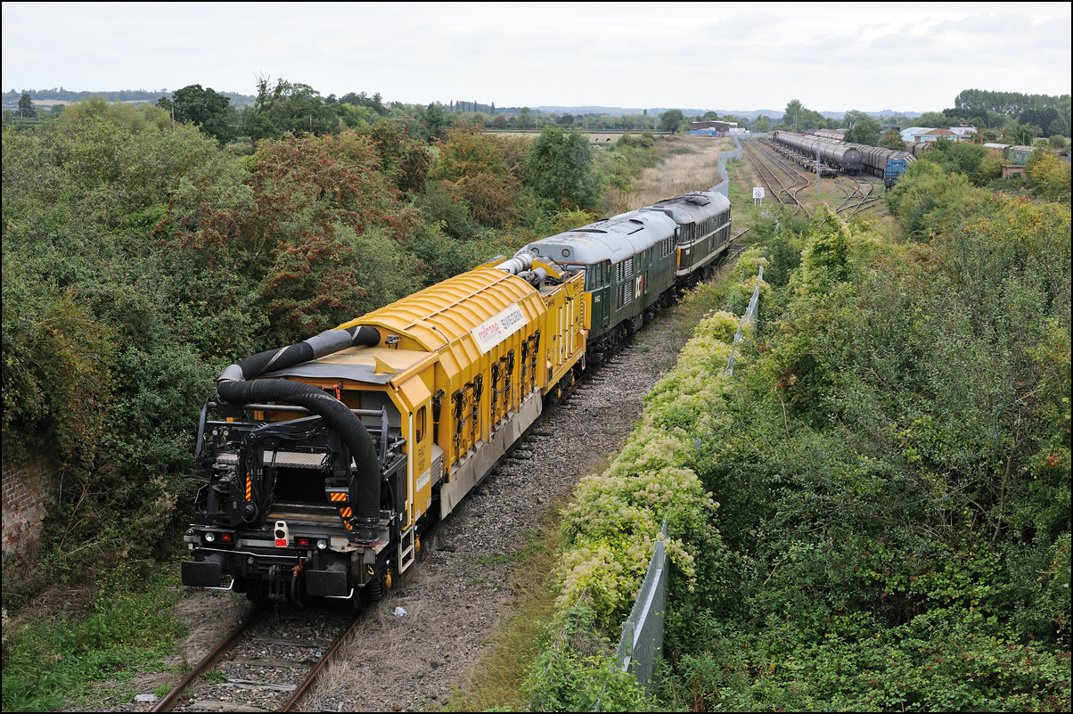 There was quite a lot of green in this view of 37608 at the back of 7Q94 at Honeybourne on 6 August 2025 as the train stood while the crew collected the single line token. it stood for much longer than is usual and there seemed to be lot of hissing from the braking system so maybe the brakes on one of the barriers was playing up, but that's only a guess. What I do know is that the planned class 5 move with the barriers running to Worcester Shrub was replaced with just a light engine move. While waiting for something to happen I took a still shot of more greenery and also a short video which was shot only at the last minute. |