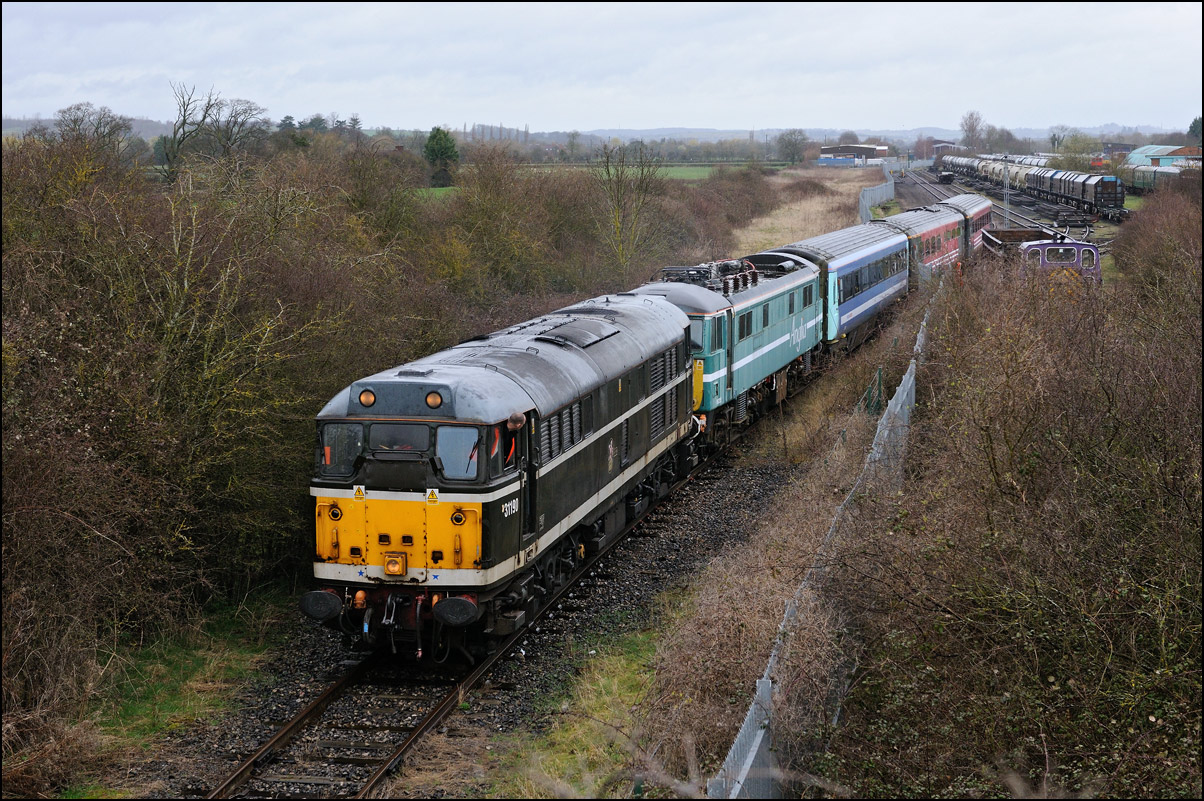 Here is another shot of 47316, this time about to enter the site at Long Marston with the off-lease Virgin HST set, with power car 43025 immediately behind the locomotive. A train of white ICI tanks has appeared here since my last visit. These were unfit to travel by rail so were delivered by road. This is a bit of a shame as they would have made a most interesting photograph anywhere on the Cotswold line and on this branch. They are just about discernible in the background, above the 2 rakes of almost derelict coaching stock. Unfortunately, the light was so poor that very limited depth of field was available so the tanks are not at all clear so far in the distance. |