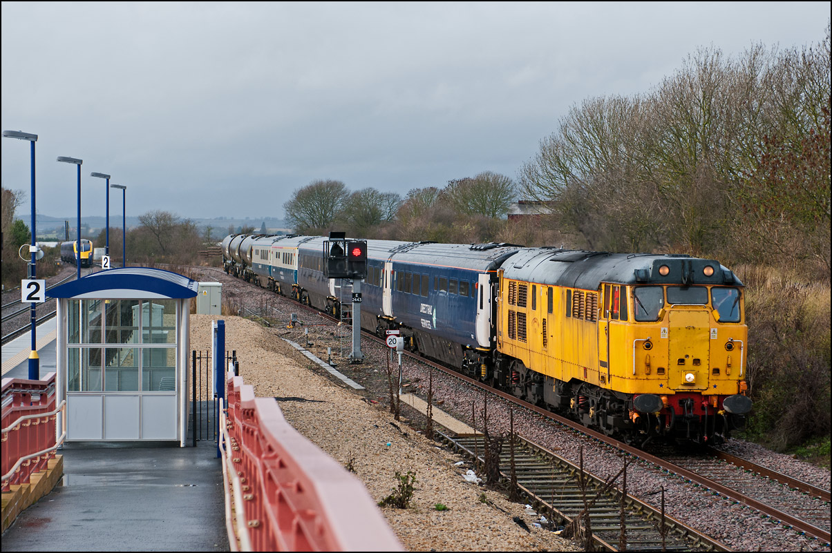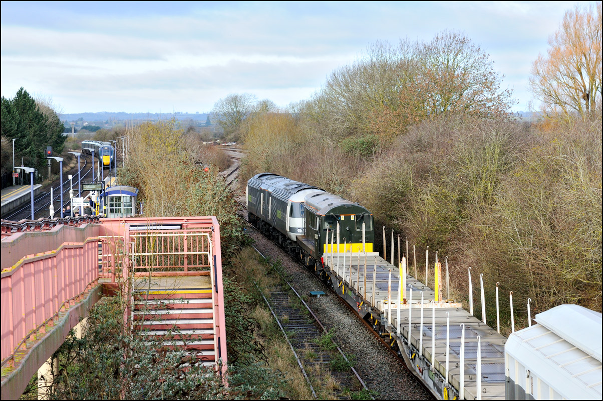 There was an up GWR service to London Paddington due within a minute or so at Honeybourne on 16 February 2024 as 6Z79 with 43468 + 43480 + 20007 stopped at the signal protecting Honeybourne North Junction so it wouldn't be held for long; in fact, just until the IET was in the platform. It was fortunate the first two wagons were flats which a half-decent view of green 20007 making for a sight that I can't imagine has happened before. The class 20, which came from the SVR at Kidderminster as a standby in case GWR 230001 had any problems on its test runs, was detached from the consist there causing around one hour delay to the run forward to Wembley via Birmingham and Nuneaton. |