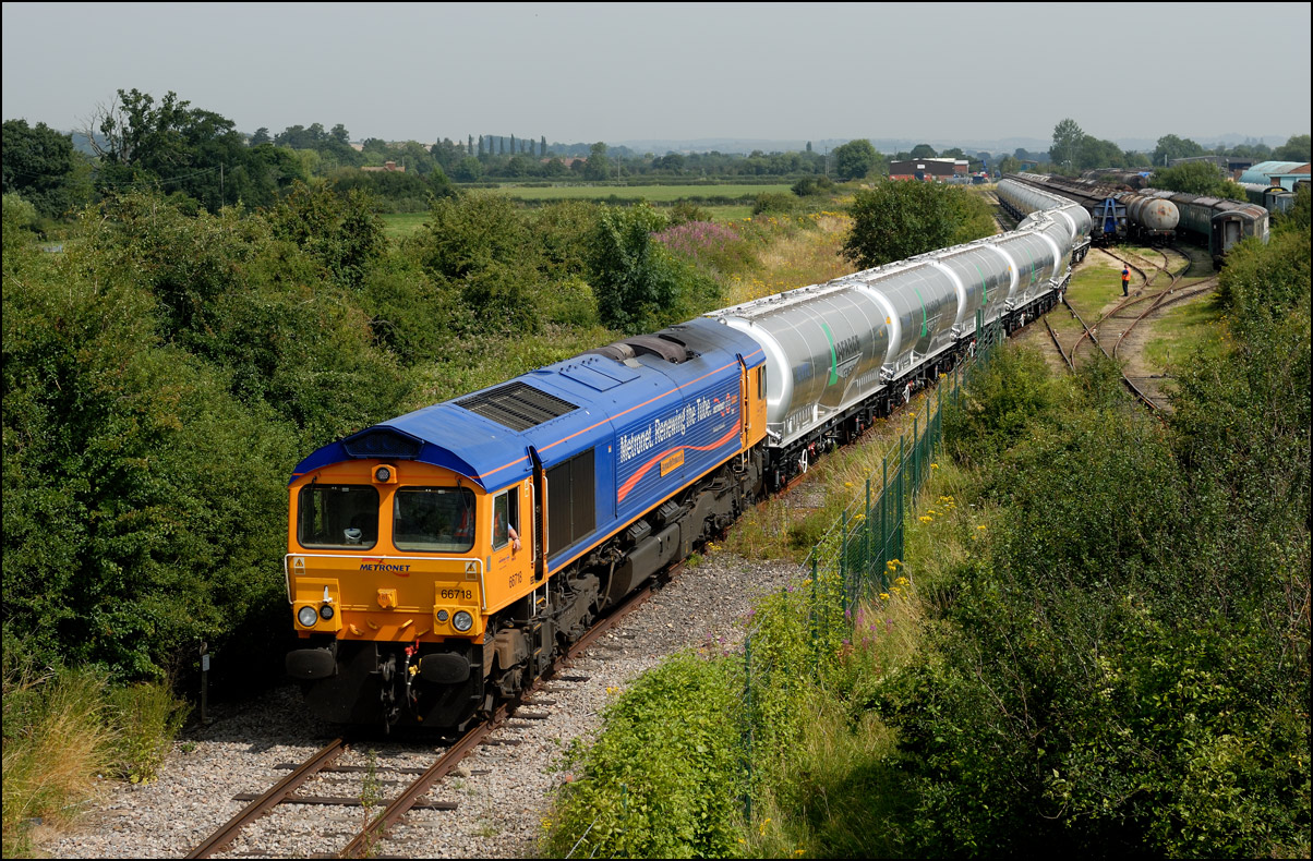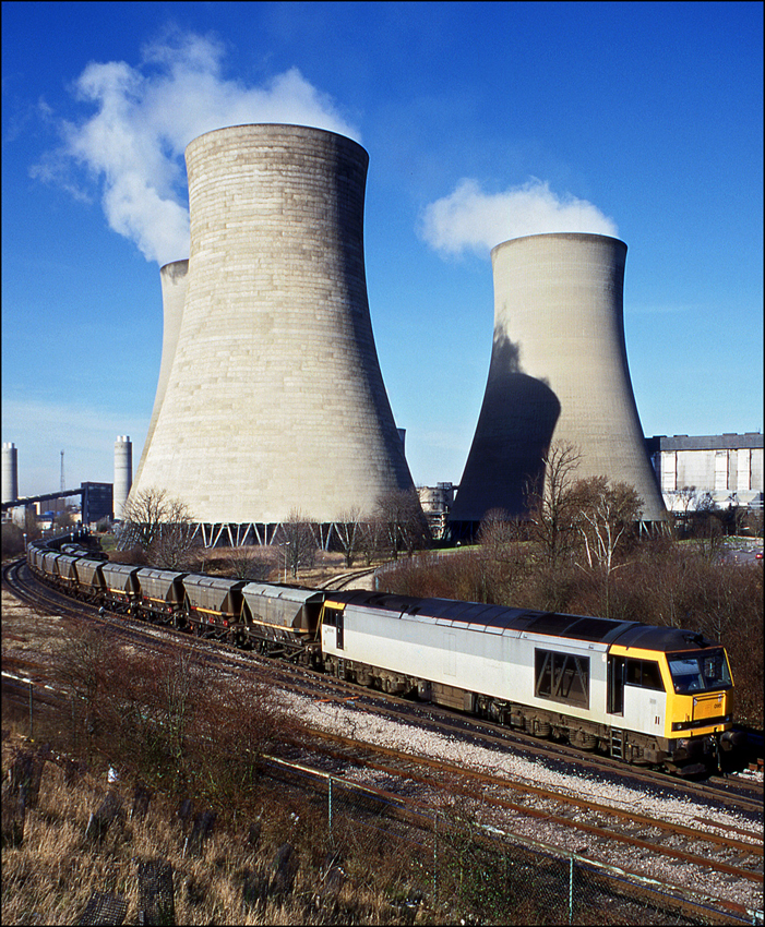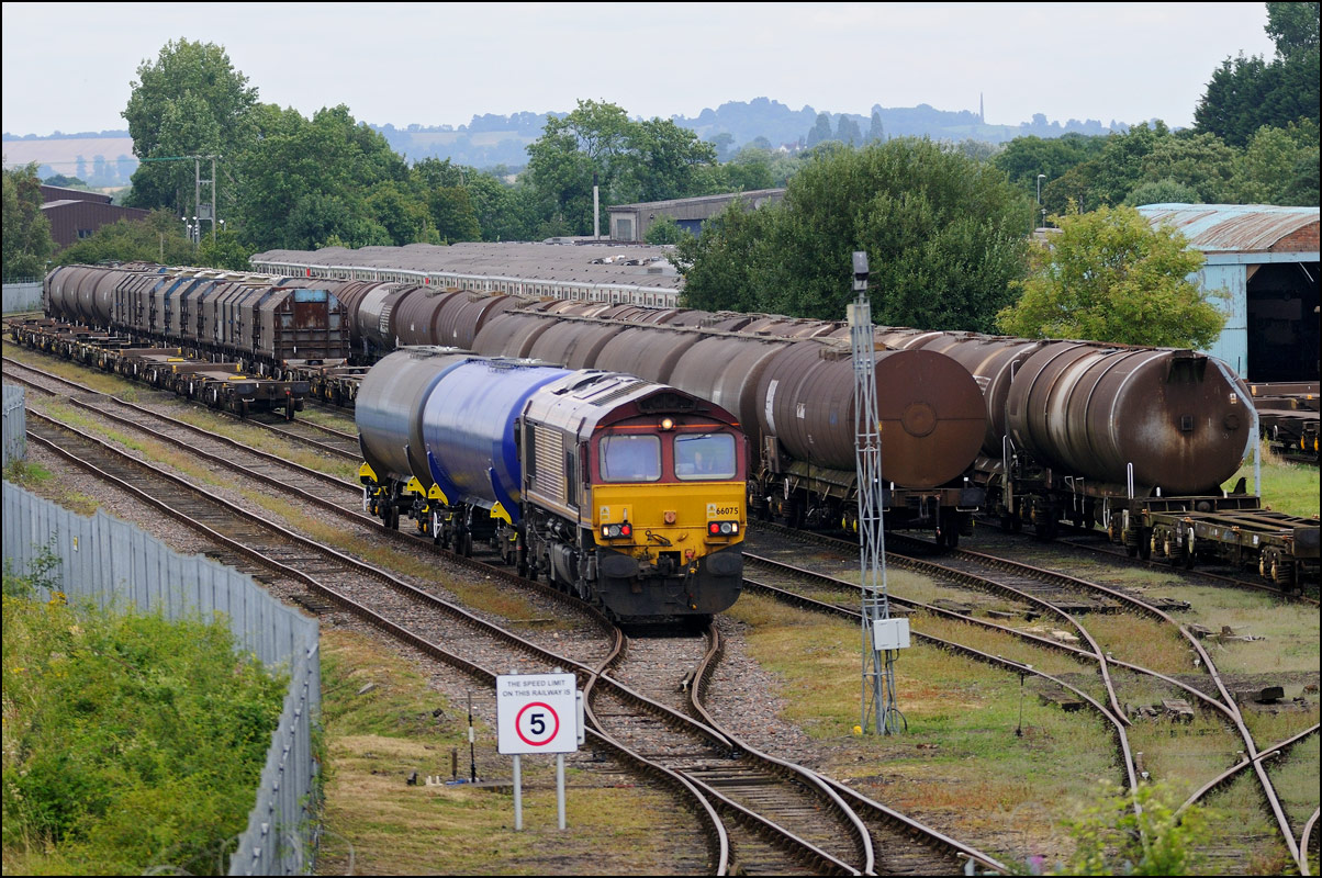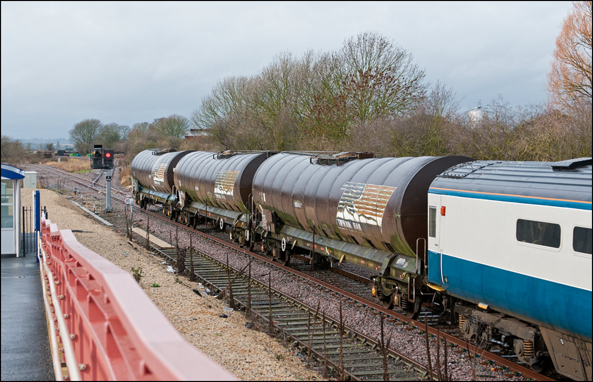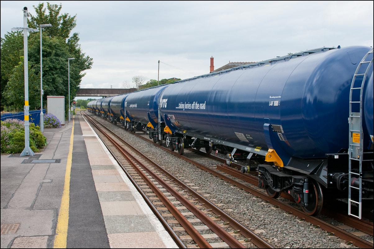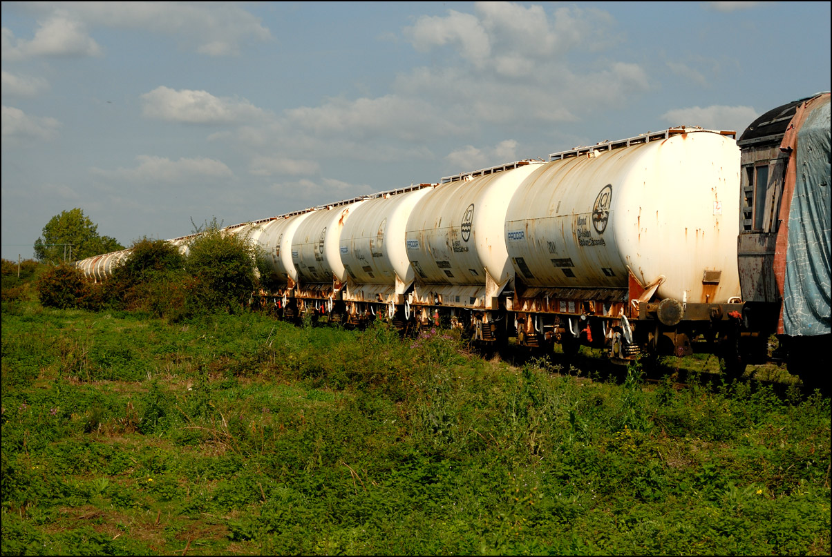 Wagons per se don't hold a lot of interest for me but are worth a photograph when the right scene presents itself. This rake of withdrawn 4 wheel calcium carbonate tanks once operated by ICI looked quite attractive on 16 September 2006 while stored at Long Marston. These had previously arrived by road and from mypoint of view would have been a much better proposition had they been fit to have arrived by rail. |