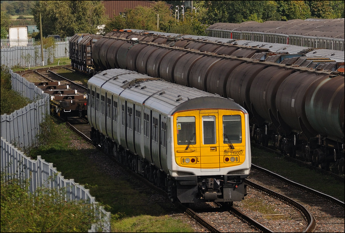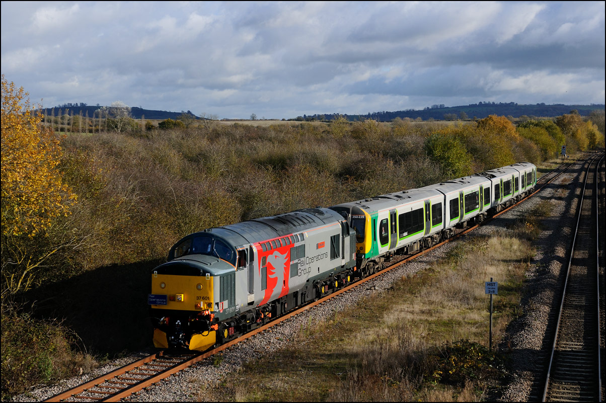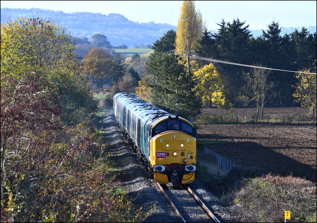Two more class 350/2 EMUs were taken for storage at Long Marston on 24 October 2025. The train, 5Q35, left Wembley late and the lateness increased such that the path from Worcester to Long Marston was missed resulting in a 48 minute late departure from Norton Junction. I had limited time available even without the delay so went to the bridge over the Porterbrook site, the nearest spot for me, although knowing that the branch would be largely shadowed. My 80 - 400mm lens helped me to avoid most of the shadows and bring out some decent autumnal colours. Here is 37407 with 350232 and 350239 on the final few hundred yards of the line from Honeybourne. Although not in standard sun-on-the-nose lighting the combination of light and shade with a palette of colours makes for a more characterful image than would be the case in some locations. |