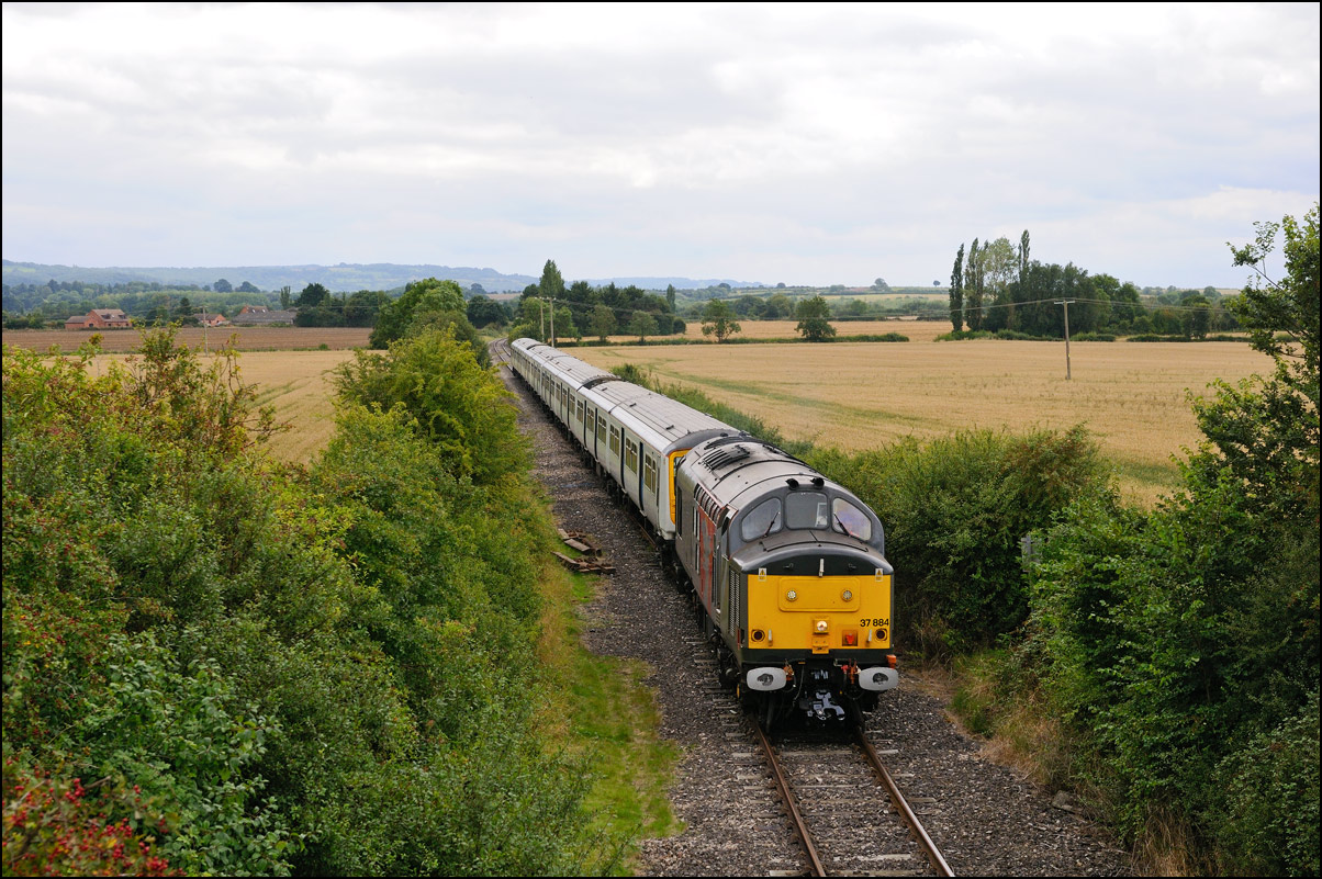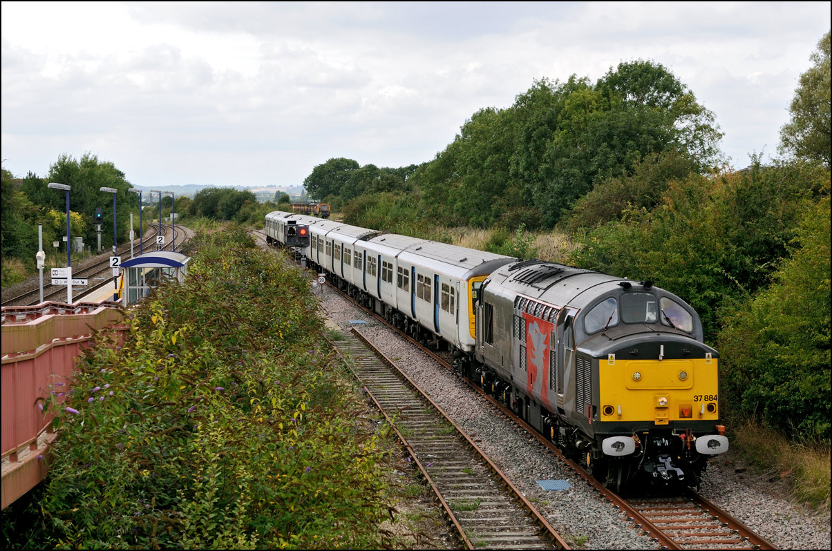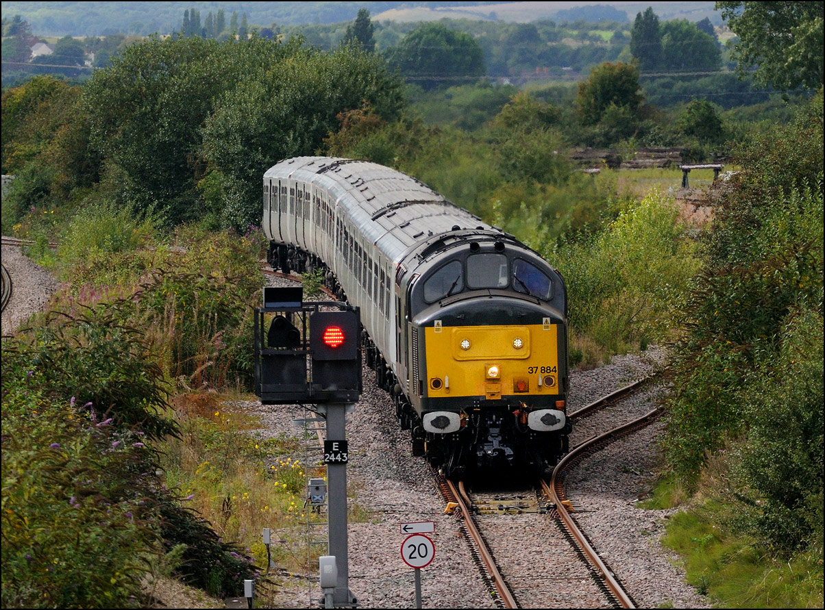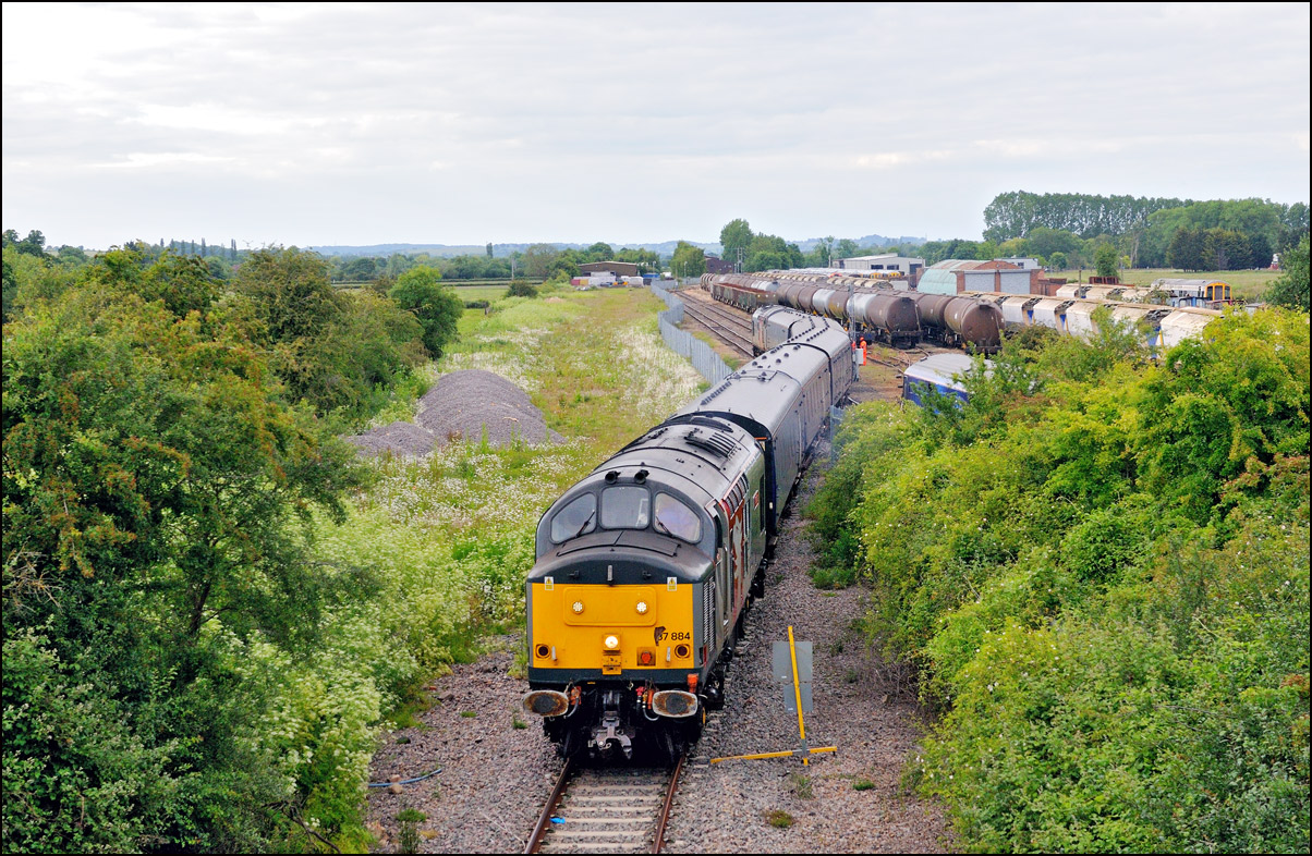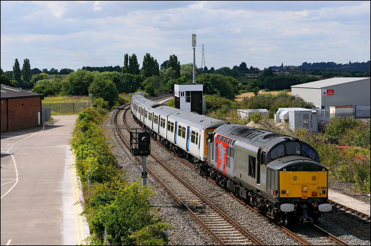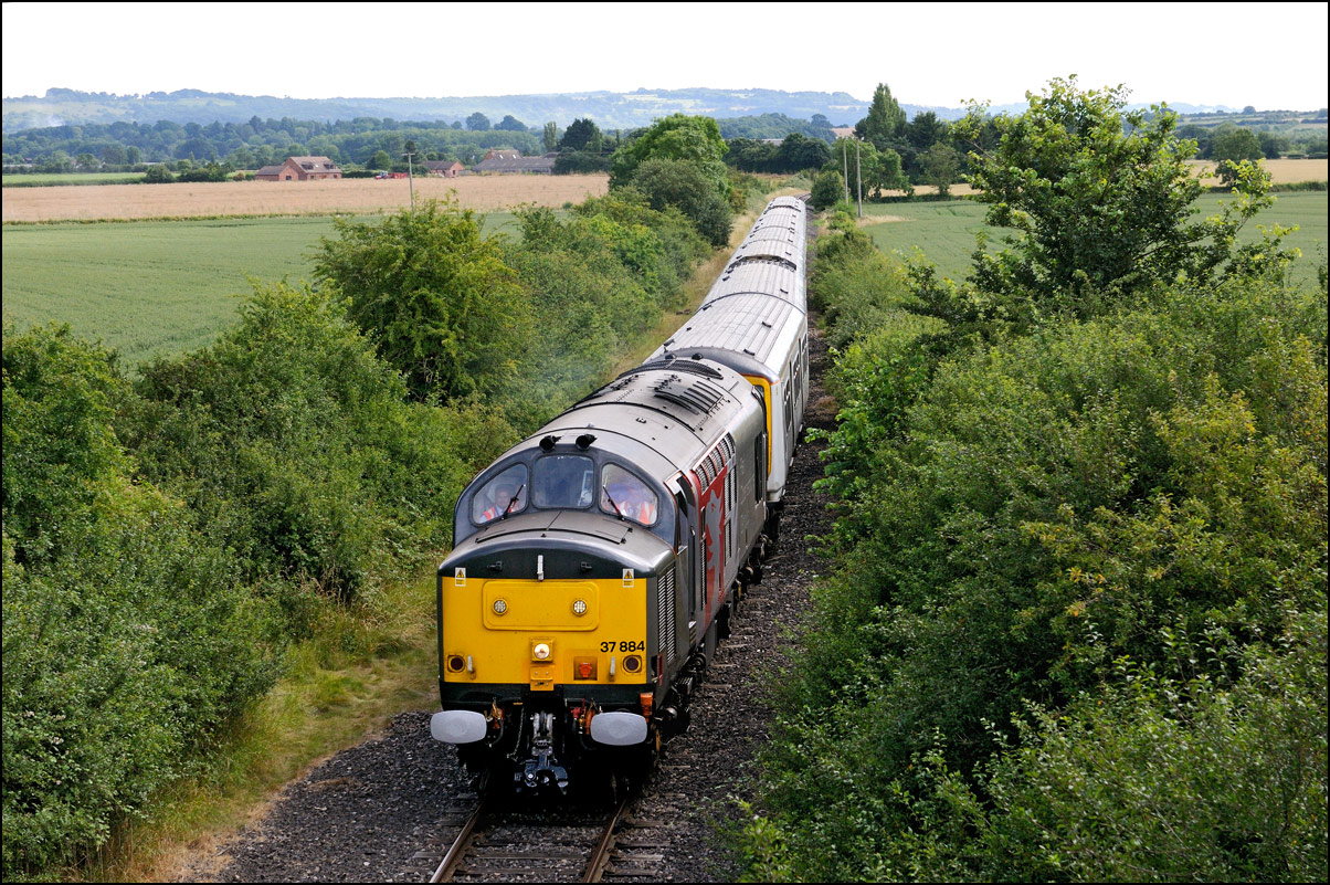 Here is the obligatory picture of a train receding from the camera at Honeybourne as it heads towards the single line staff hut and Long Marston. This time it's 37884 with LNWR 730207 running as 5Q94 from Derby Litchurch Lane virtually brushing the bushes which will soon make a shot here next to impossible. |