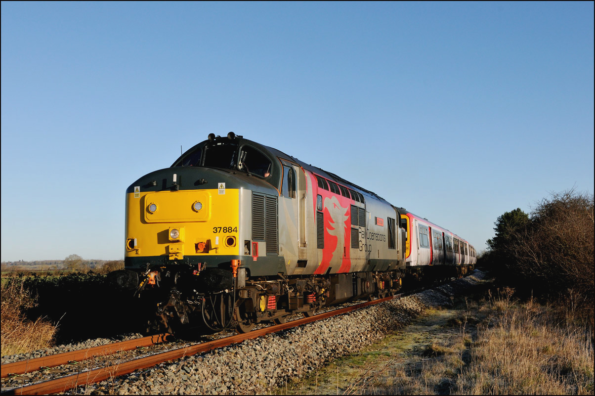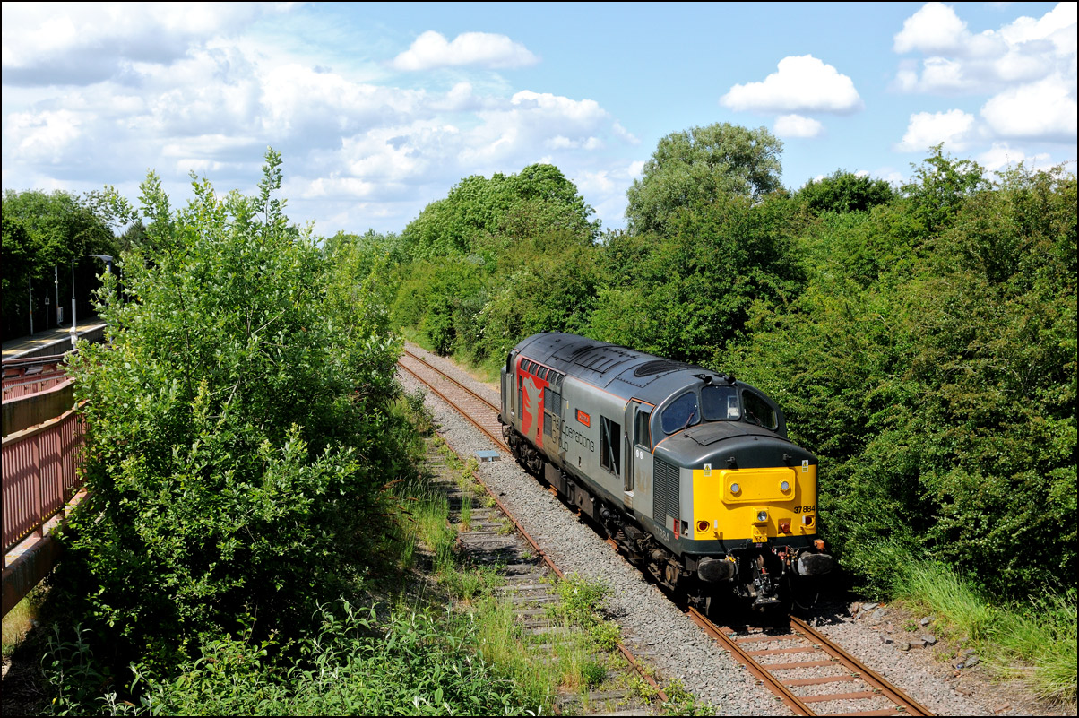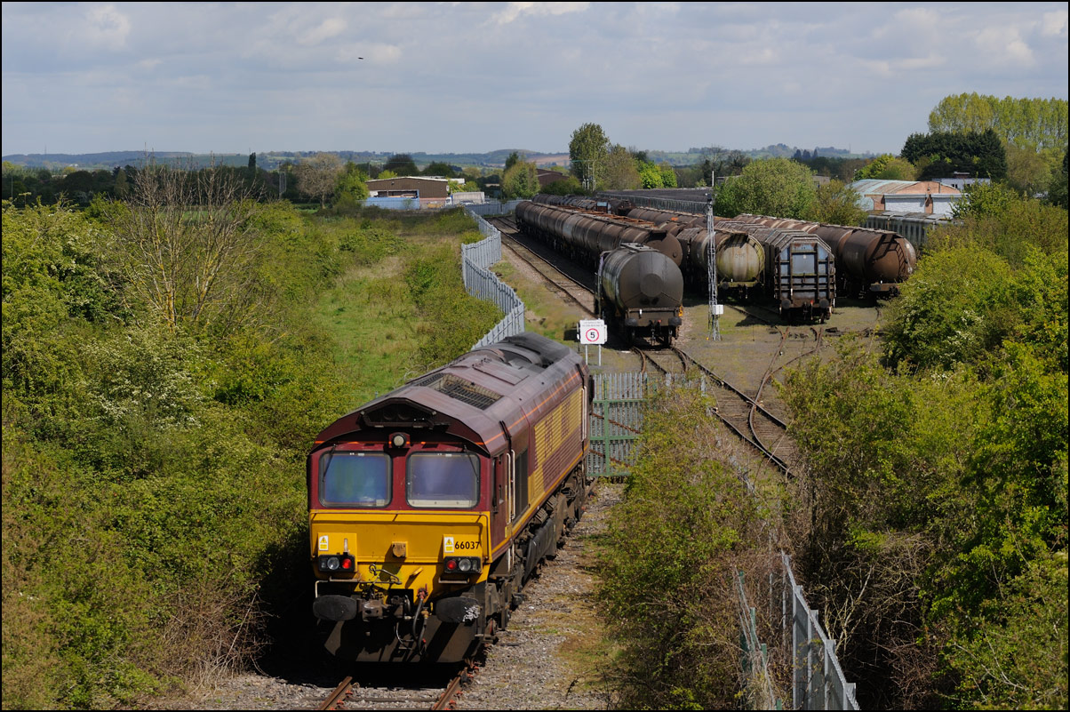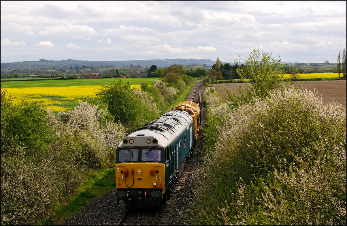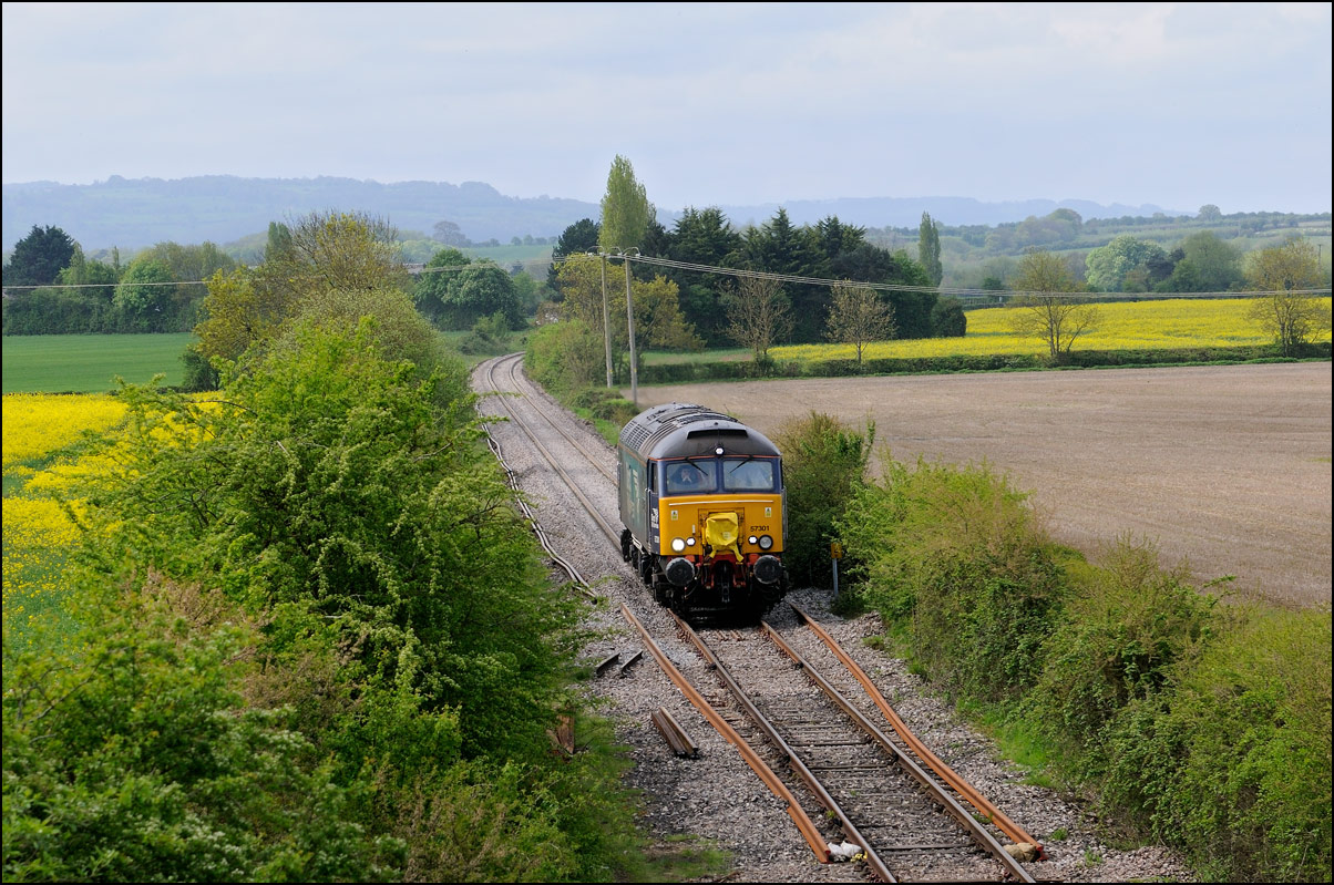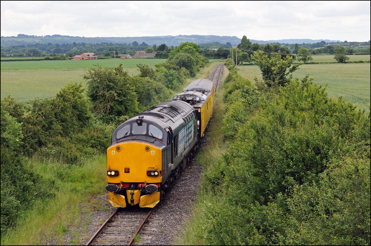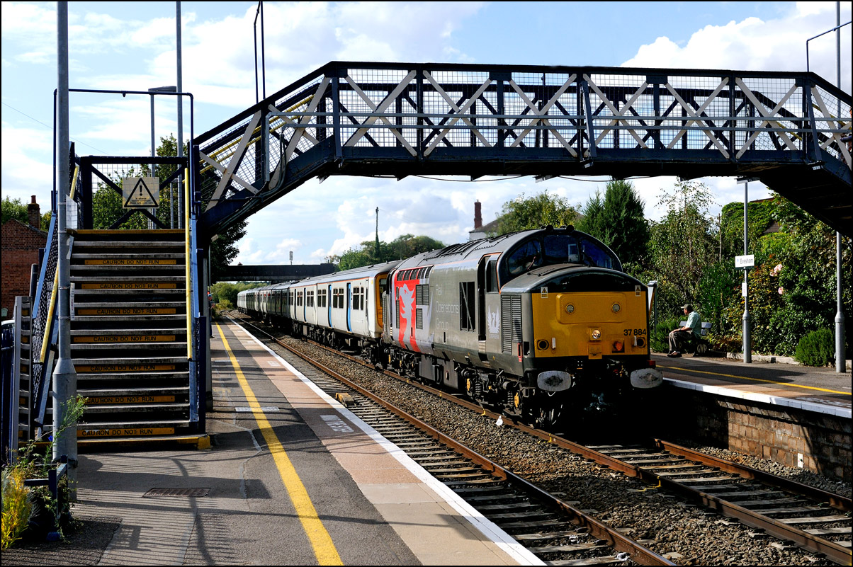 Here is the obligatory picture of a train receding from the camera at Honeybourne as it heads towards the single line staff hut and Long Marston. This time it's 37884 with LNWR 730207 running as 5Q94 from Derby Litchurch Lane virtually brushing the bushes which will soon make a shot here next to impossible. |