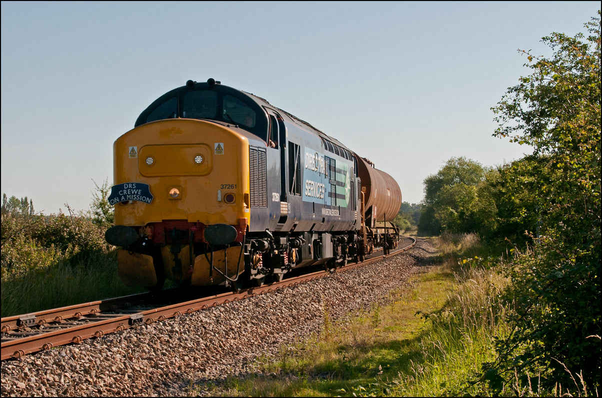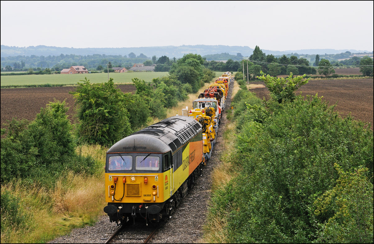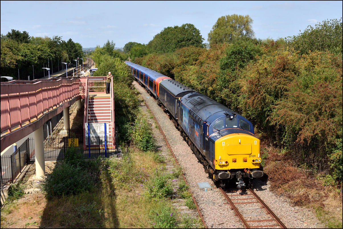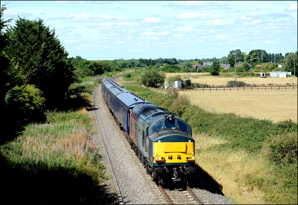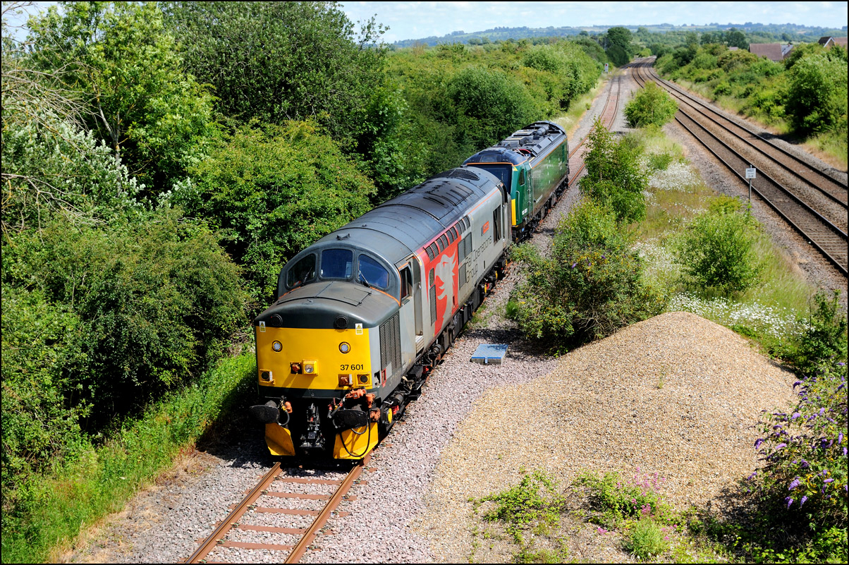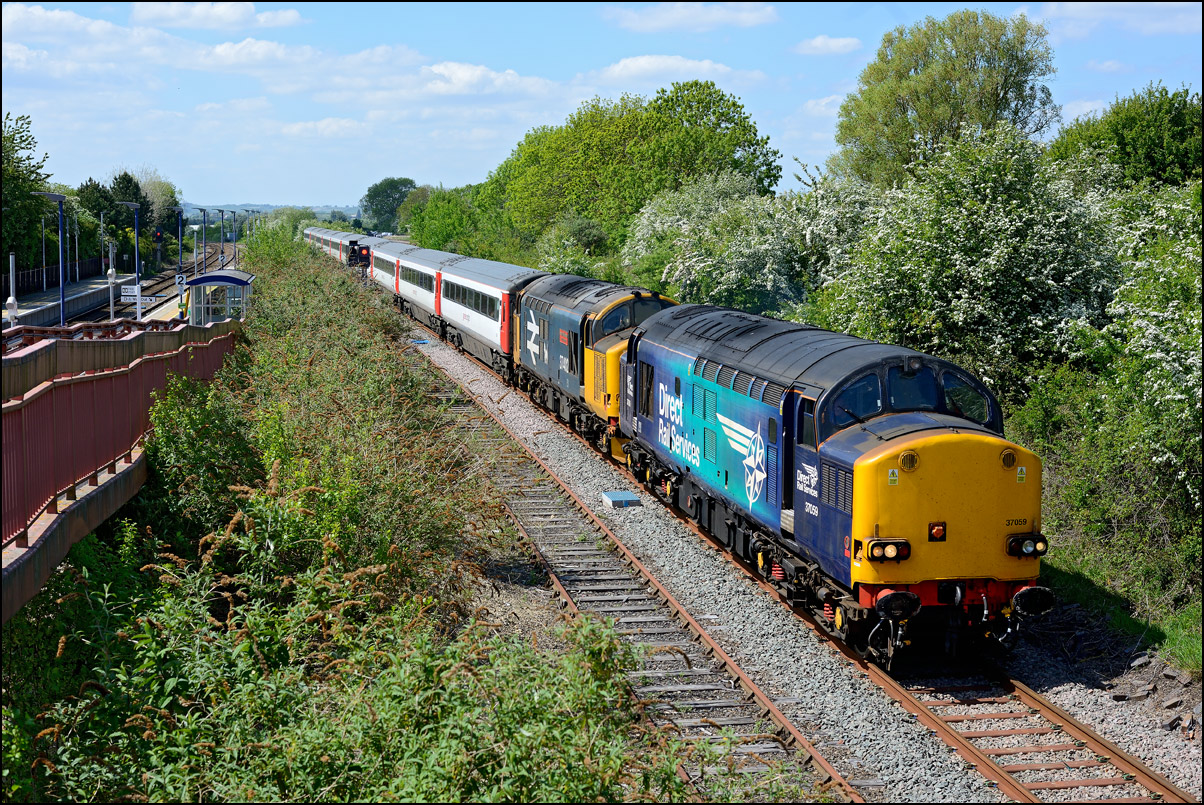 Here is the obligatory picture of a train receding from the camera at Honeybourne as it heads towards the single line staff hut and Long Marston. This time it's 37884 with LNWR 730207 running as 5Q94 from Derby Litchurch Lane virtually brushing the bushes which will soon make a shot here next to impossible. |