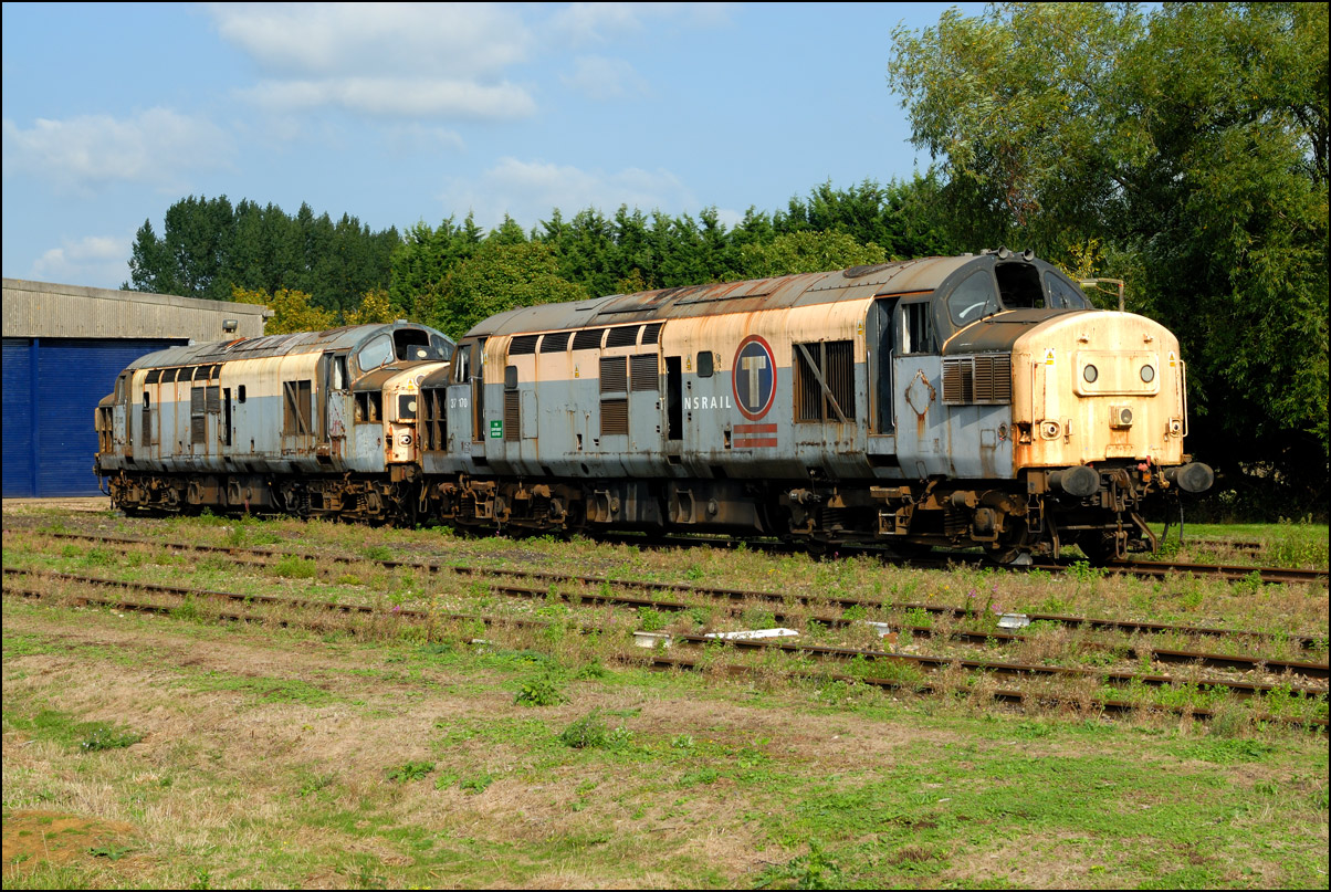 In September 2006 there were several class 37s stored at Long Marston some of which were there for storage before being scrapped. The front of the two shown here is 37170 was not scrapped but taken to Barrow Hill where it was refurbished, renumbered to 97302 and named Ffestiniog & Welsh Highland Railways. Looking very different on 26 April 2012 I saw it again at Hatton working a VSTP 6O25 from Bescot to Eastleigh. The other loocmotive, 37010, did not survive at was scrapped within a year or so by the Harry Needle Railway Company. |