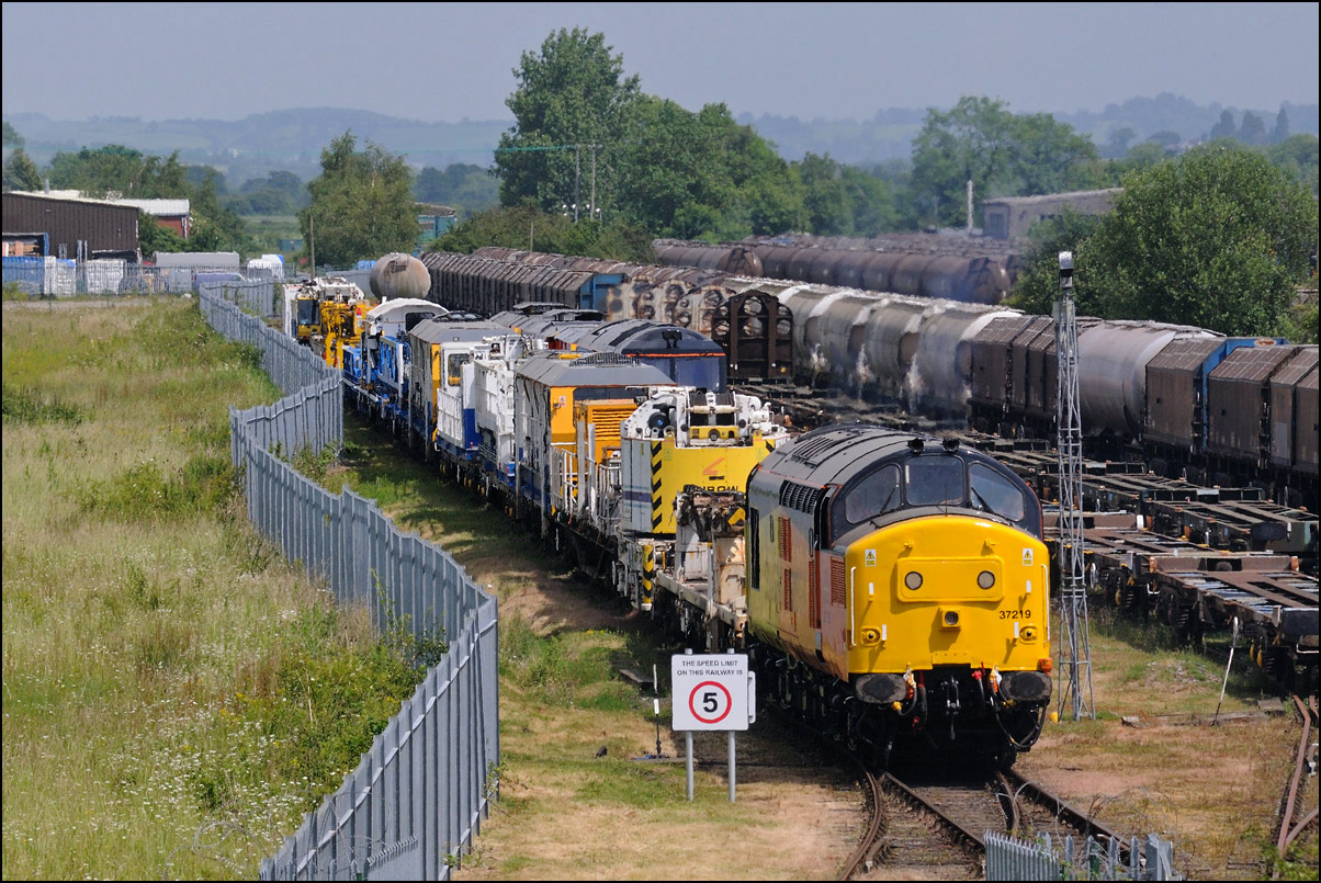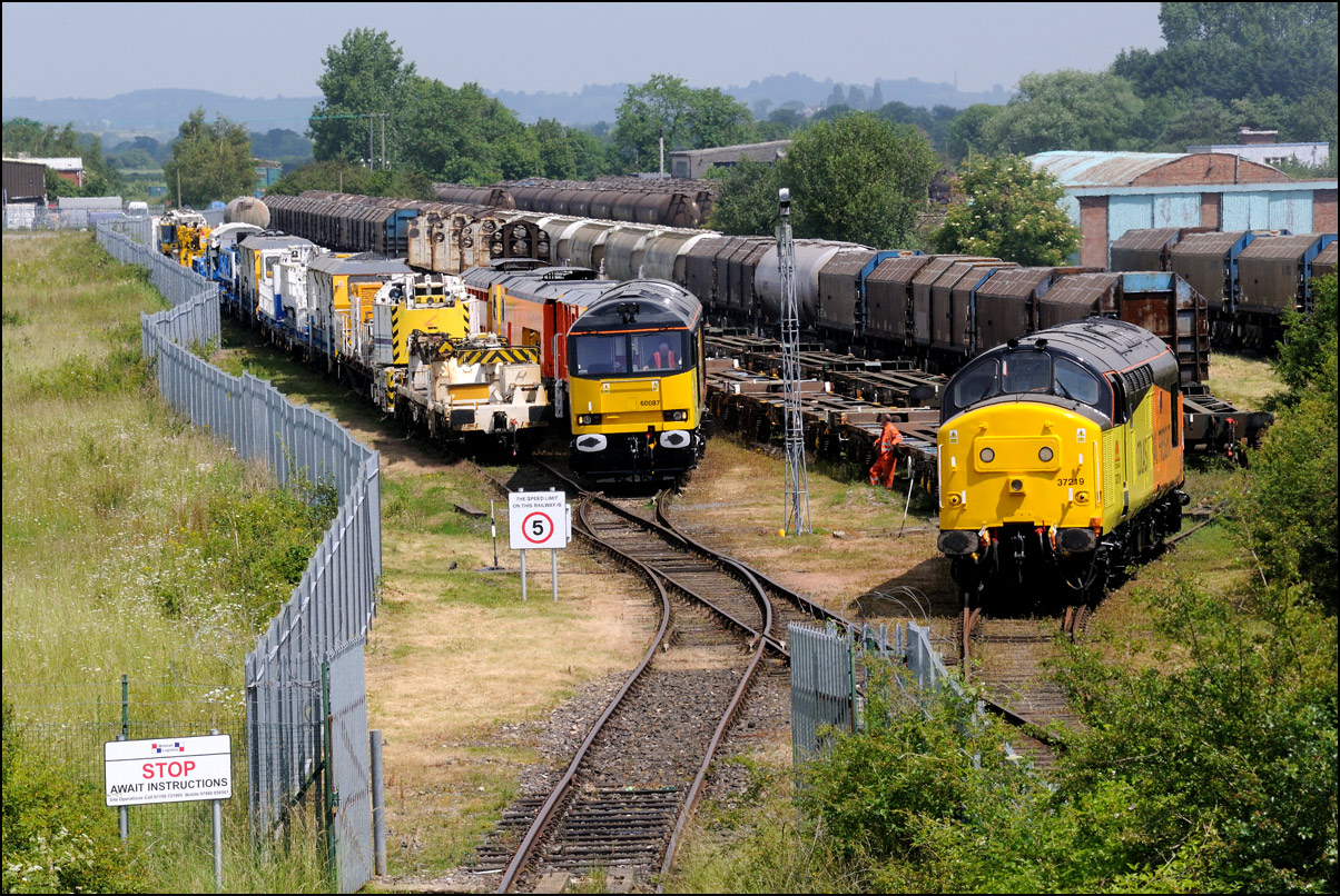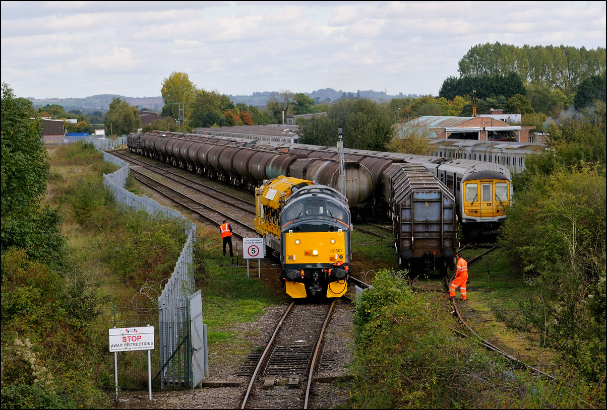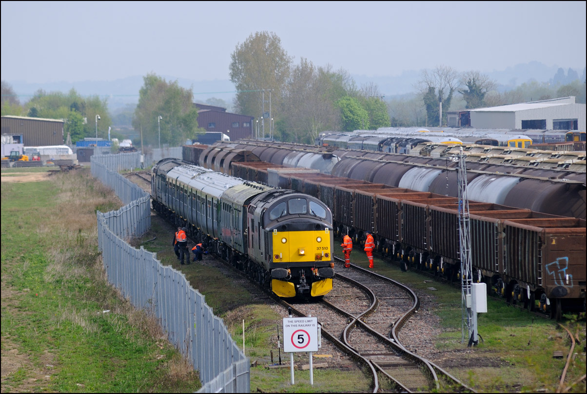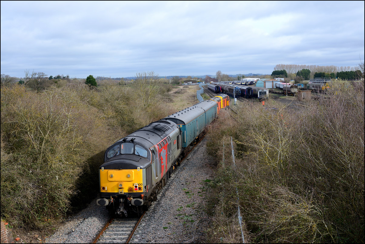 After taking the shot above, I managed to arrive at the depot just in time to obtain this picture of 37235 about to enter the exchange sidings. There was clearly some return traffic and the wagons are seen on the 2nd road from the left. The trackbed of the former GWR main line to Stratford-upon-Avon can be seen on the left. There have been many suggestions over the years that this should be relaid to connect Stratford to the Cotswold line. |