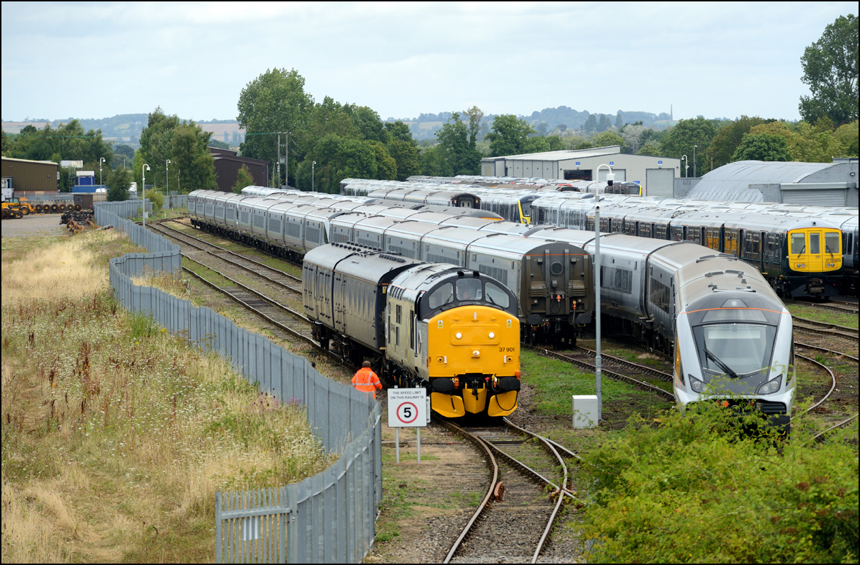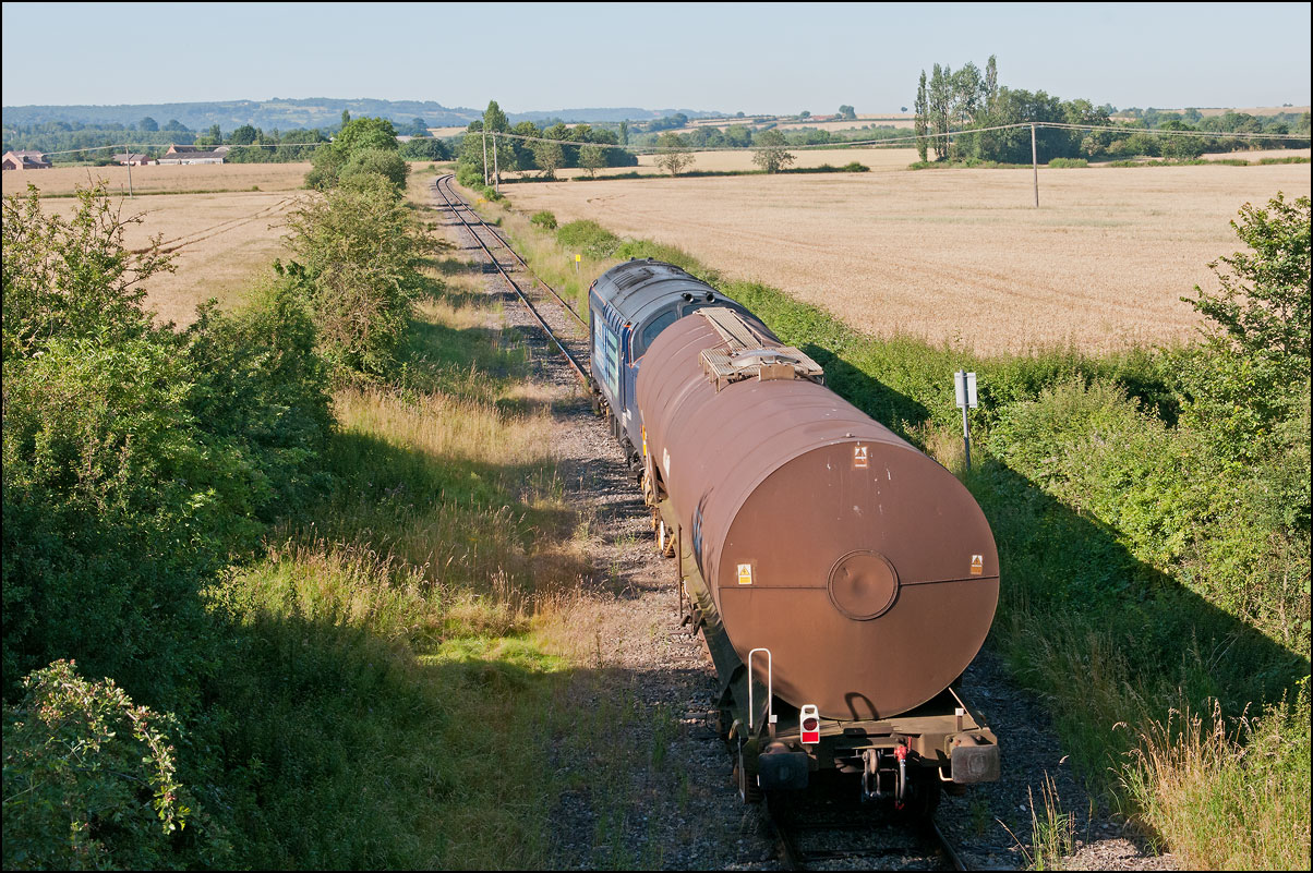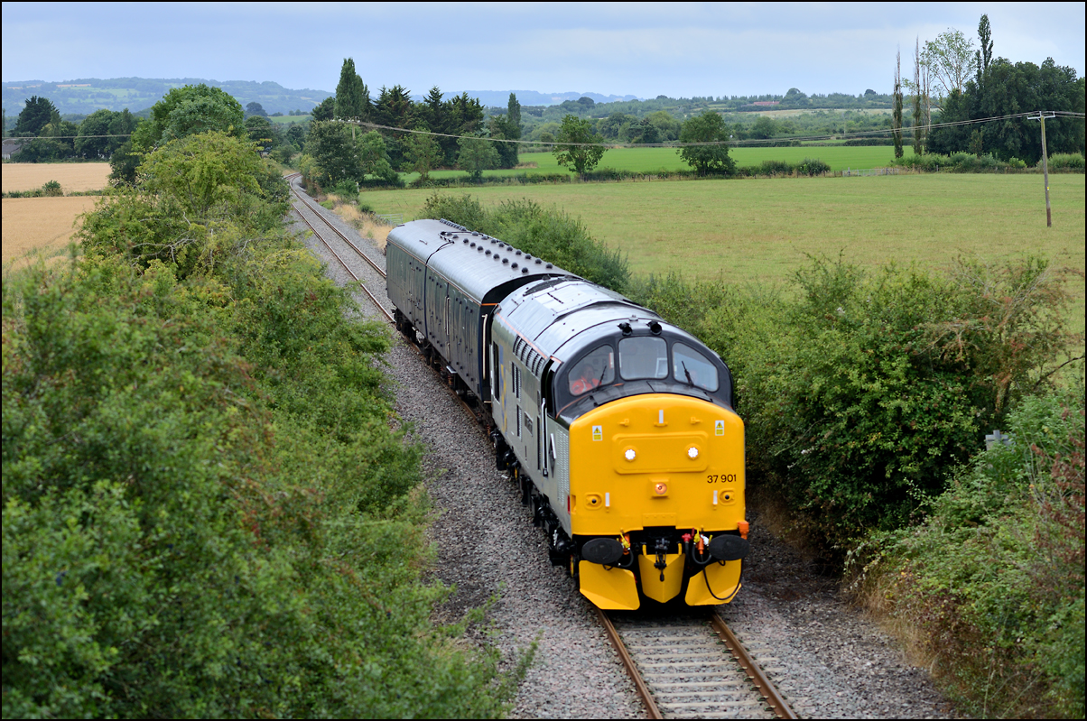 After a very expensive rail-polishing exercise 37901 is seen here leaving Long Marston on 7 August 2024 with exactly the same load with which it had arrived a short while before. I was happy enough: at least it wasn't just a light engine and it saved a drive around the Worcestershire roads currently plagued with hoardes of roadworks. |
