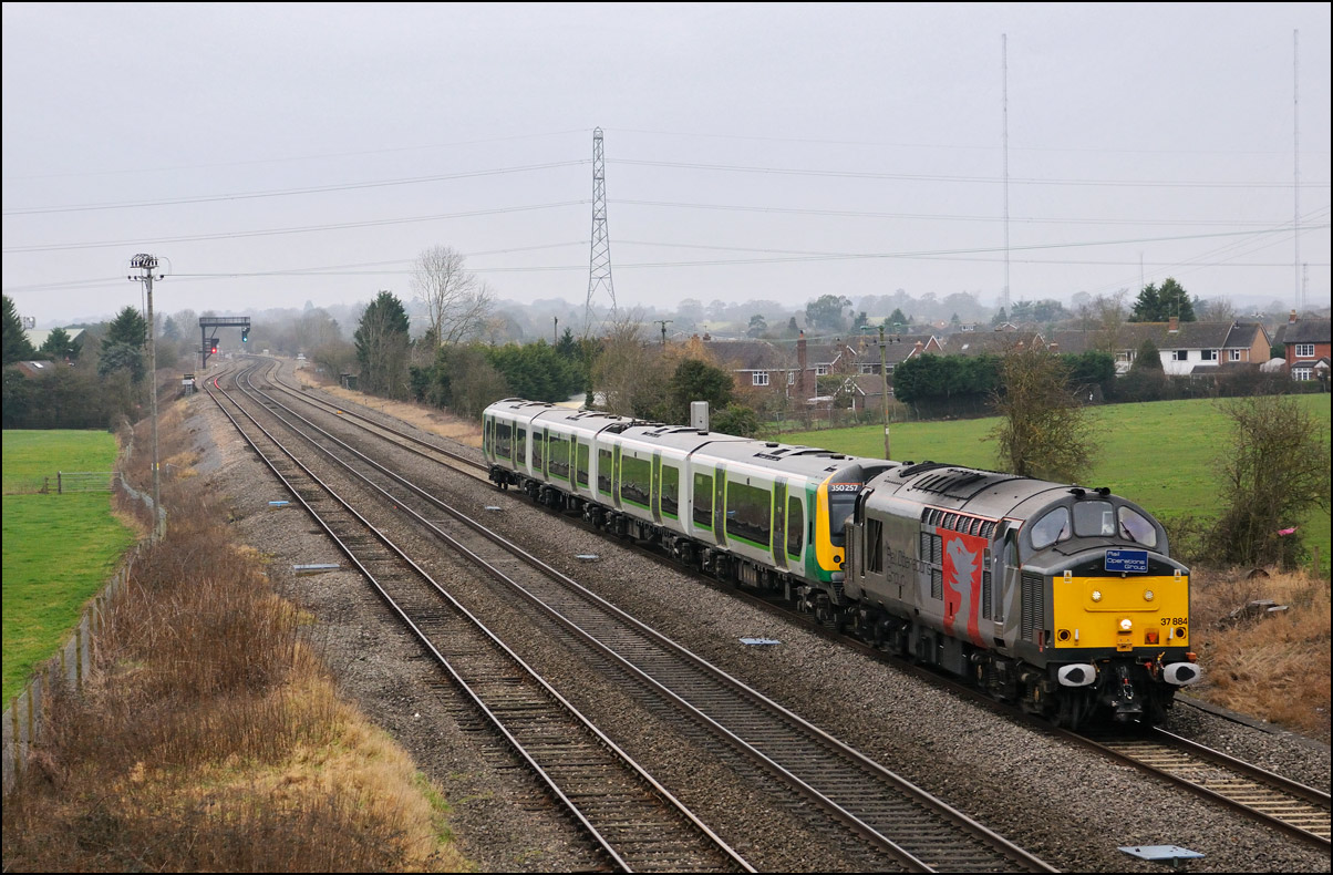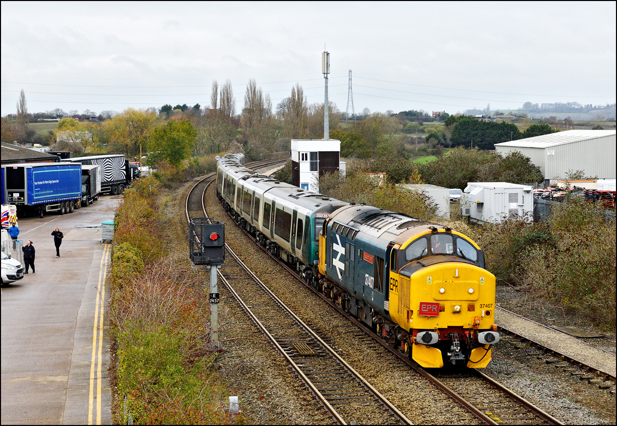 Two stock movements to Long Marston were planned for Monday 24 November 2025. The first was yet another unit drag with a class 37, this time 37407, with a couple of class 350/2 EMUs running from Northampton. My enthusiasm for this sort of thing has waned but as I needed to go in the Evesham direction for something else thought that a short diversion would be worthwhile even though the light was dreadful. Here then is 5Q91 with 37407 hauling 350263 + 350260 past the signalbox and towards Evesham station. |