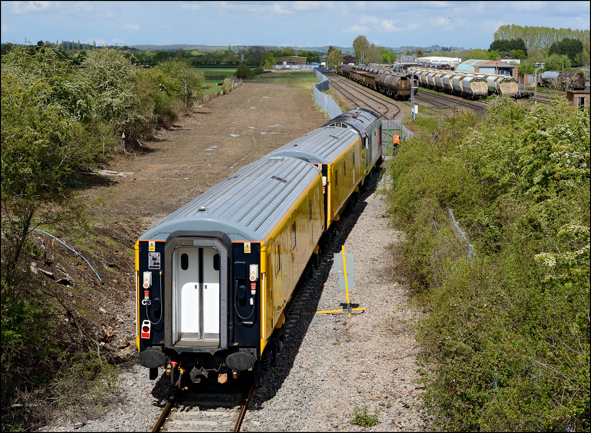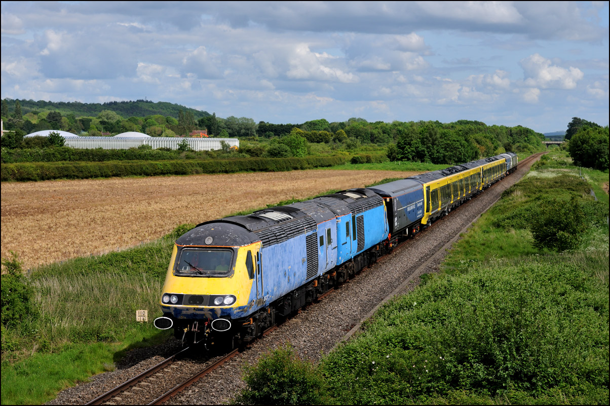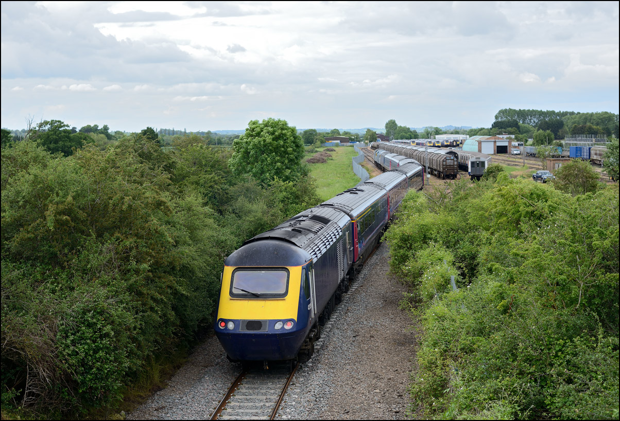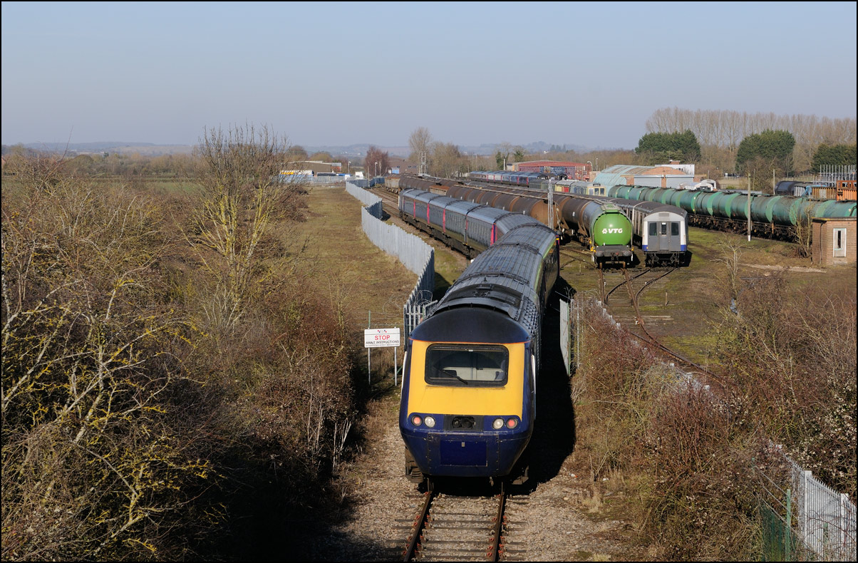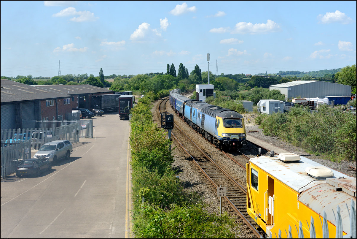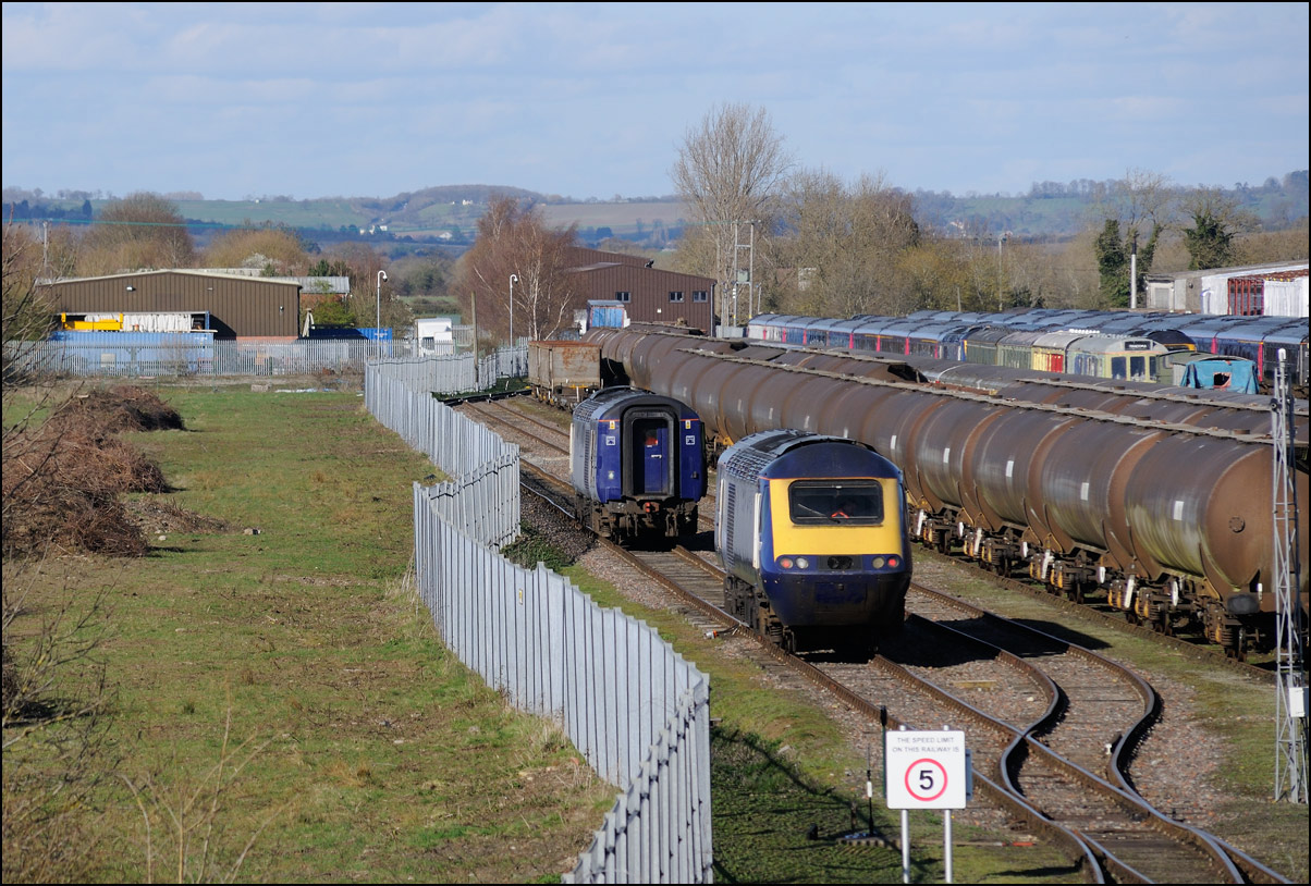 This is not a particularly inspiring photograph, but it does show the NR HST power cars about to enter the Long Marston site. The red Network Rail stickers have been removed from this side, but were still in place on the other. |