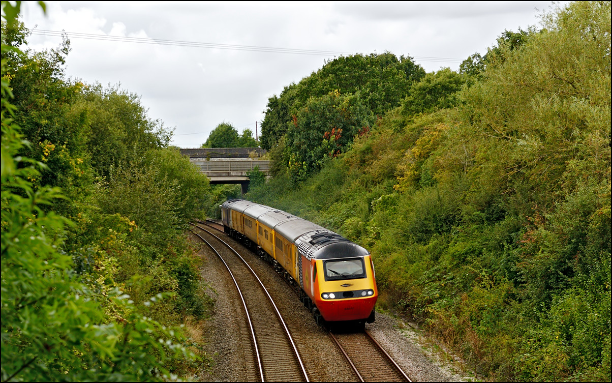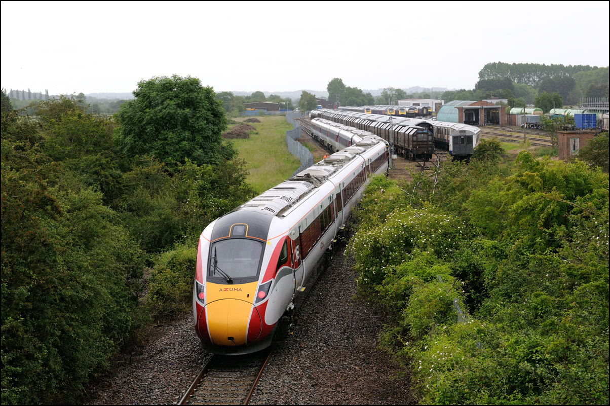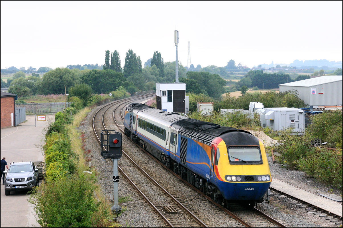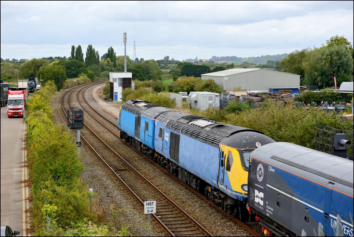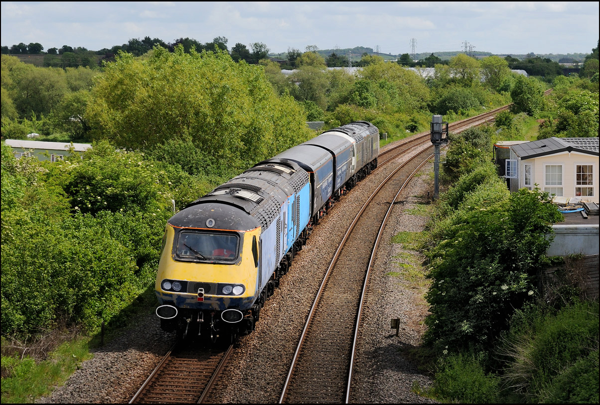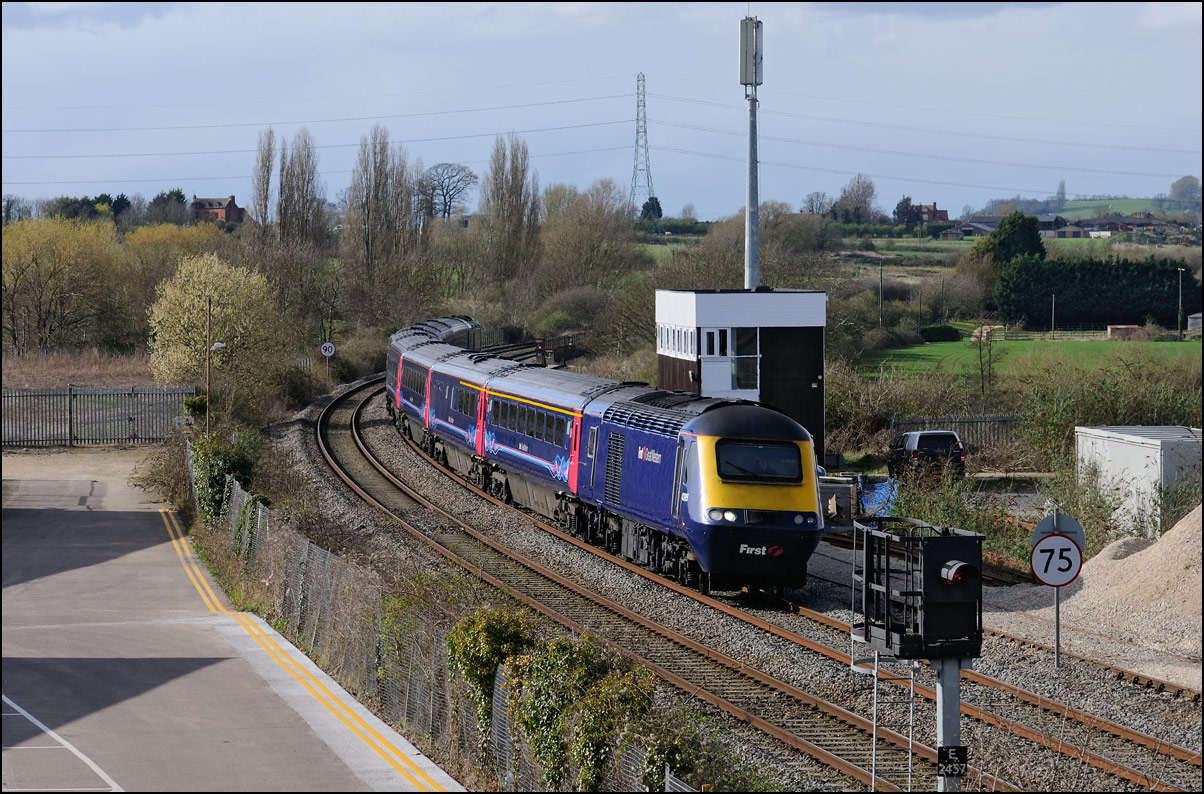This is not a particularly inspiring photograph, but it does show the NR HST power cars about to enter the Long Marston site. The red Network Rail stickers have been removed from this side, but were still in place on the other. |
