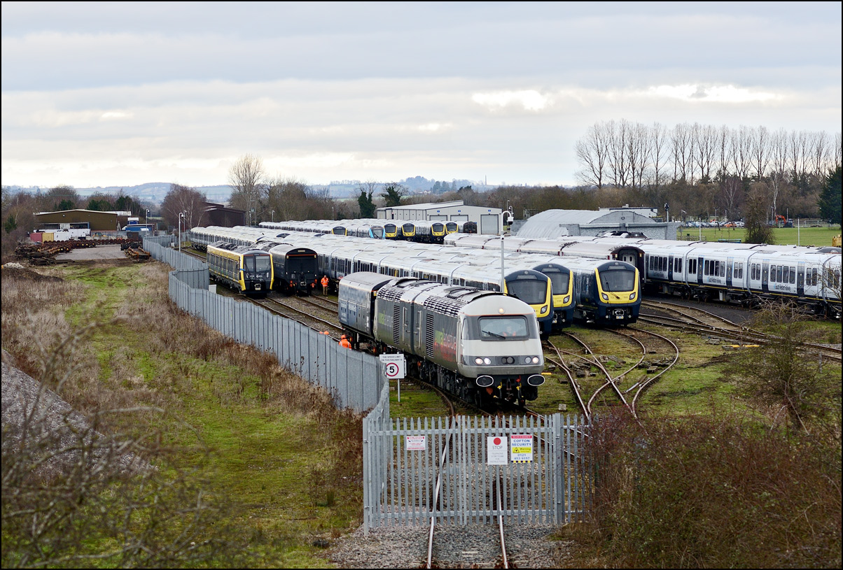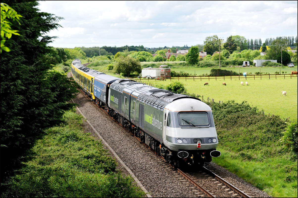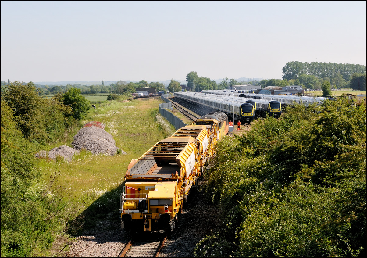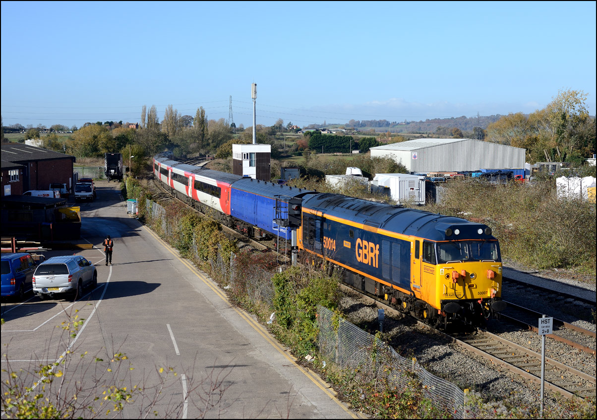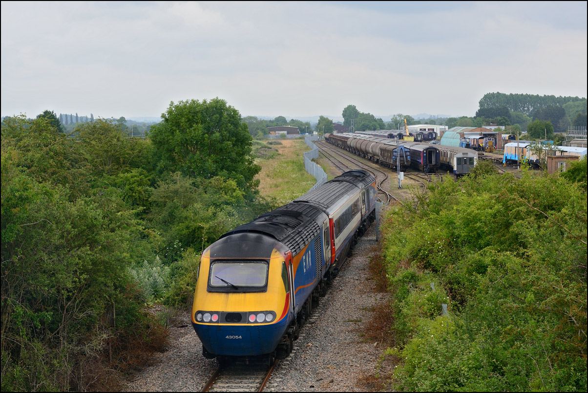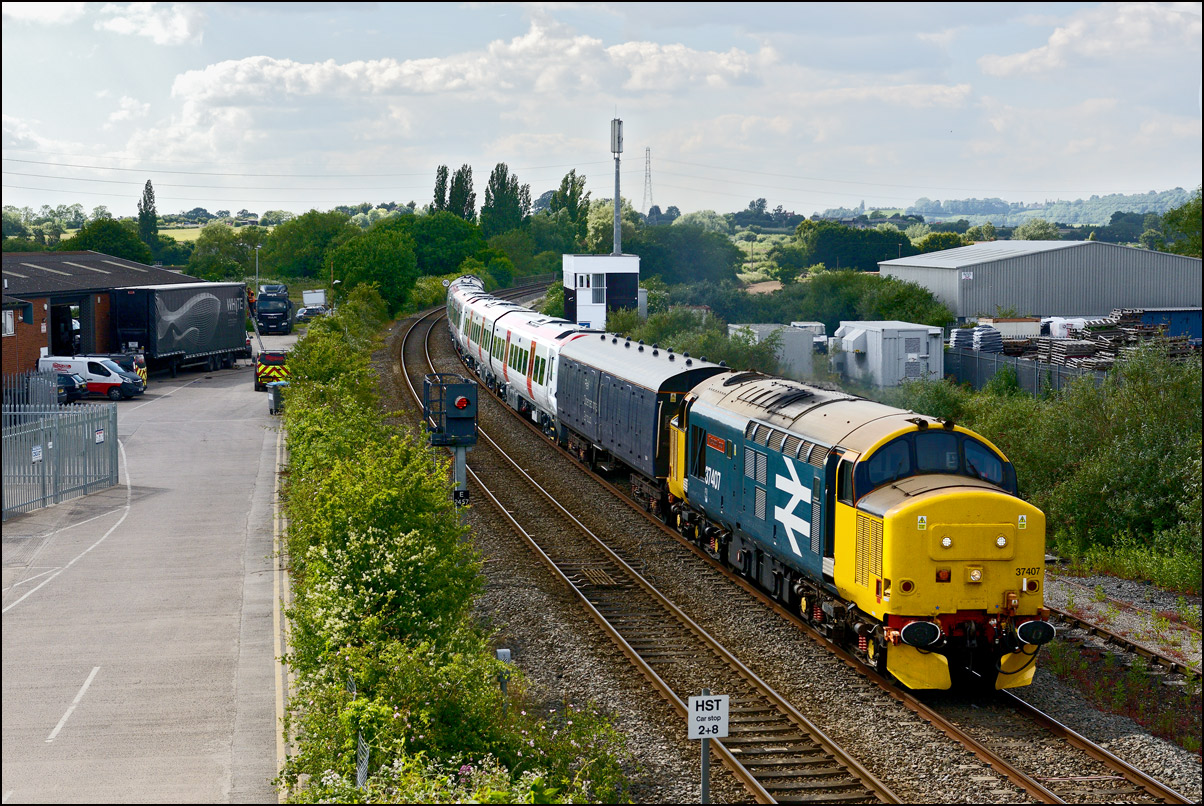 This is not a particularly inspiring photograph, but it does show the NR HST power cars about to enter the Long Marston site. The red Network Rail stickers have been removed from this side, but were still in place on the other. |