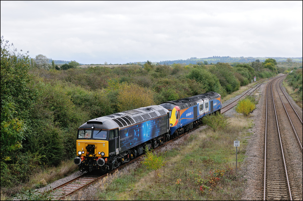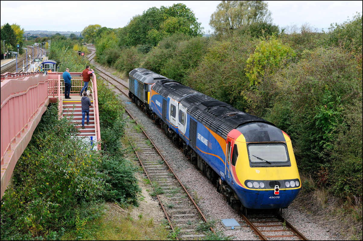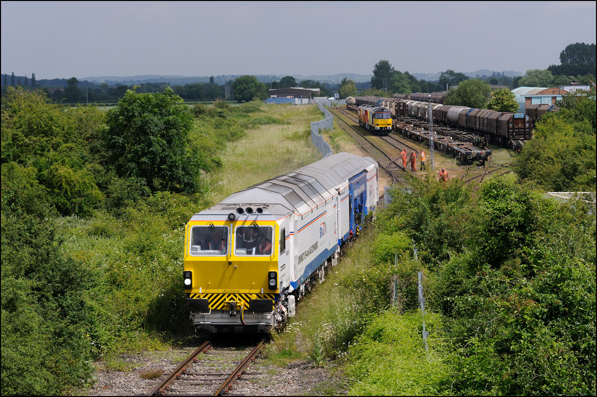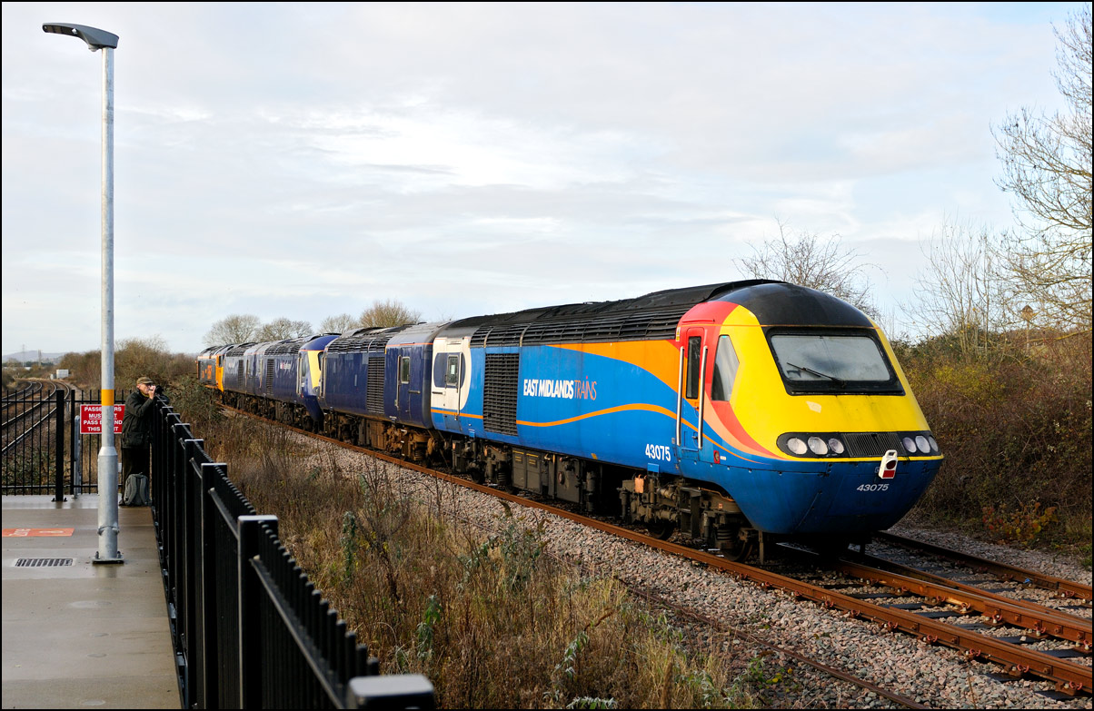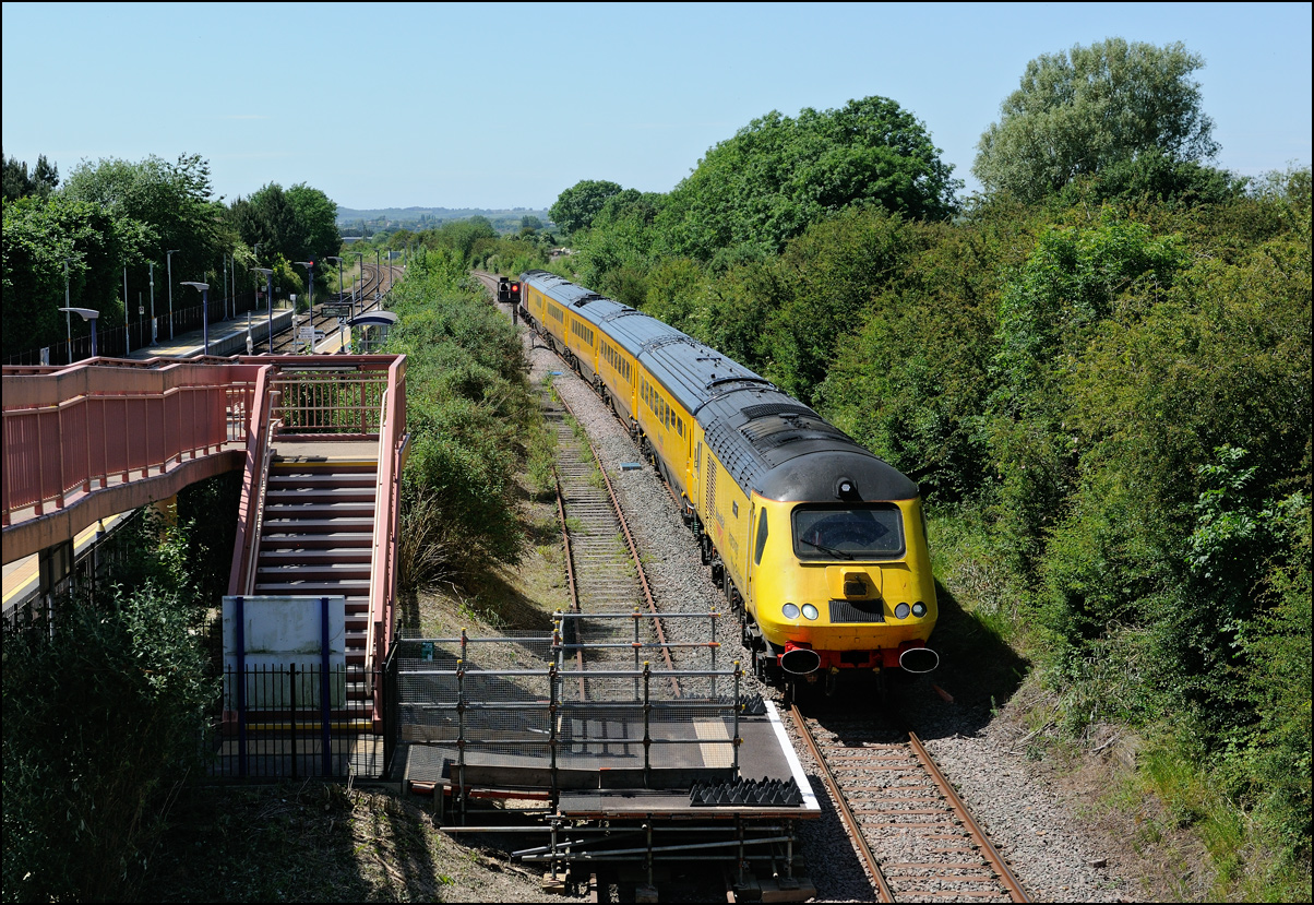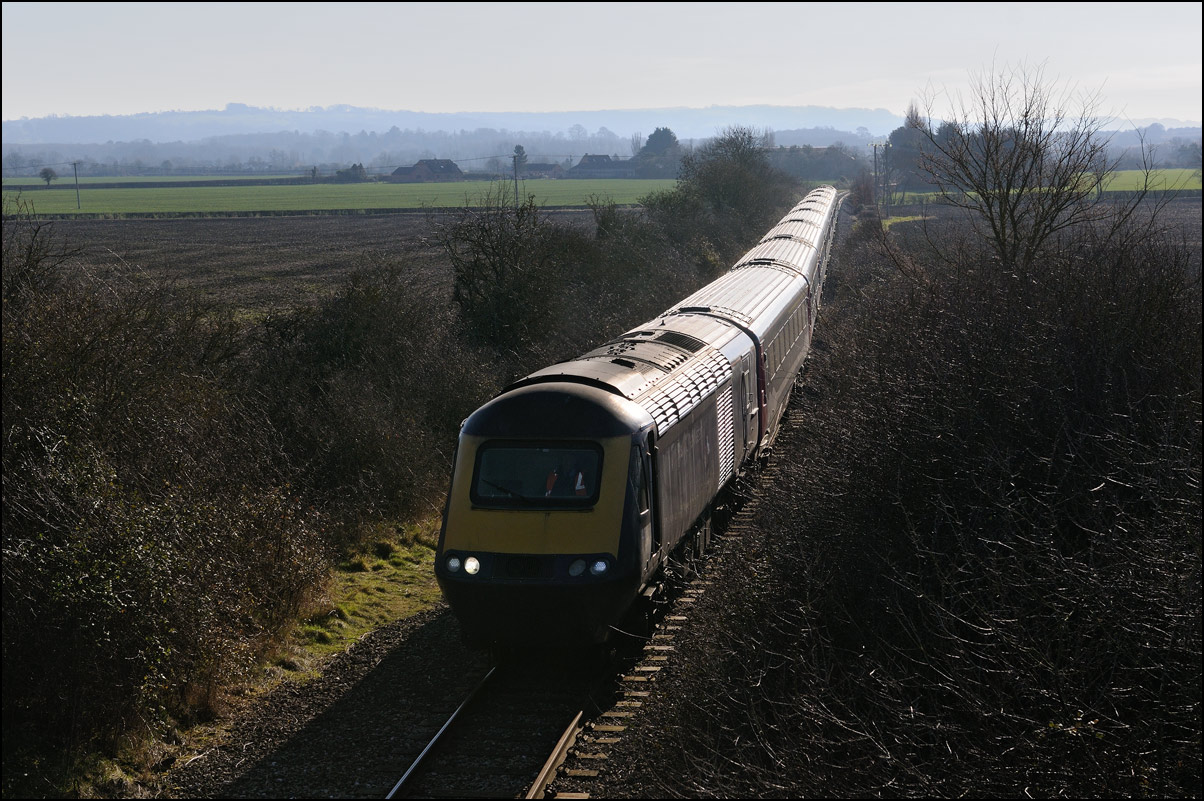 This is not a particularly inspiring photograph, but it does show the NR HST power cars about to enter the Long Marston site. The red Network Rail stickers have been removed from this side, but were still in place on the other. |