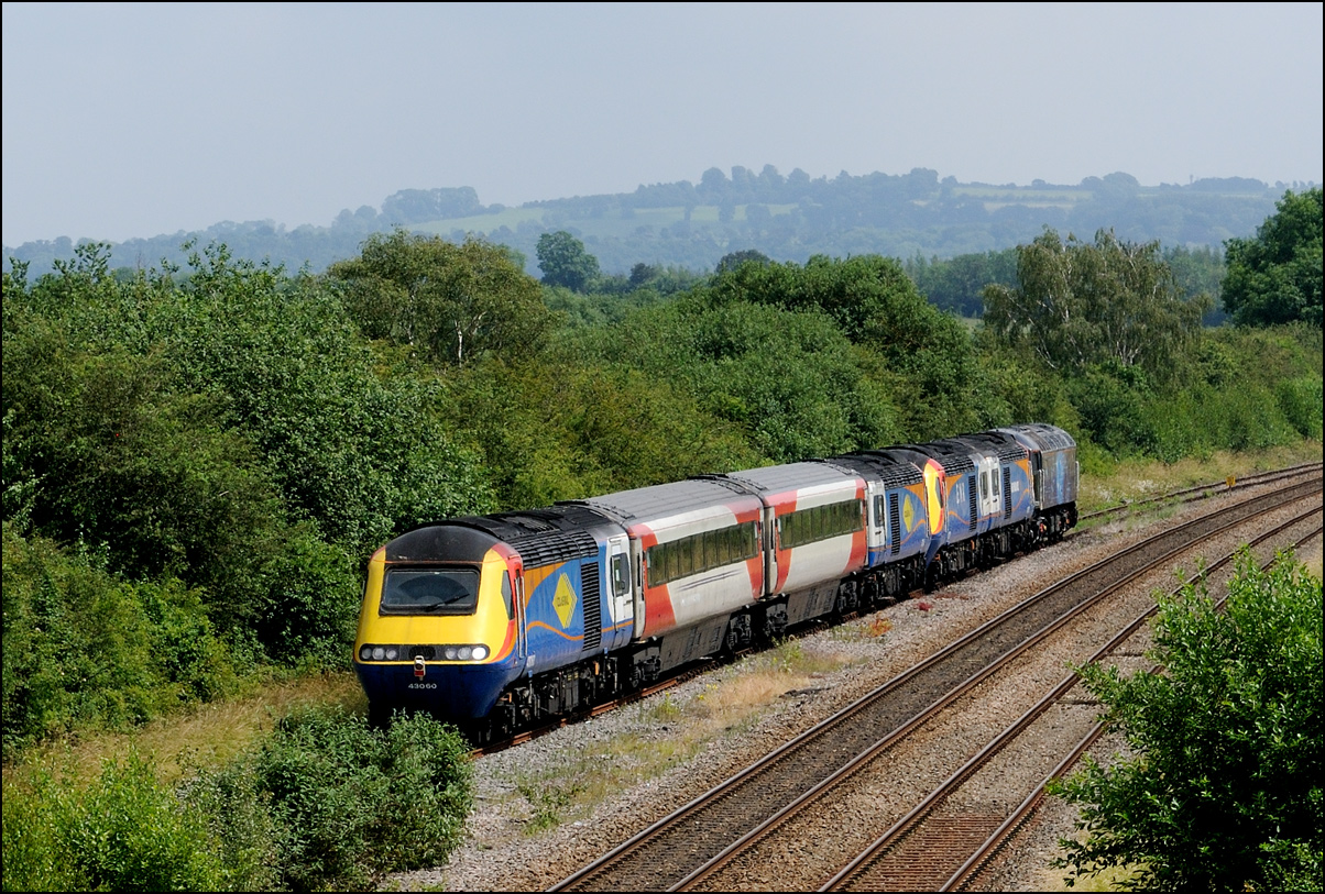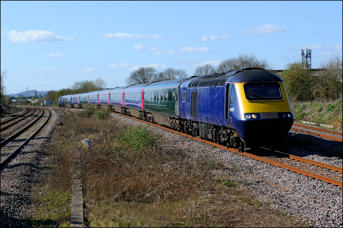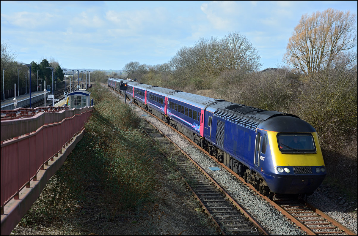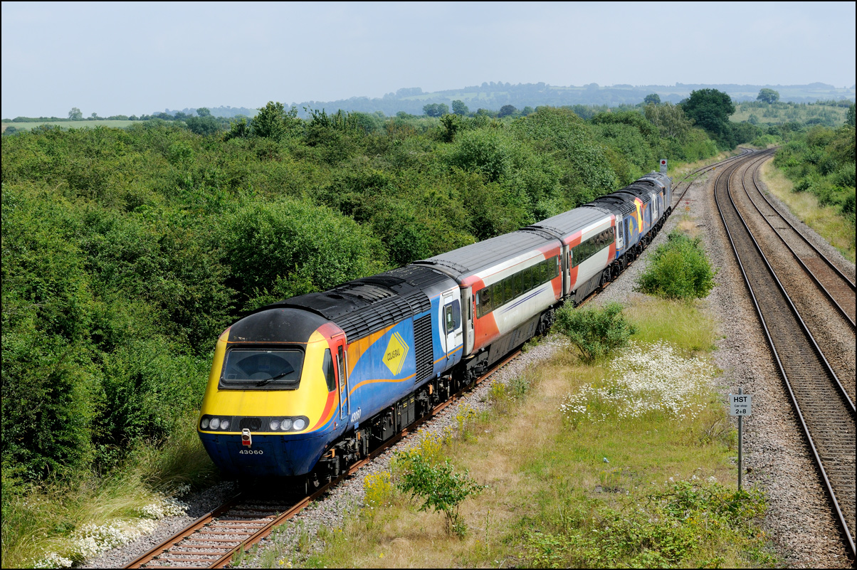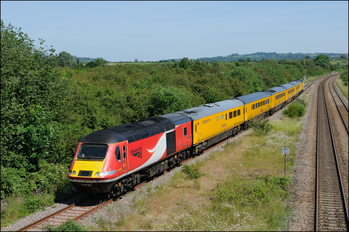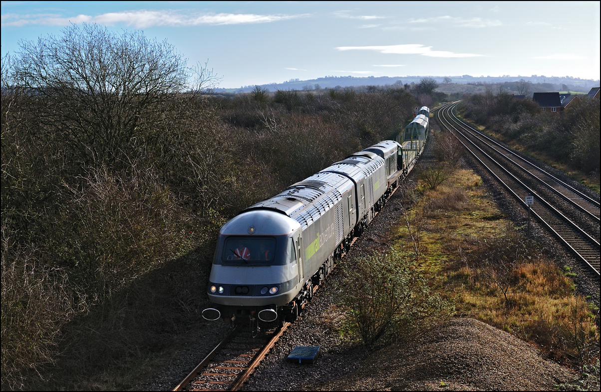 This is not a particularly inspiring photograph, but it does show the NR HST power cars about to enter the Long Marston site. The red Network Rail stickers have been removed from this side, but were still in place on the other. |