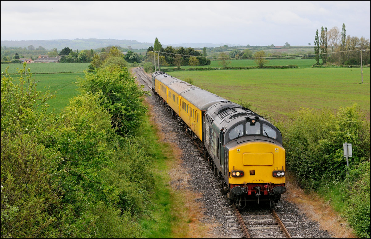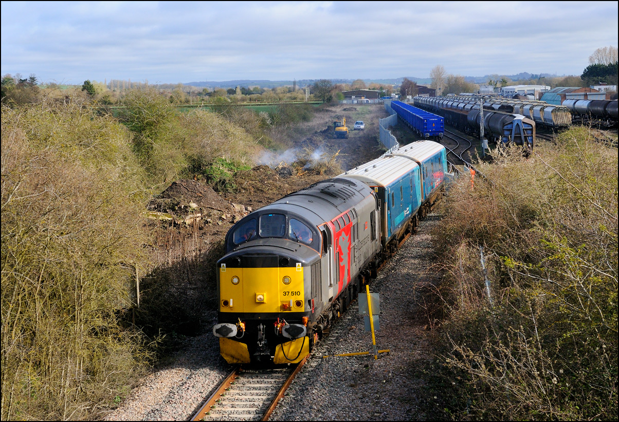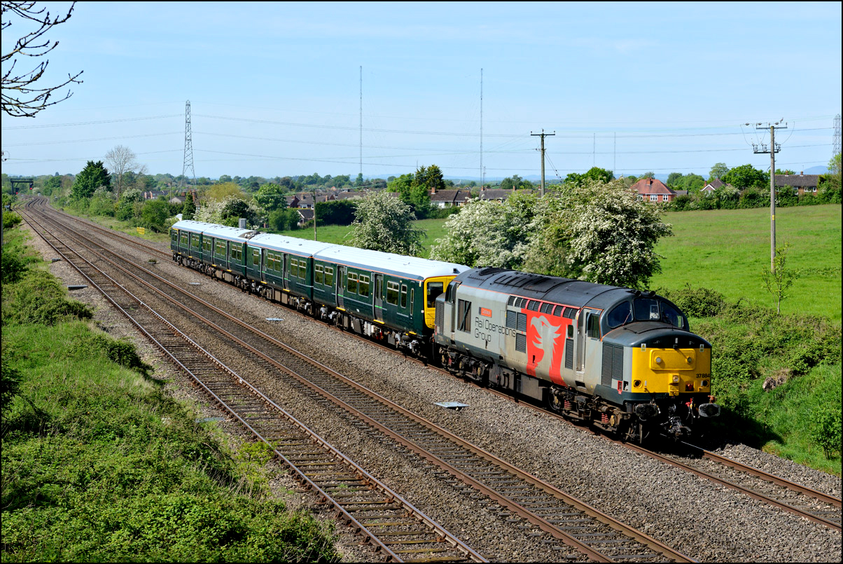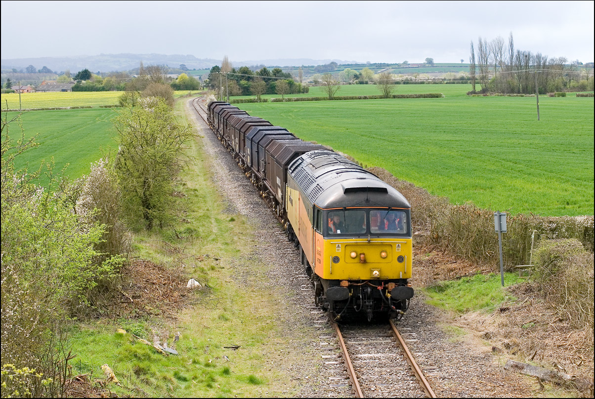 As I left Lower Moor with the intention of going home and into the dry, I saw that the sky to the west was rapidly clearing. As it still early, just after 2pm, I decided to go to Croome Perry wood for a final photograph of 37245 after it had run round at Worcester and returned south - it was booked to run to Didcot via Gloucester and Swindon. Just after 3pm the sky finally cleared and 6Z36 gave me the only sunny shot of the afternoon. I would have much preferred the branch line shots to have been in the sun rather than this one on the main Birmingham to Gloucester line - pictures away from the main line are always more satisfying. |