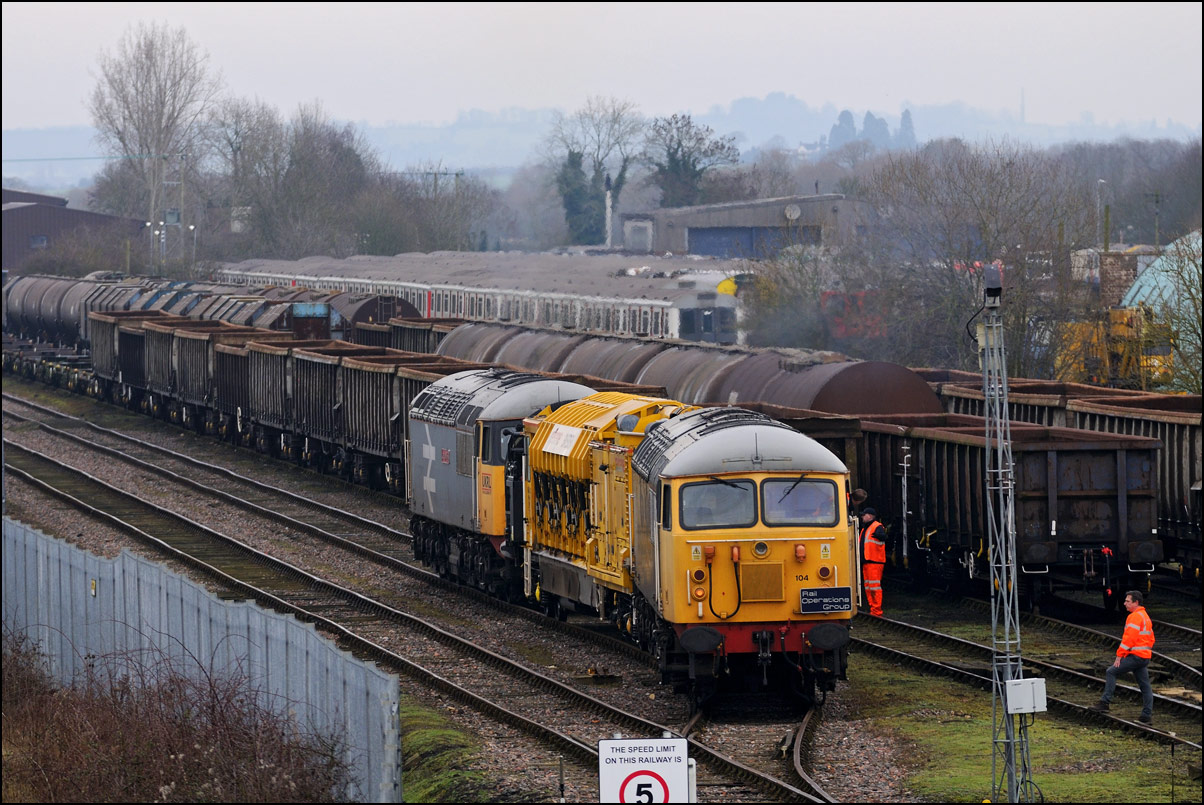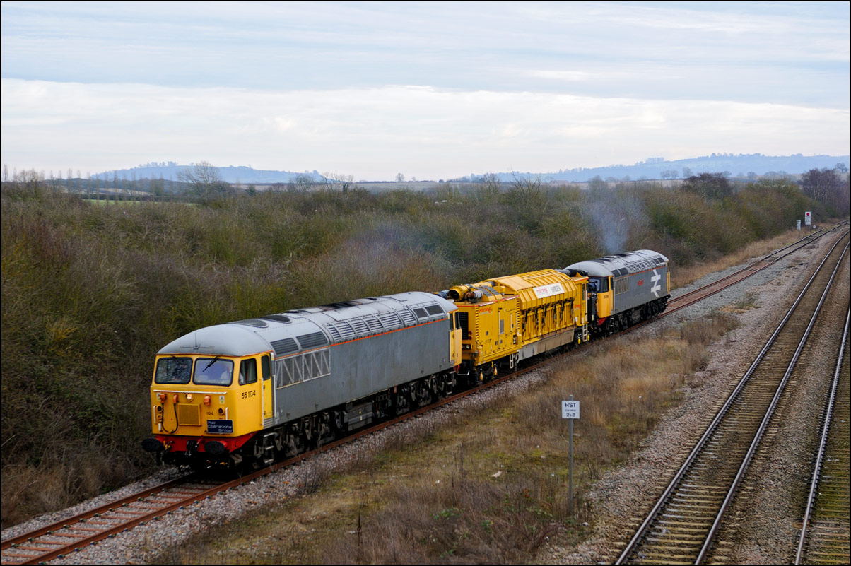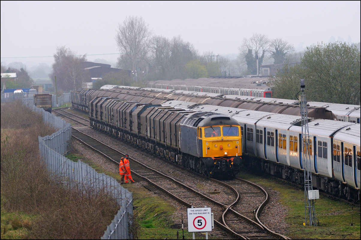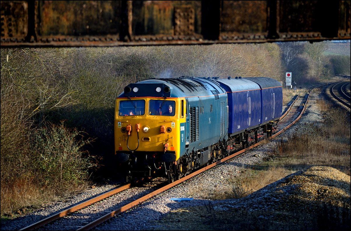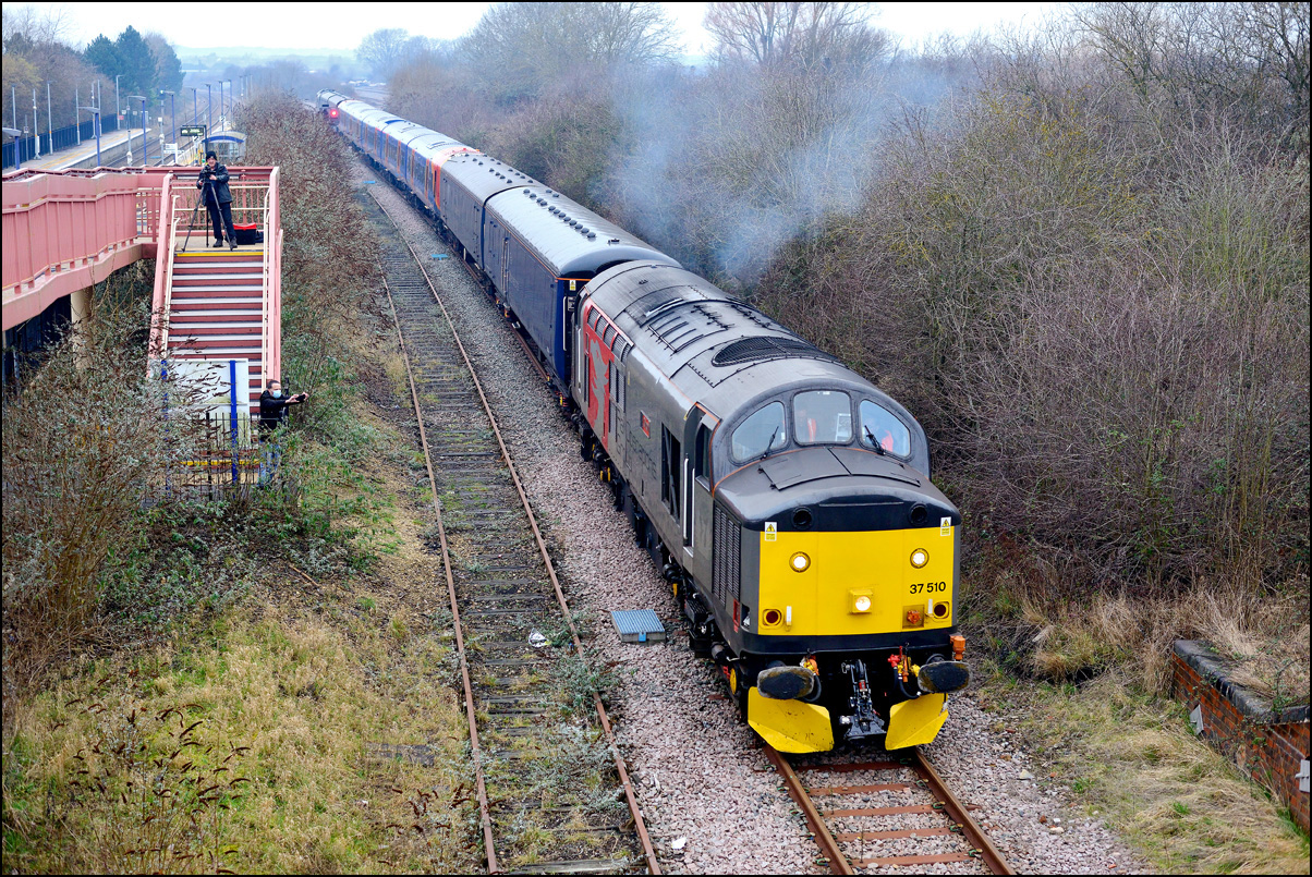 As 37901 was the more photogenic locomotive on 5Q99 from Wimbledon to Long Marston on 10 December 2024 I crossed the road for another shot as went away towards the Staff Hut. The vegetation is a bit less intrusive than earlier in the year but this is still as wide a clear image as can be achieved. |