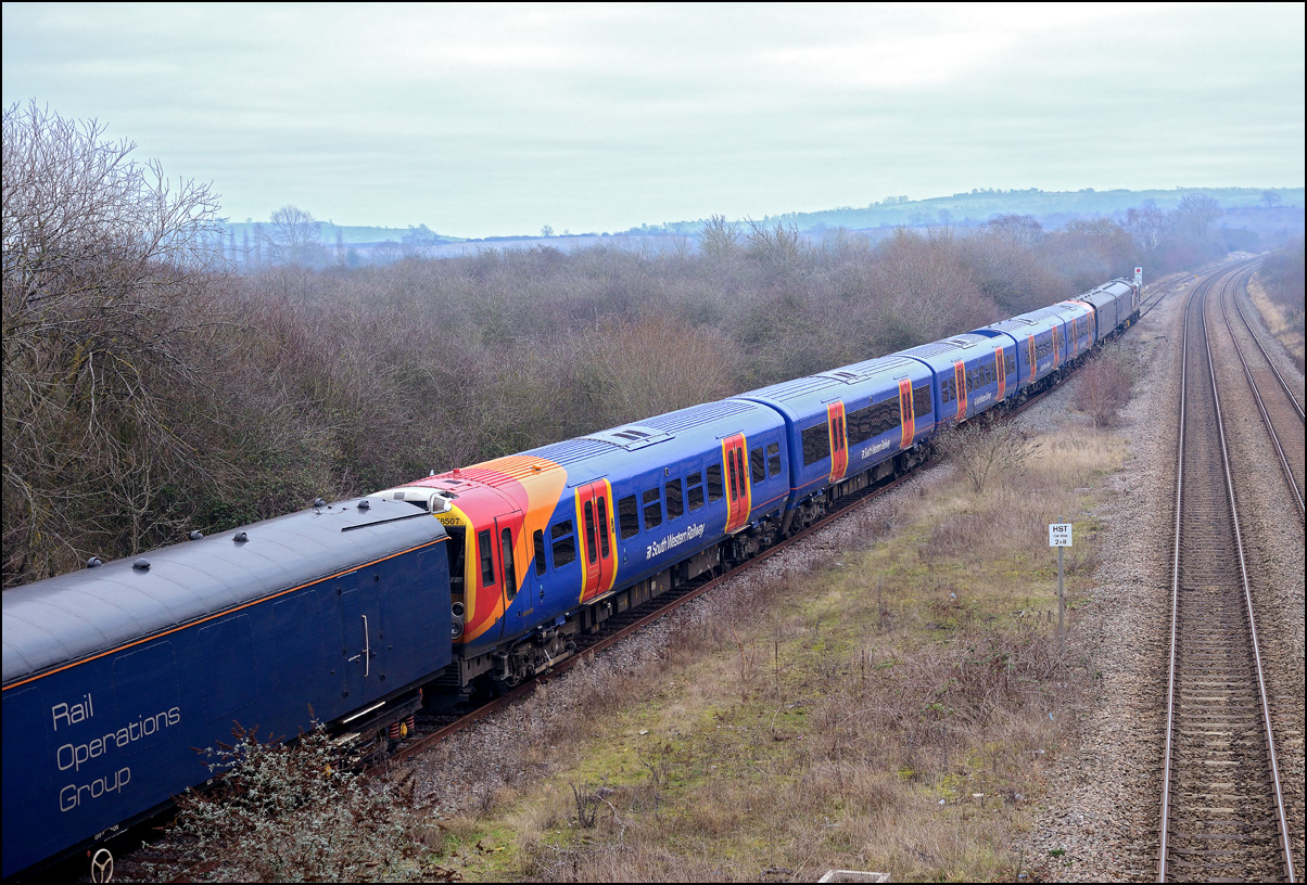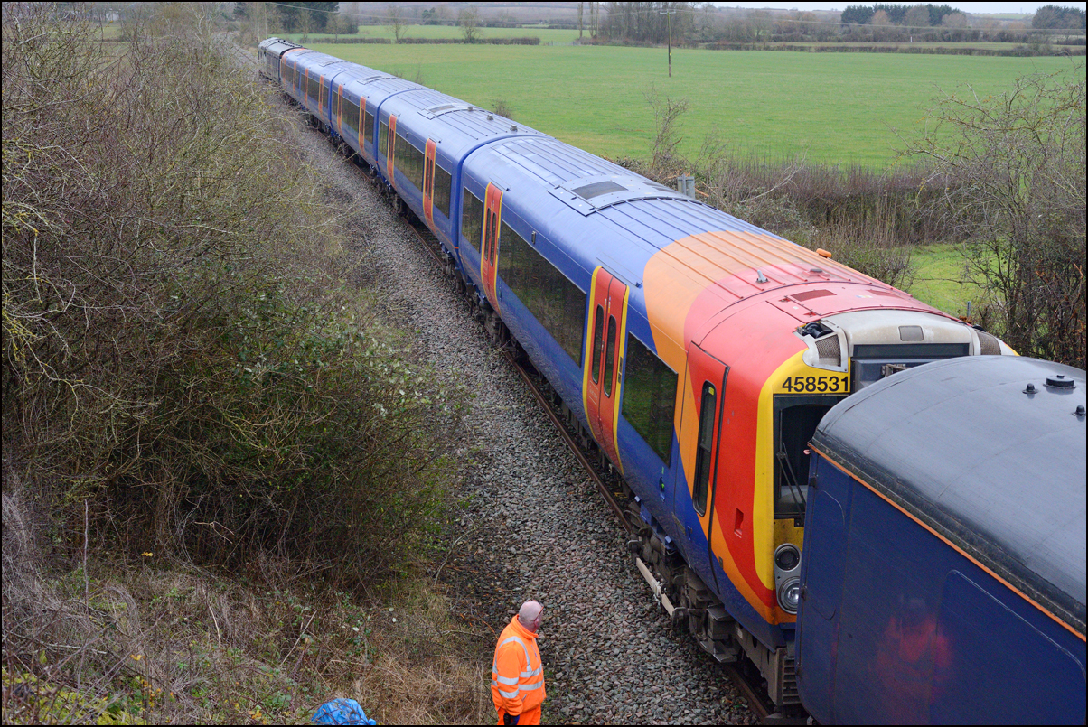 The third off-lease class 458 was taken for storage from Wimbledon Park Sidings to Long Marston on 18 February 2025. The barrier wagons ran to Wimbledon from Derby RTC during the previous morning topped and tailed with 37510 and 376901 which then worked 7Q99 on Tuesday with 458532The. It was a sunny morning which isn't an easy prospect for a picture at around 10.00 but a bit of late running helped with lifting most of the shadows as the train approached the roadbridge at its journey's end. There was still a lot of early mist around which was accentuated by the backlighting. The land just beyond the bridge has recently seen some work to stabilise the ground following a landslip last year. |