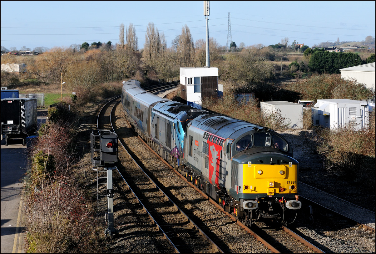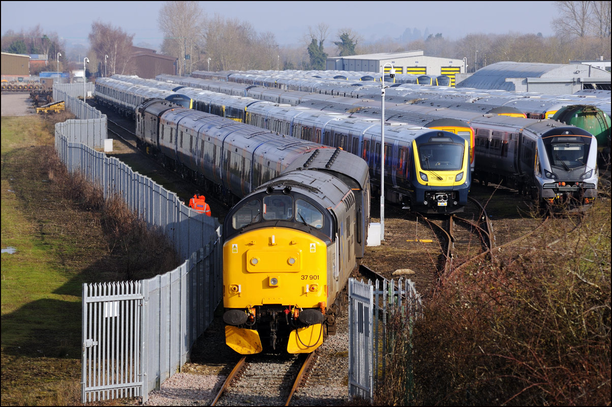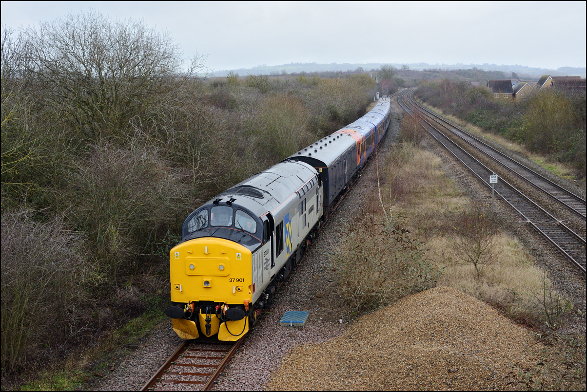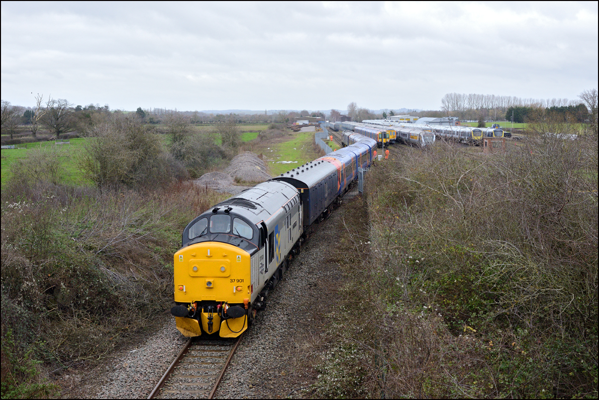 I took another view of 37901, this time as it ran into Long Marston on 10 December 2024. The train ran into road 1 as there was some shunting to do before the locomotives and barriers could leave and run to Derby RTC. |
