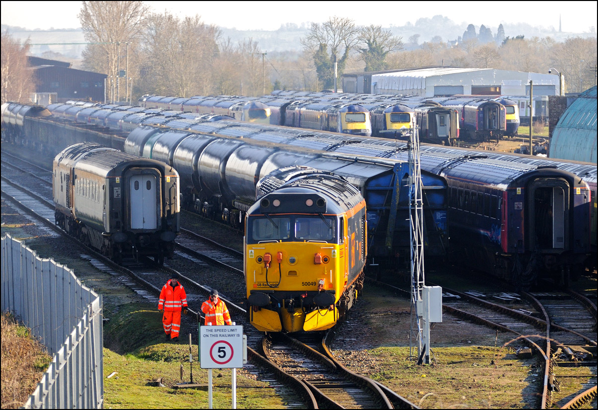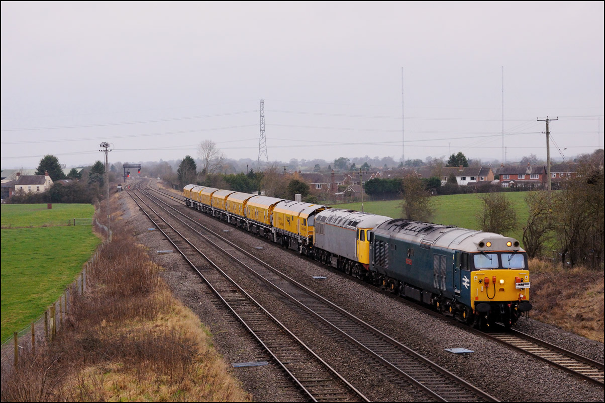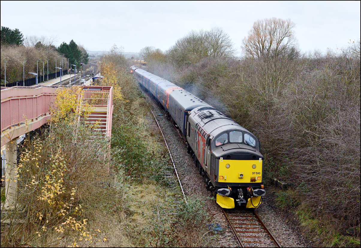 I took another view of 37901, this time as it ran into Long Marston on 10 December 2024. The train ran into road 1 as there was some shunting to do before the locomotives and barriers could leave and run to Derby RTC. |