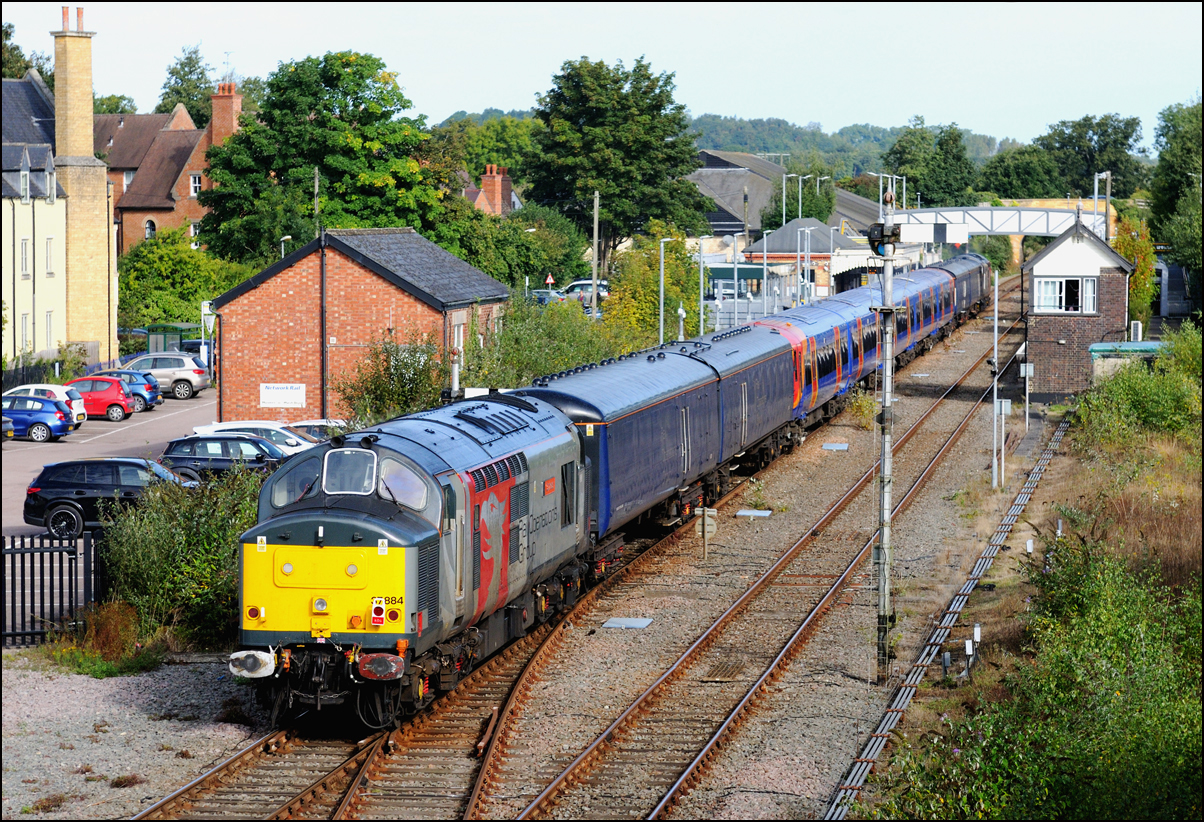 The better shot from the London Road bridge at Moreton-in-Marsh is arguably looking towards the station as the train goes away and on 13 September 2024 it was lucky that 5Q94 needed 4 barriers for brake force as the length of the train meant that I could cross the road to take this shot with 37884 on the back of the consist with 458354 more clearly visible. |