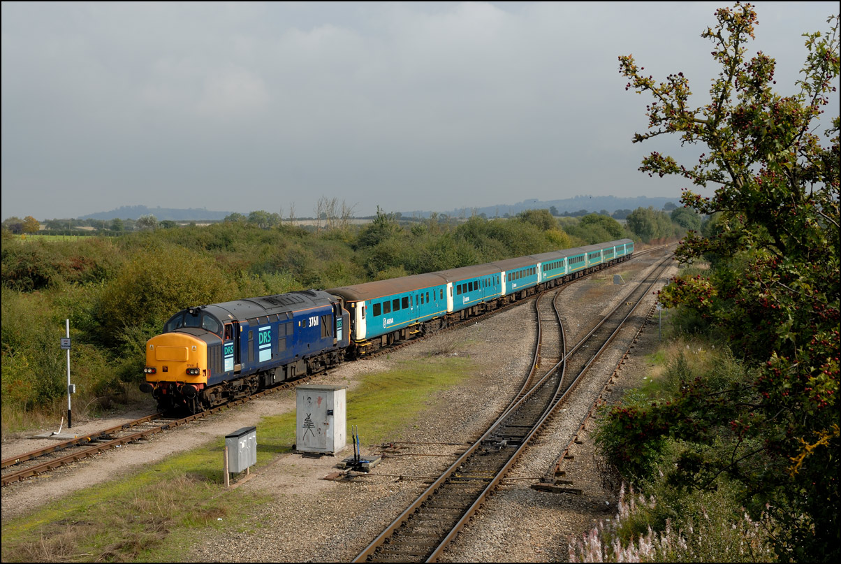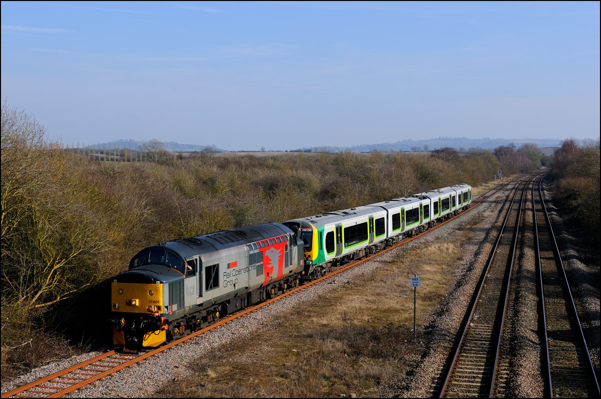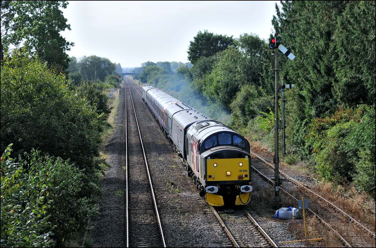 Yet another class of EMU was taken to Long Marston on 13 September 2024 when Juniper unit 458354 went there from Wimbledon Park CSD sandwiched between 37510, four barriers and 37884. The best bit was that 5Q94 was routed along the North Cotswold Line from Oxford to Honeybourne; a rare piece of line for locomotive-hauled trains. I wanted a photograph on this section in a location with some identity despite the fact that it would be backlit at around 09.45 so went to Moreton-in-Marsh. A preceding Great Western down service was a few minutes late which gave the chance of being blocked by an up passenger train but this cleared with 5 minutes to go. Here is 37510 going well under clear signals just after most of the shadows had cleared the line. |