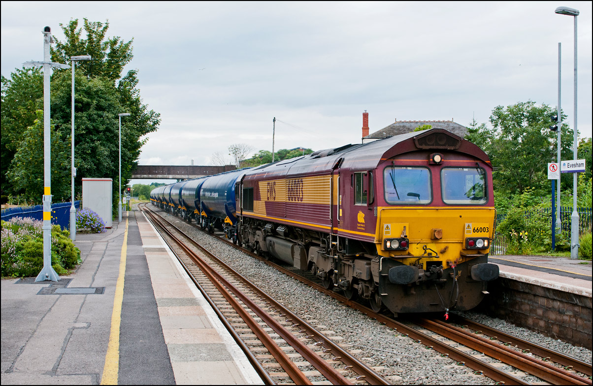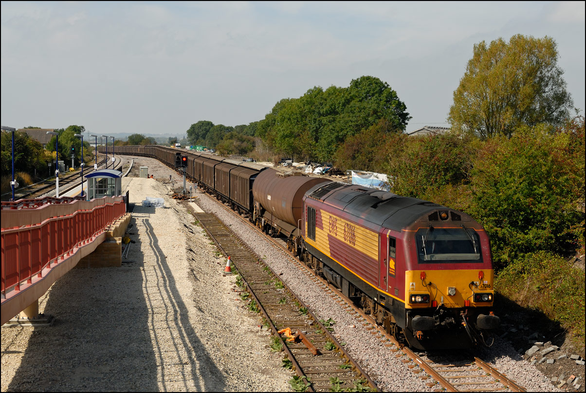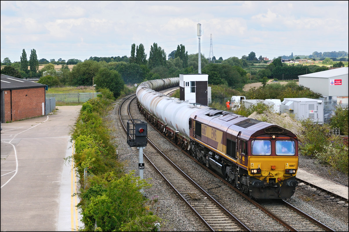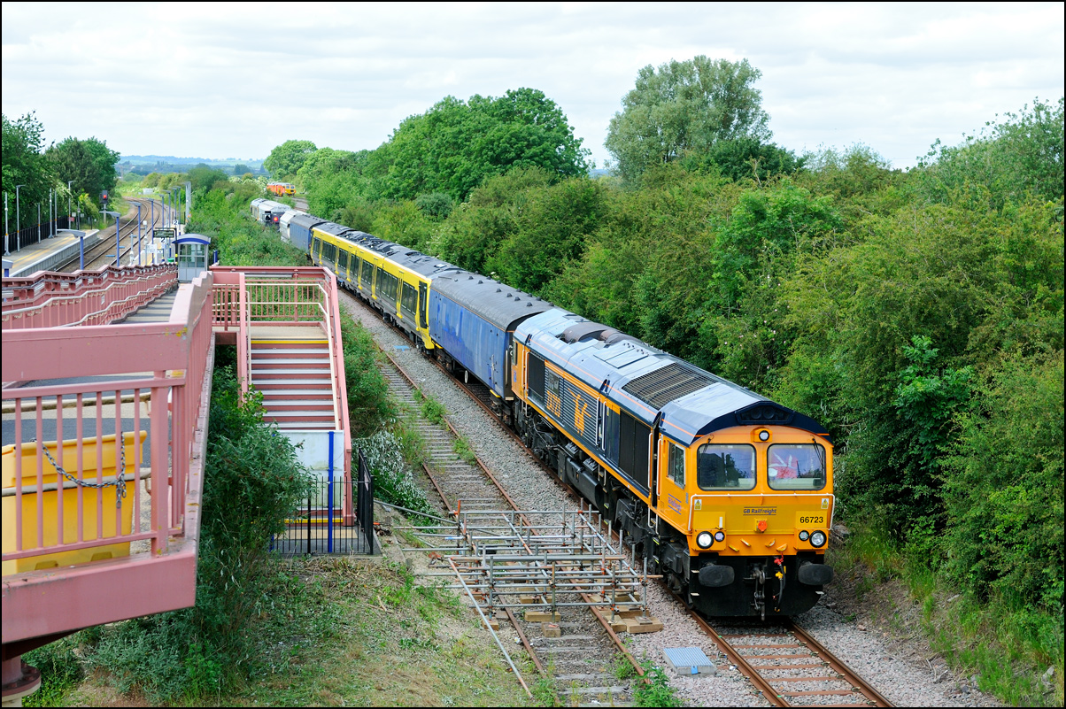 Once permission had been gained for 6Z36 to join the main line towards Worcester, the train set back to the junction and once the road had been set, ran forward into Honeybourne station before heading west to Evesham. For some reason, the crew member who operated the ground frame had climbed back aboard 37245 so had to dismount again once when in the platform and walk back to reset the points behind the train. |