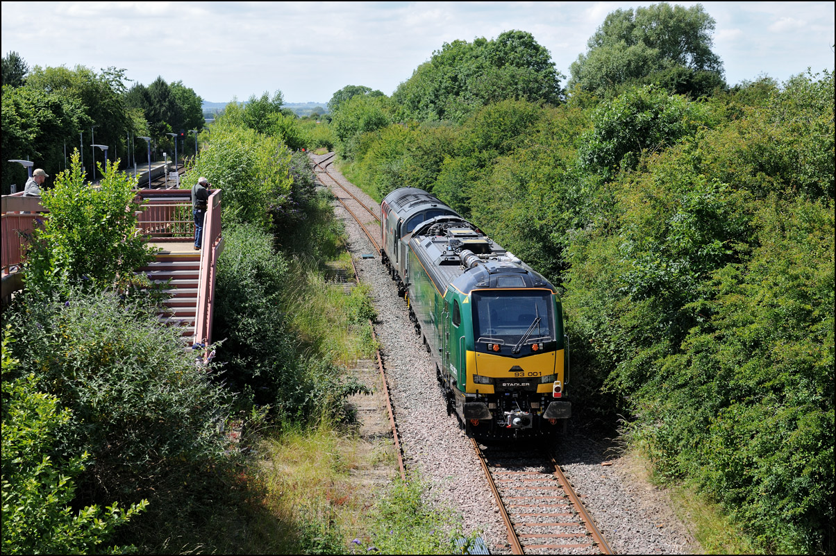 The Honeybourne end of the Long Marston branch is horribly overgrown with the only reasonable shot being head-on with a wide-angle lens; not ideal but there you go. The sun just cleared a small patch of cloud in time and allowed a nice bright image as 0Q26 approached the roadbridge on 21 June 2024. I took a separate picture of 93001 on the basis that there won't be another chance in the foreseeable future and another as 0Q26 slowed for the signal. |