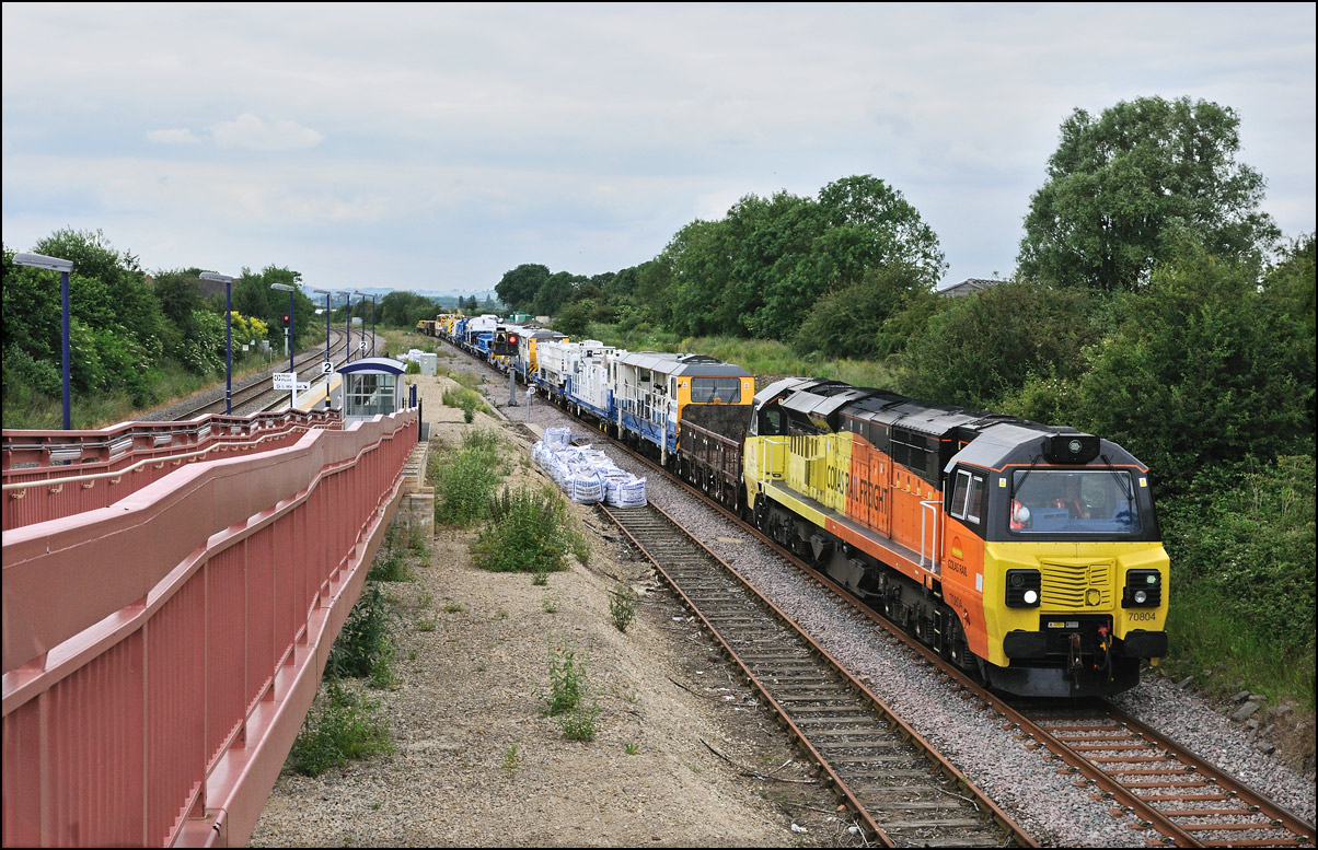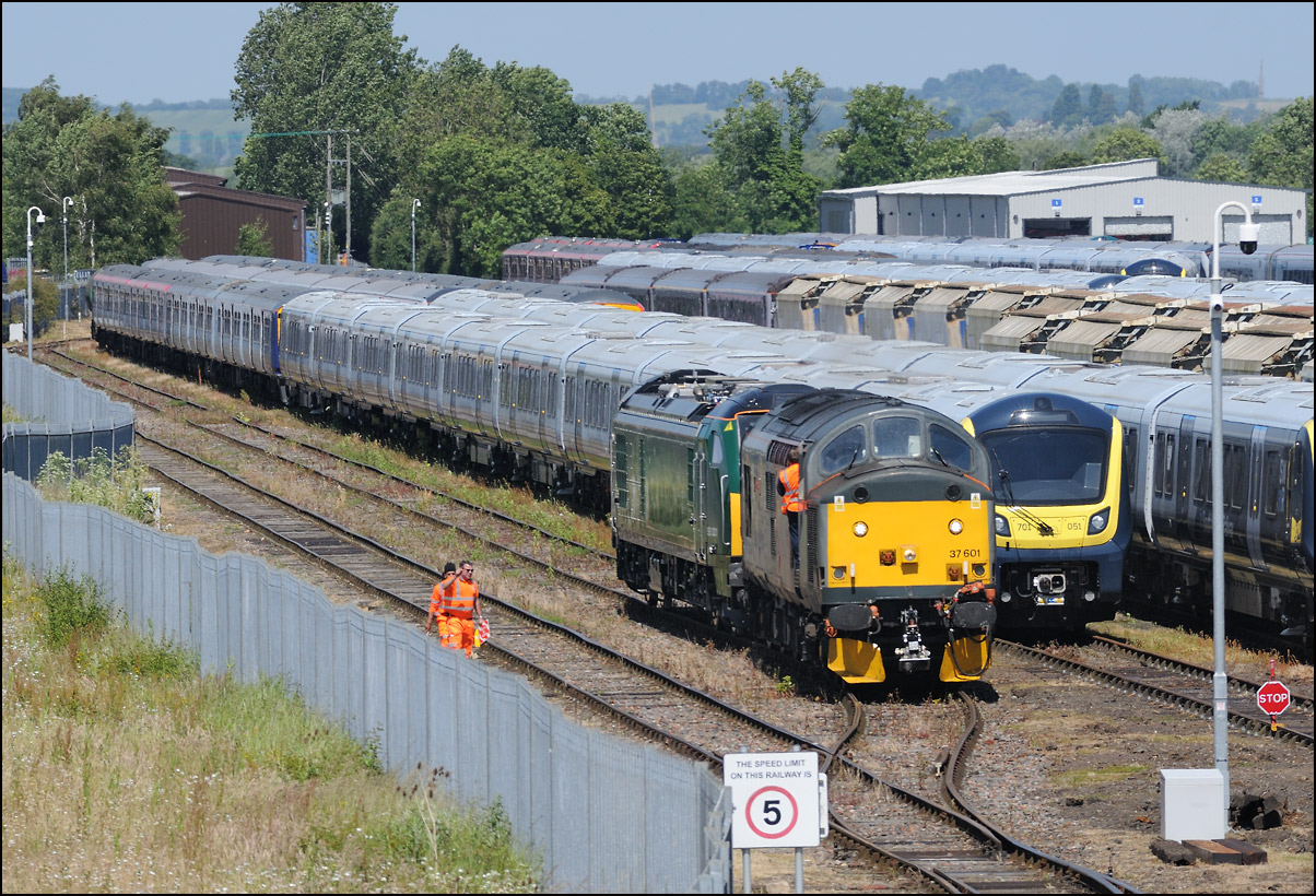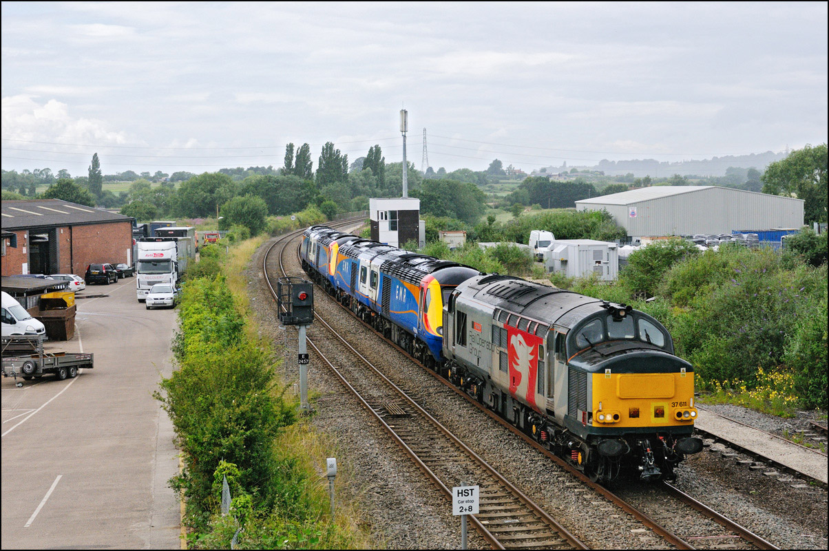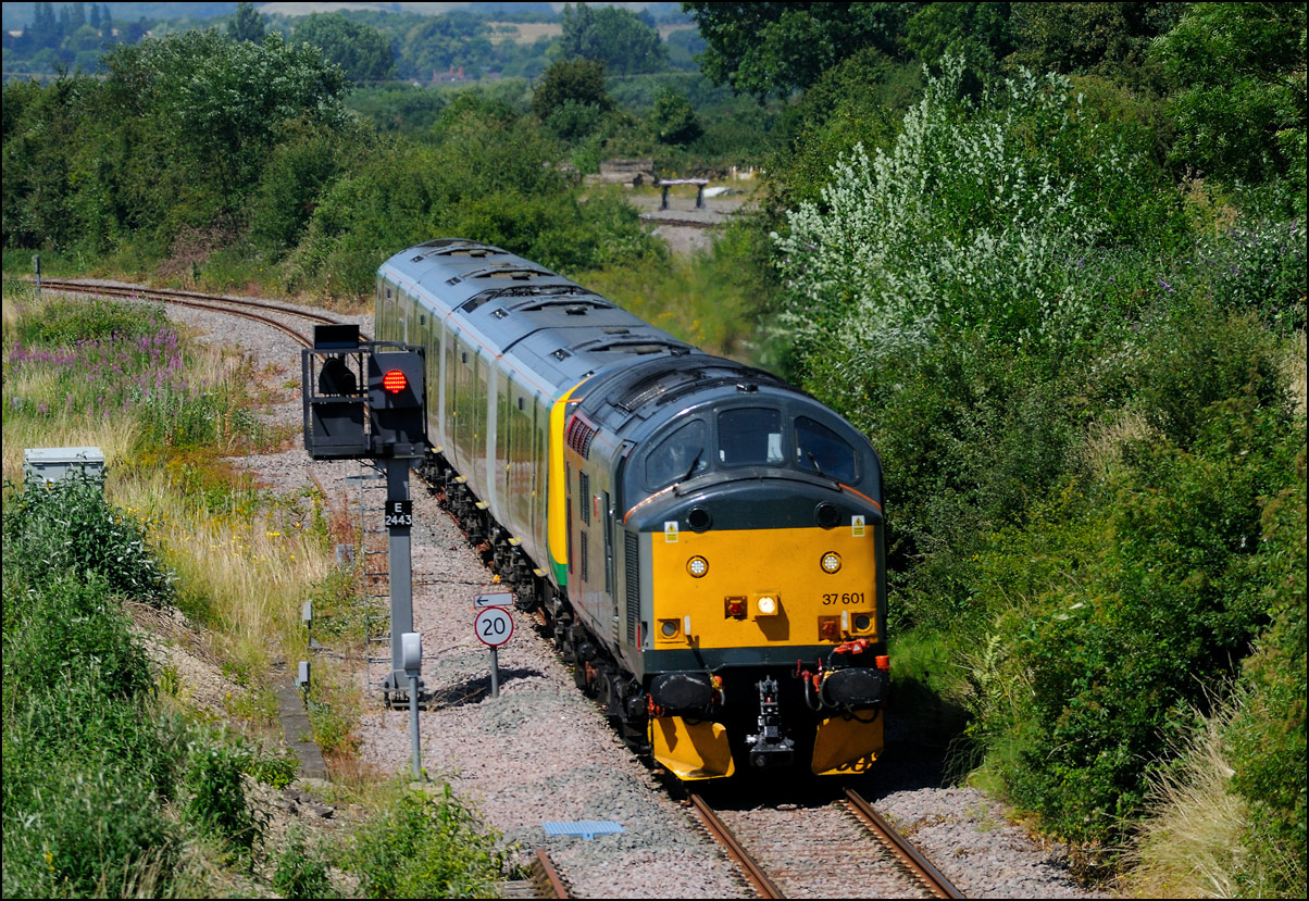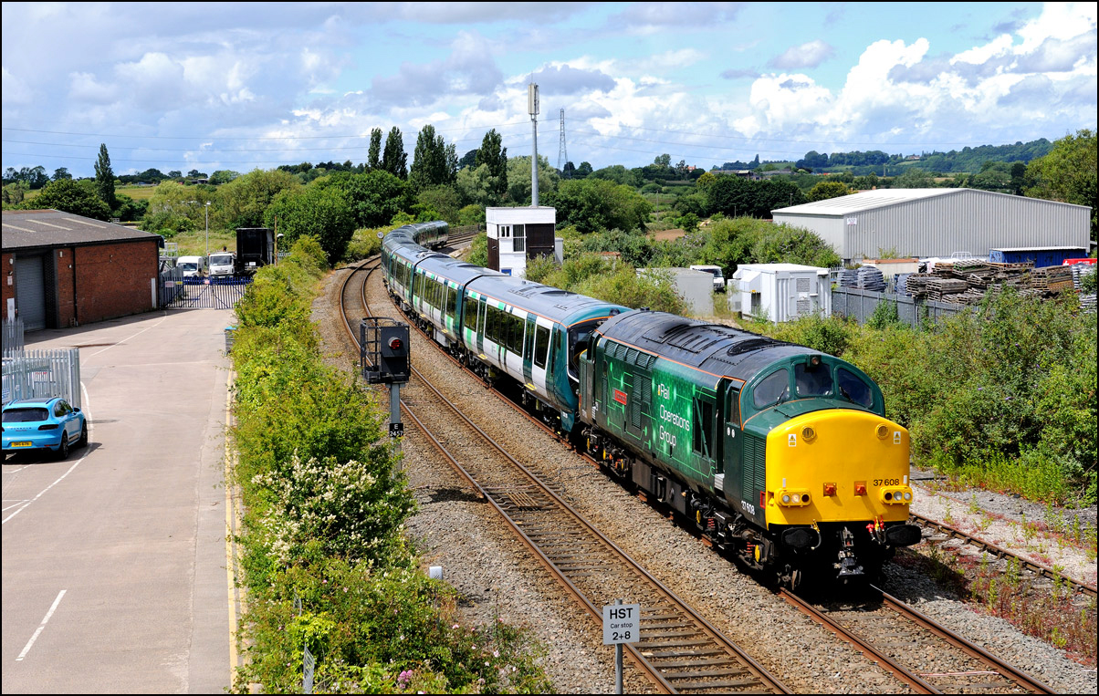 My main reason for being at Evesham on Saturday 15 June 2024 was to take a photograph of 37608 in its new green livery working 5Q94, the 07.23 Oxley Sidings to Long Marston taking Class 730 EMUs 730213 and 730226 for storage. The train should have passed here at 10.15 and given the weather at the time I wasn't going to bother but following a fester in the siding at Kings Norton OTP because of a brake problem between the locomotive and the units, it was 184 minutes late. This gave a chance for the conditions to improve and once 5Q94 had reached Stoke Works Junction I went to Evesham in the hope that they would be at Worcester early enough to pick up some time. It was unfortunate although not surprising that a GWR service 1P23 from Great Malvern was late enough to scupper the chances of that. This wasn't an entirely bad thing as clear patches of sky were developing and as 37608 appeared in the distance the sun came out. It was a bit windy but I took some video as 5Q94 passed the signalbox. I wish the driver had opened up about 5 seconds earlier... |