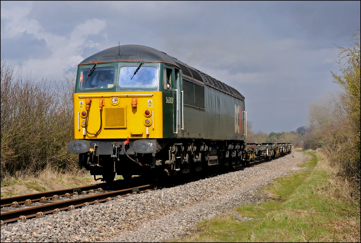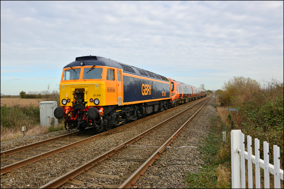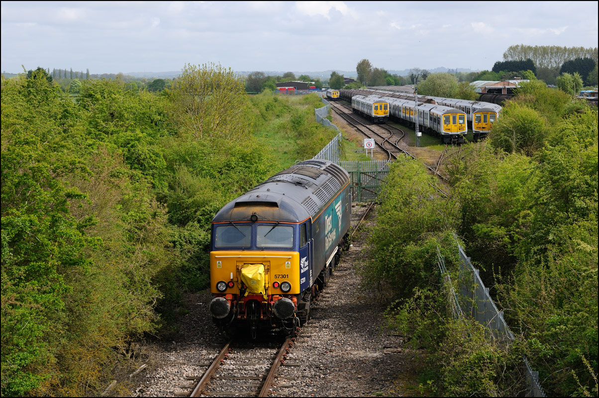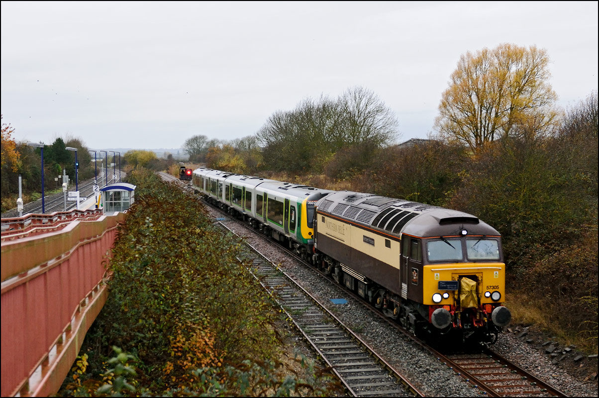 Although I had hoped that 57310 would lead 7Q57 from Tyseley to Long Marston on 11 November 2024 there was a chance for a reasonable shot of as the train went away towards Honeybourne North Junction. This locomotive used to be operated by Virgin and carried an identical livery to that seen here on 57305 at Whitacre Junction and later in its career a yellow infrastructure department colour scheme as seen here with 6M40 in Hatton DGL on 3 April 2014. |