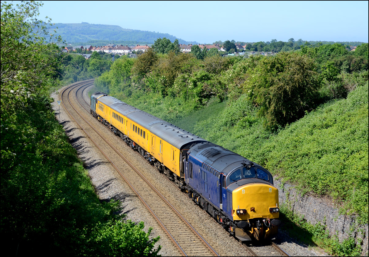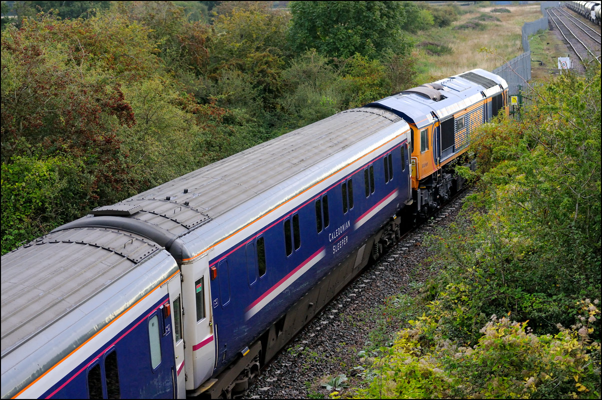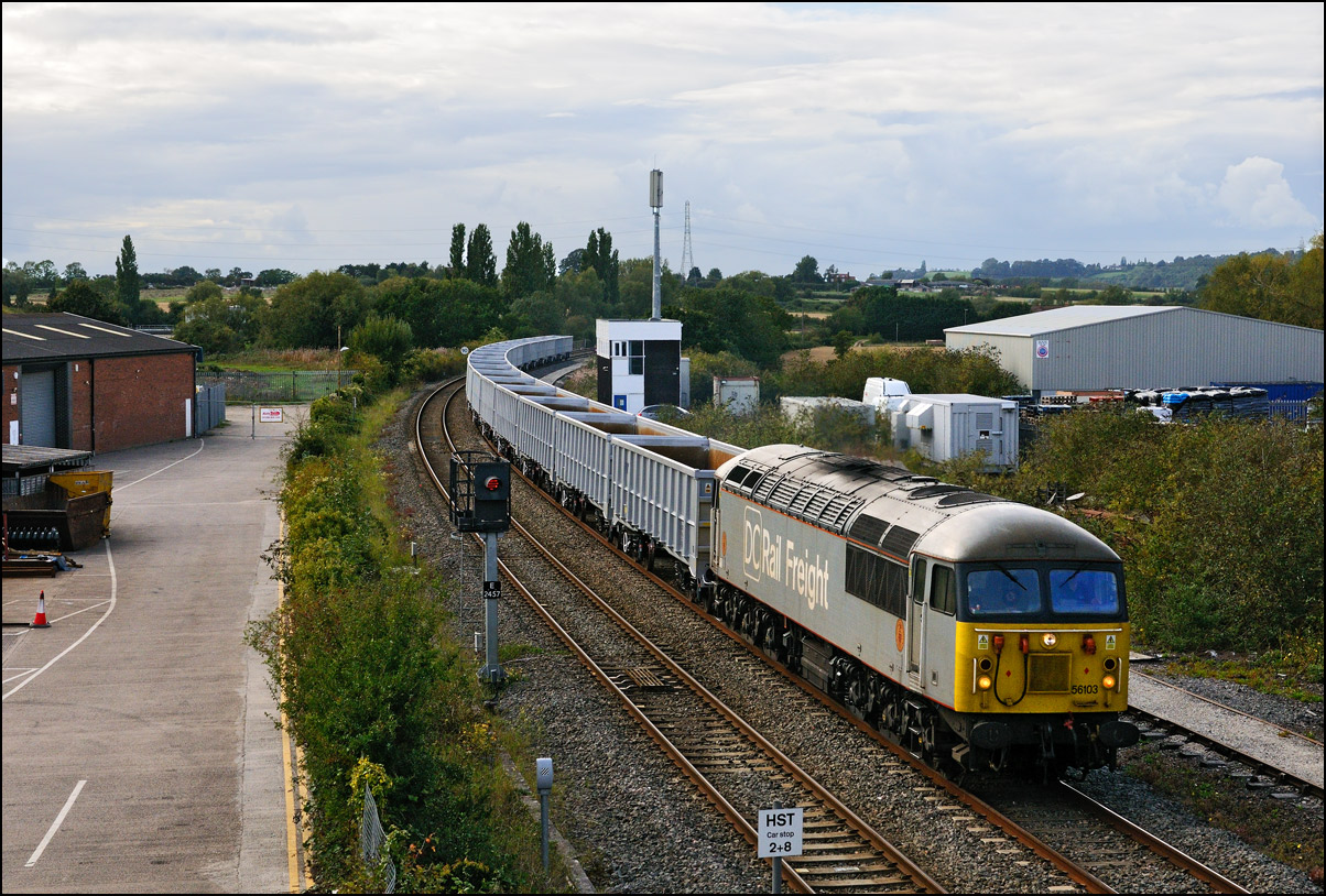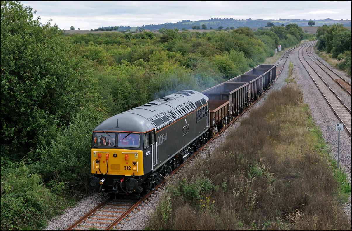 Although I had hoped that 57310 would lead 7Q57 from Tyseley to Long Marston on 11 November 2024 there was a chance for a reasonable shot of as the train went away towards Honeybourne North Junction. This locomotive used to be operated by Virgin and carried an identical livery to that seen here on 57305 at Whitacre Junction and later in its career a yellow infrastructure department colour scheme as seen here with 6M40 in Hatton DGL on 3 April 2014. |