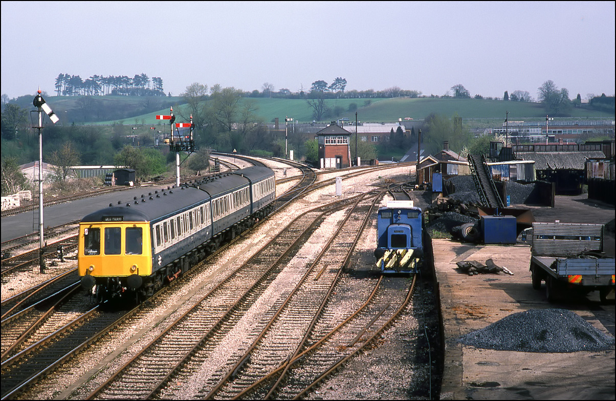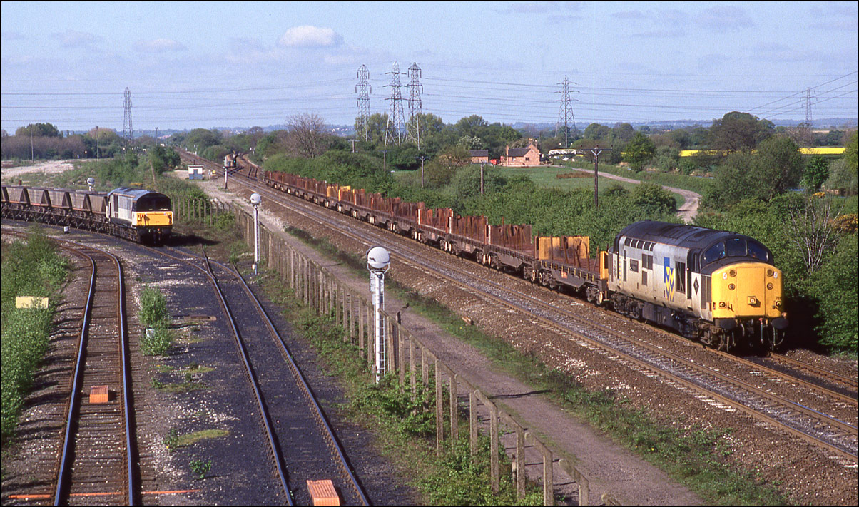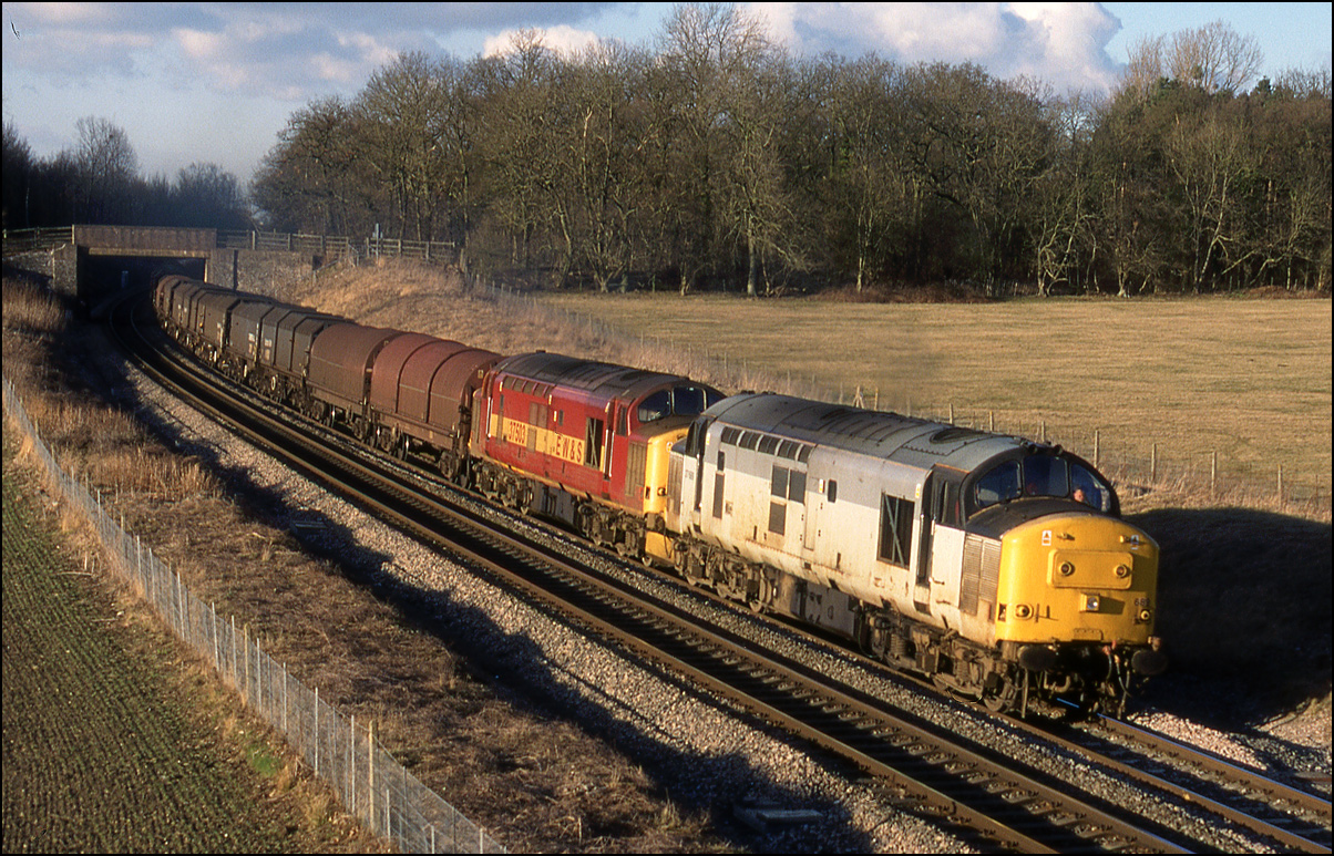 Moving forwards in time to 17 February 1992, this and the following 3 photographs show 37235 on a train heading for the MOD depot. Here, the train is approaching Evesham station after the single line token has been obtained from the signalbox in the background. This shot has seen considerable change in the intervening years, see this shot of 66027 in the same spot with a SERCO train on 1 April 2005. |