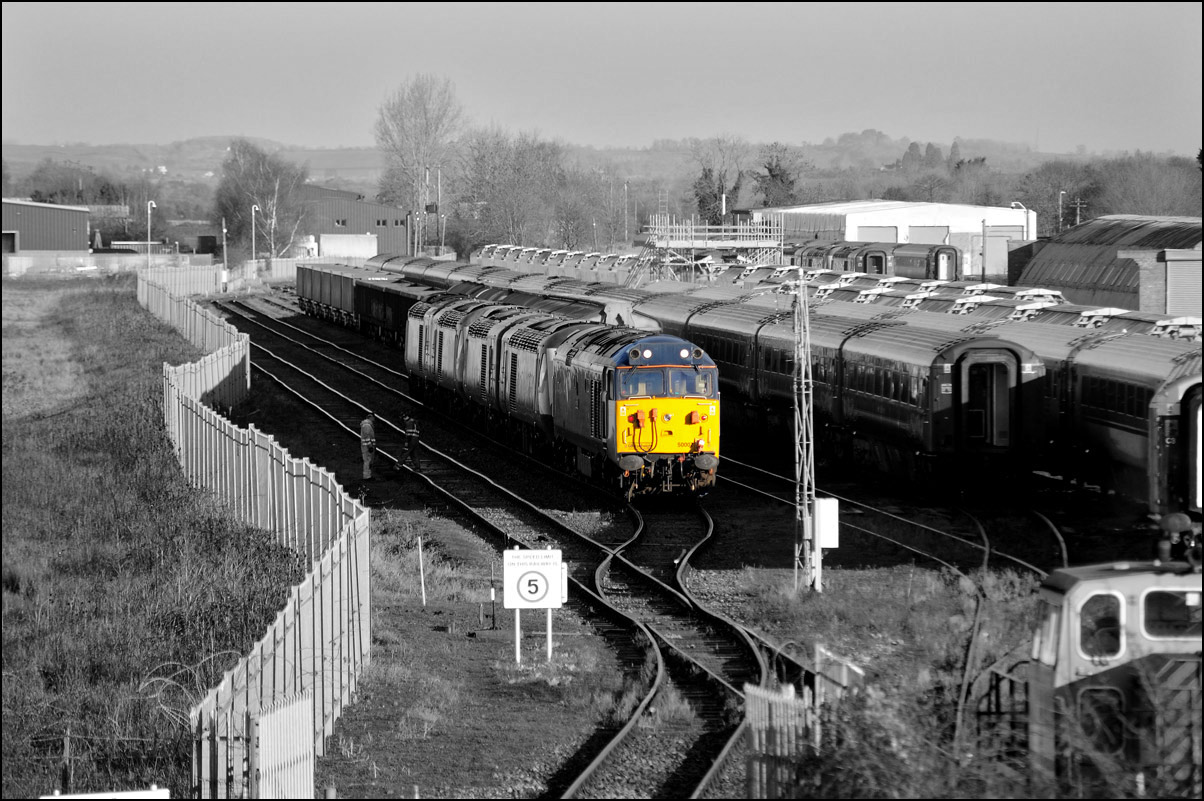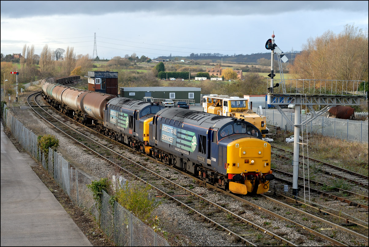 The final shot in this sequence, taken in virtual darkness, shows 37235 leaving the MOD depot with its train and heading back towards Honeybourne and Worcester. |