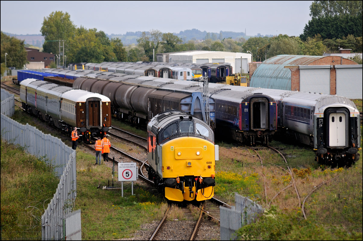Once authority to enter the yard had been given, 20905+20096 whistled their somewhat faded and pink HST stock into the exchange sidings from where 12081 will later move them to the storage area. |
