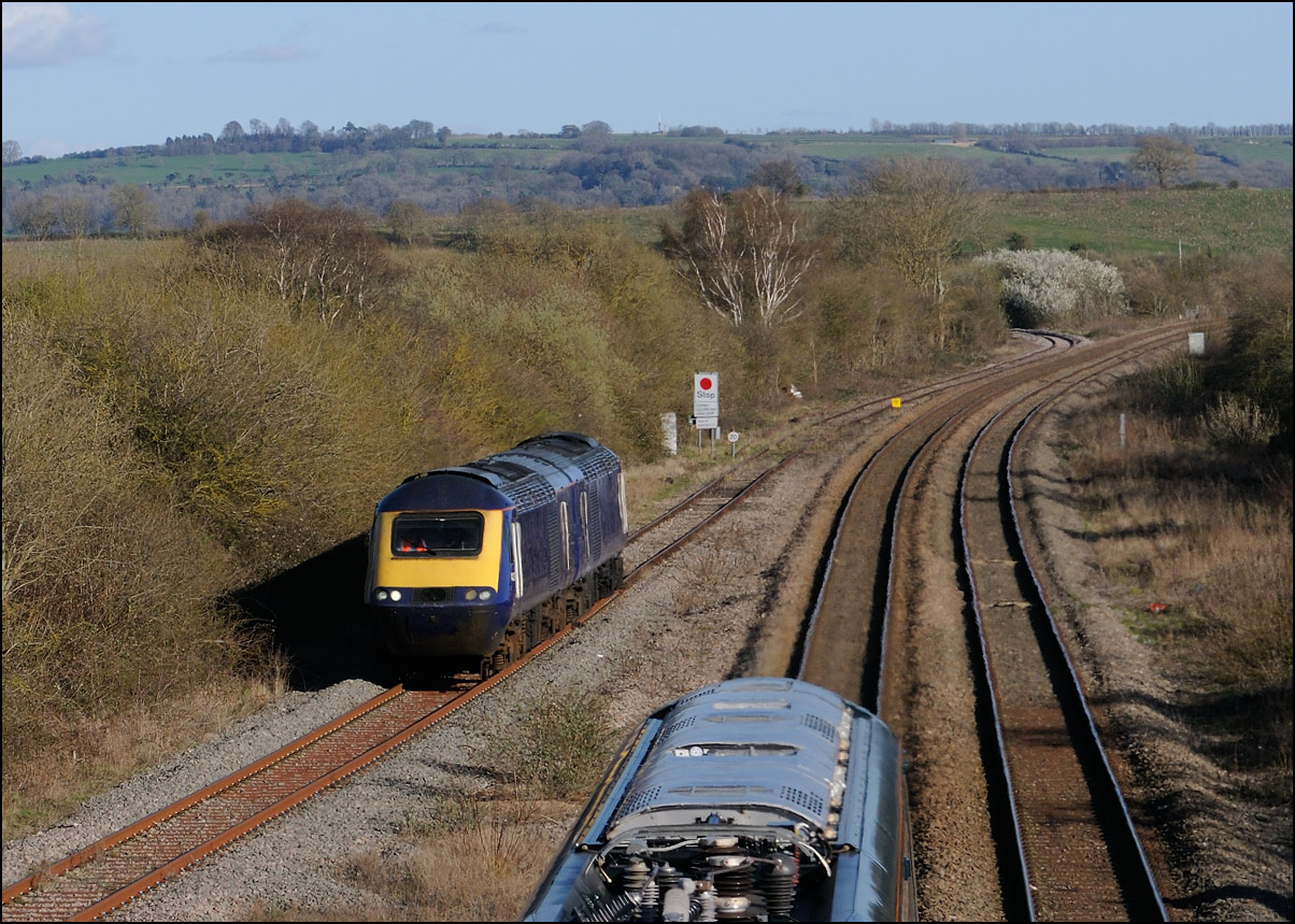 There were some crew training runs between Kings Norton, Long Marston and Worcester using Rail Adventure Power Cars 43465 + 43484 on 3 April 2025. I don't always bother with light engine moves but back-to-back PCs look marginally more interesting and I wanted to check if the Long Marston branch at Honeybourne was free at shadows on a sunny morning. The train, 0T37, ran close to right time but seemed to have been given far too long, 18 minutes, to get from Evesham to Honeybourne North Junction so made sure to arrive in plenty of time. Some 18 minutes before the booked time the pair of power cars crossed over onto the branch from the up main line. |